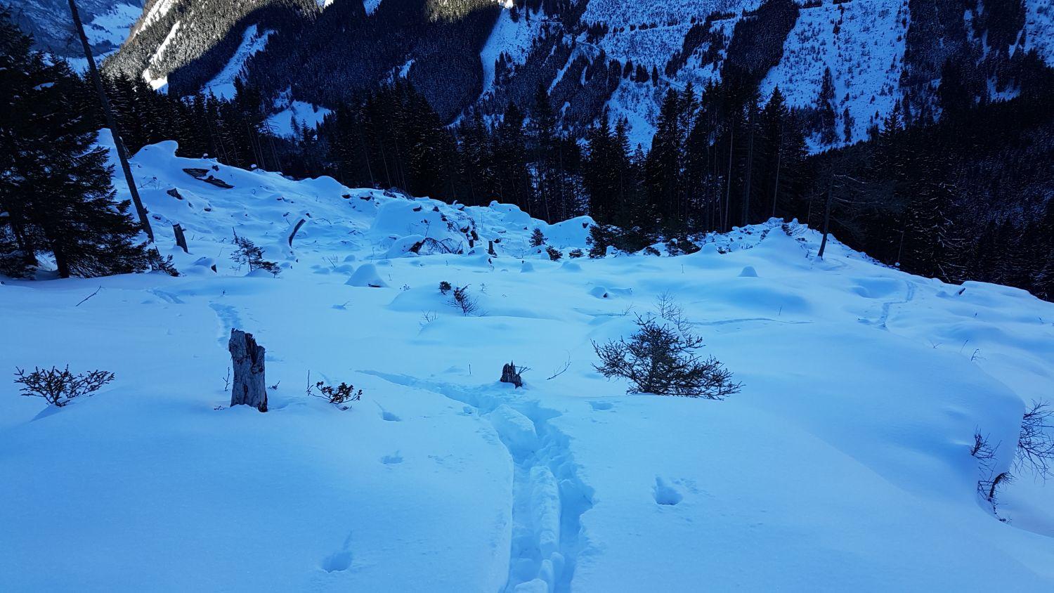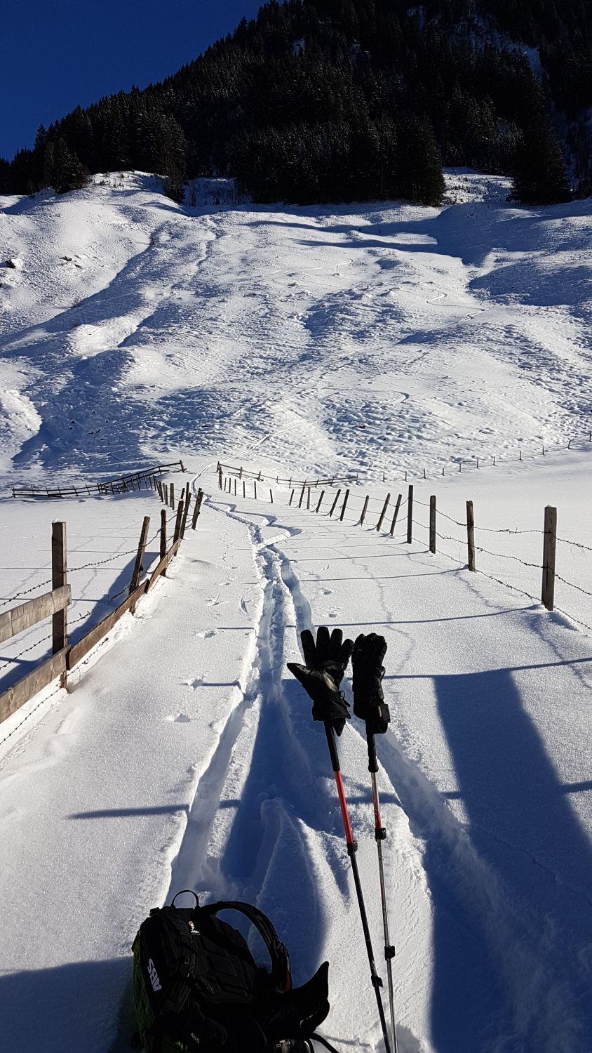 Im steilen Waldteil zwischen Embach Grund- und Riegeralm ist - vor allem herunter - das Tragen der Schier anzuraten (außer man will seine Schier einem Härtetest unterziehen und hernach entsorgen). Am besten entlang des Sommerweges aufsteigen, Für den Schlag hat es einfach zu wenig bzw. grundlosen Pulver.