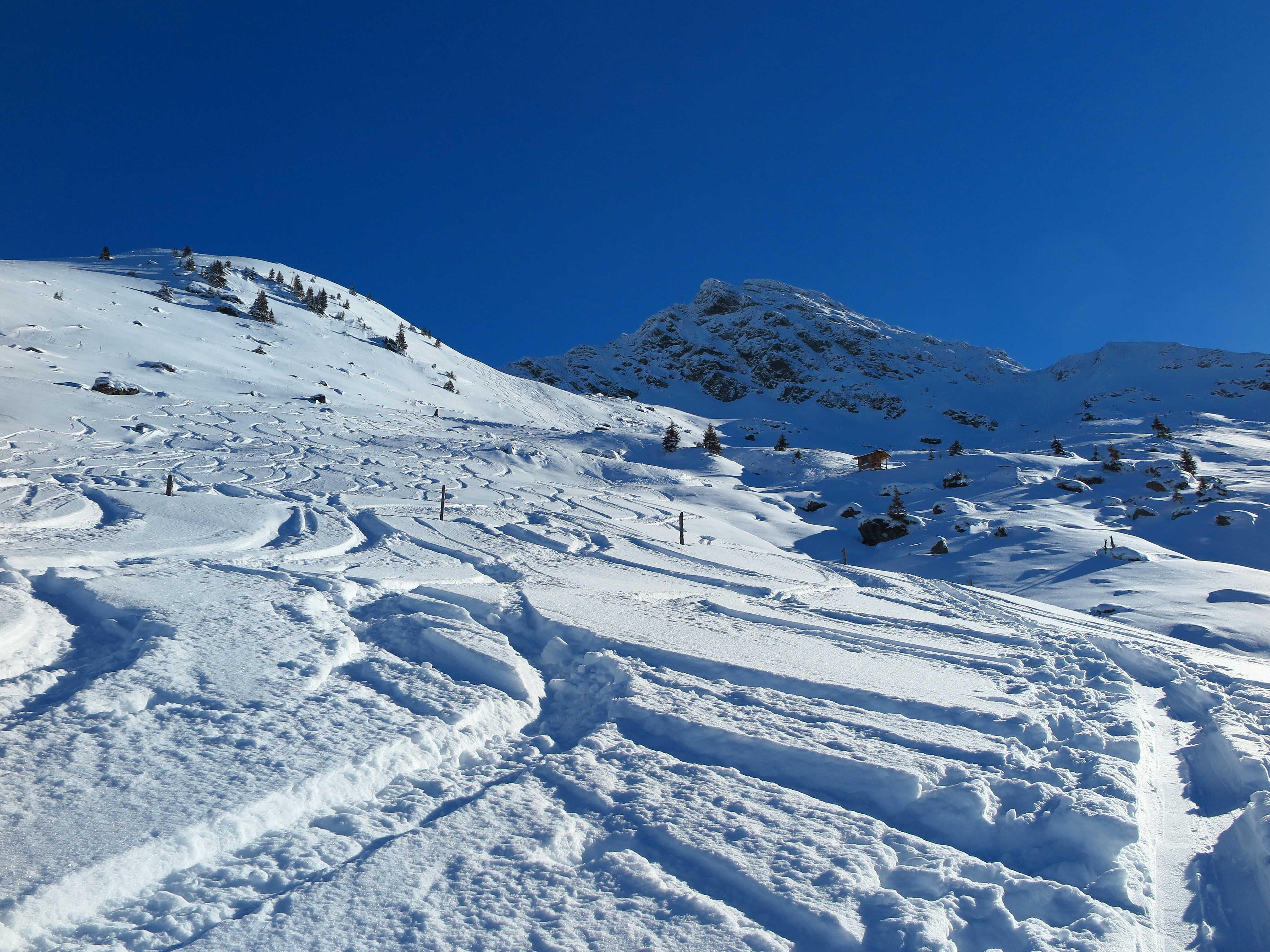 Schneelage: Genug Schnee für alle Touren; teilweise sind Hänge auch schon gut eingespurt z.B. Sonnspitz, Gebra u. Weisskopfkogel. In den W-Hängen ist die Schneedecke bzw. Unterlage manchmal recht unterschiedlich, an manchen Stellen ist Grundberührung nicht auszuschließen, mit etwas Umsicht ist aber alles gut fahrbar.