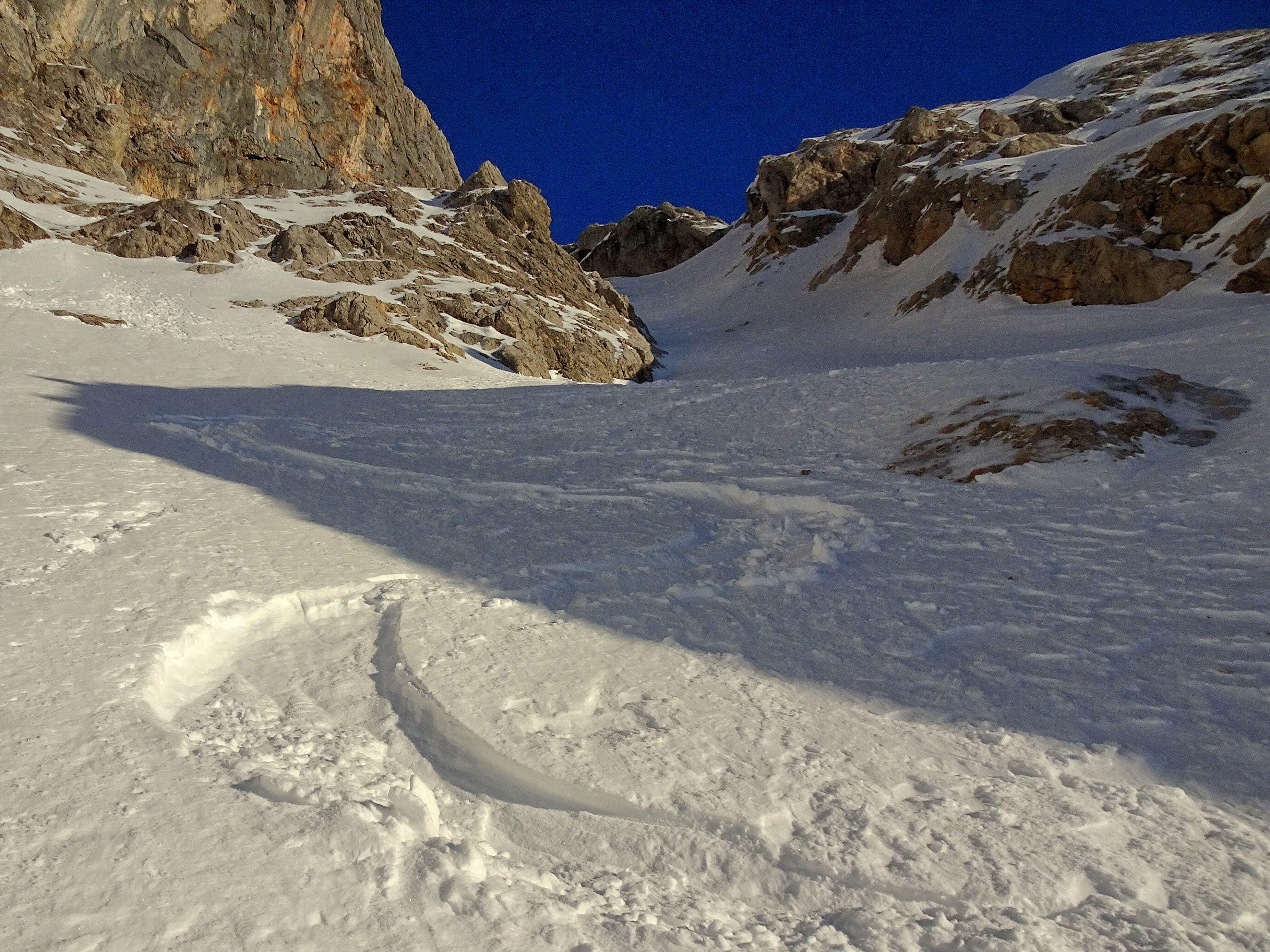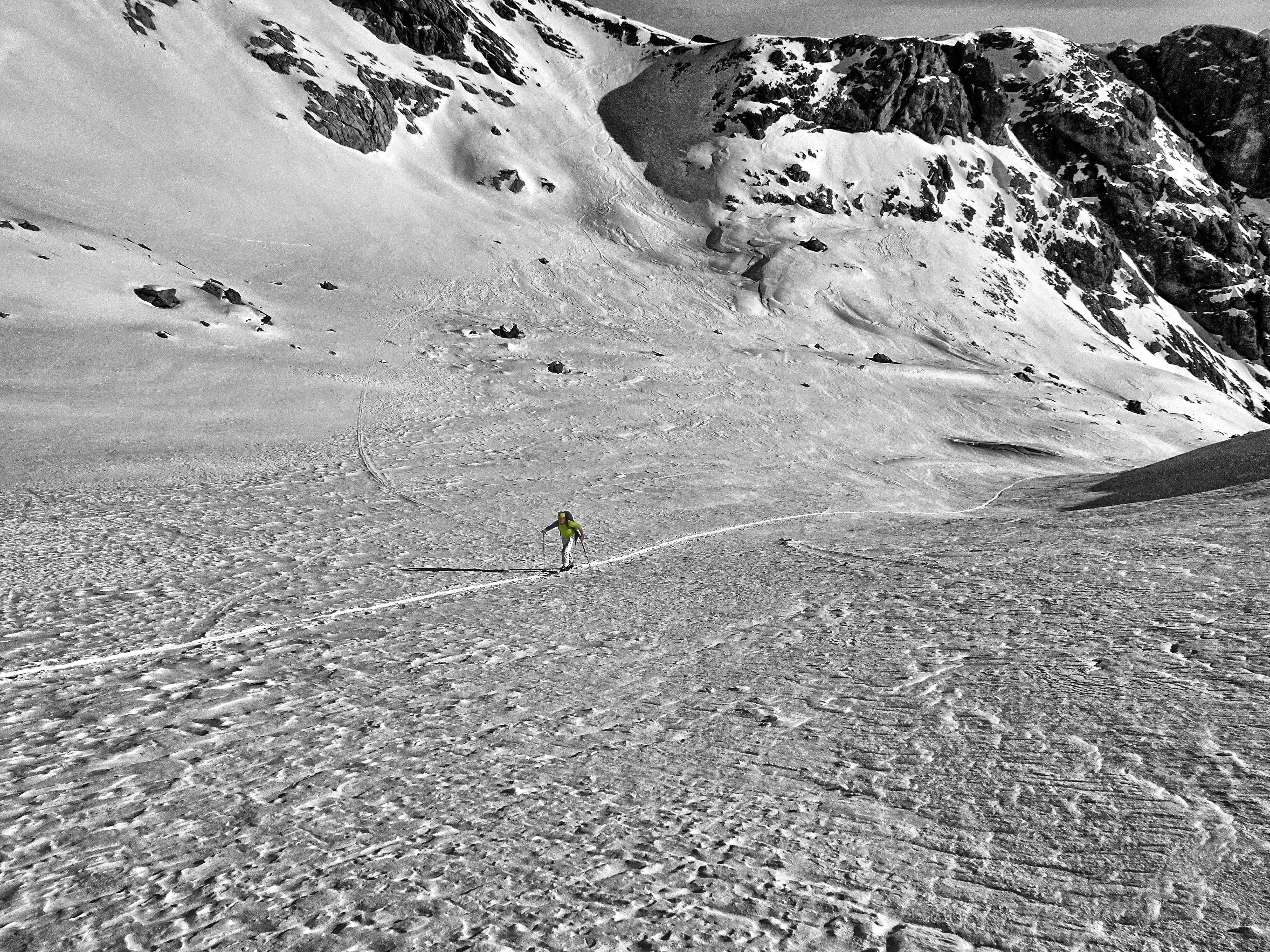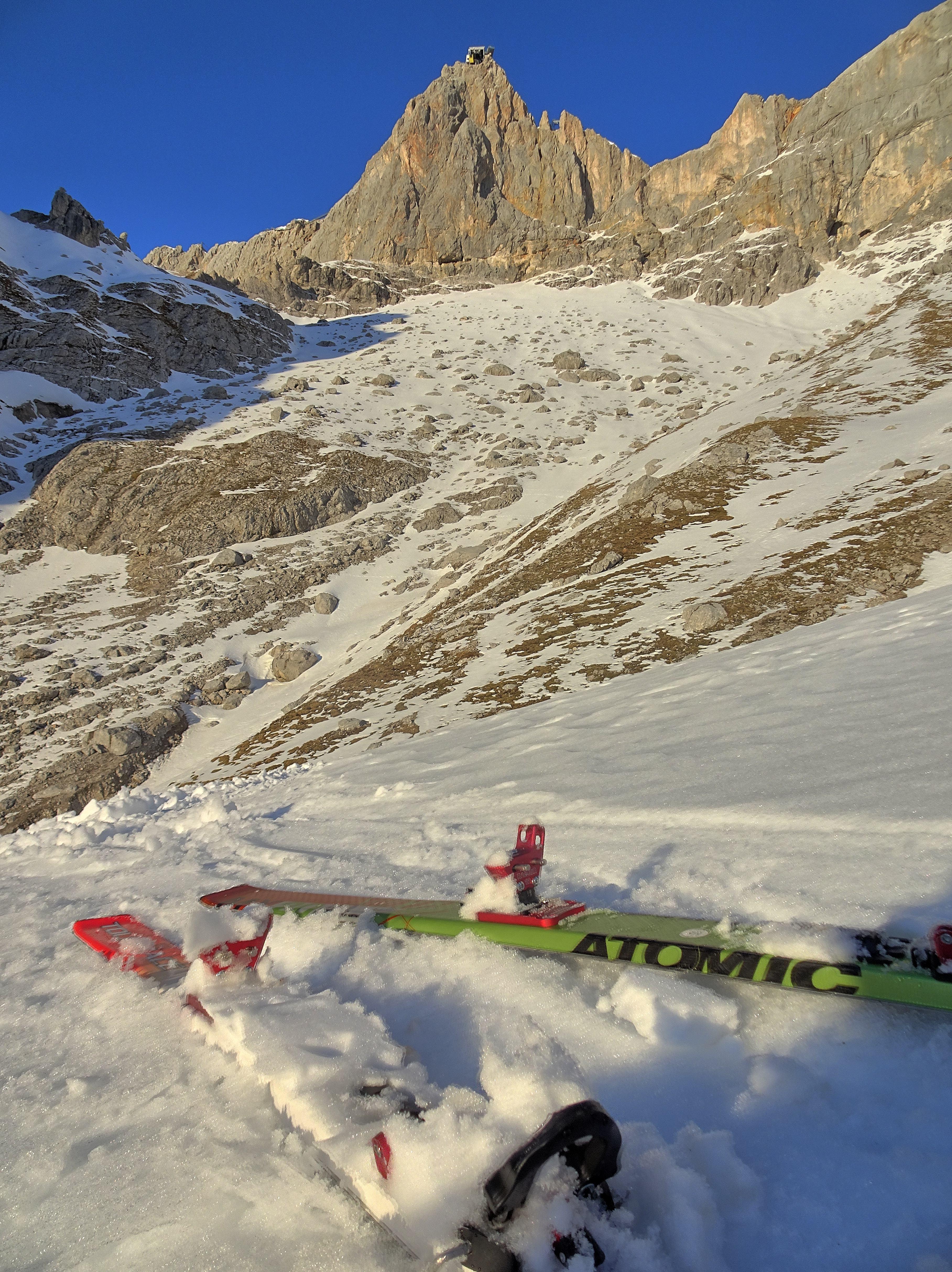 Wem es nicht zu anstrengend ist, die Schi ein bisschen rauf und runter zu tragen, auf den warten auf über 2100m Seehöhe hervorragende und einsame Tourenbedingungen. Die Gondel hat nämlich Revision ...