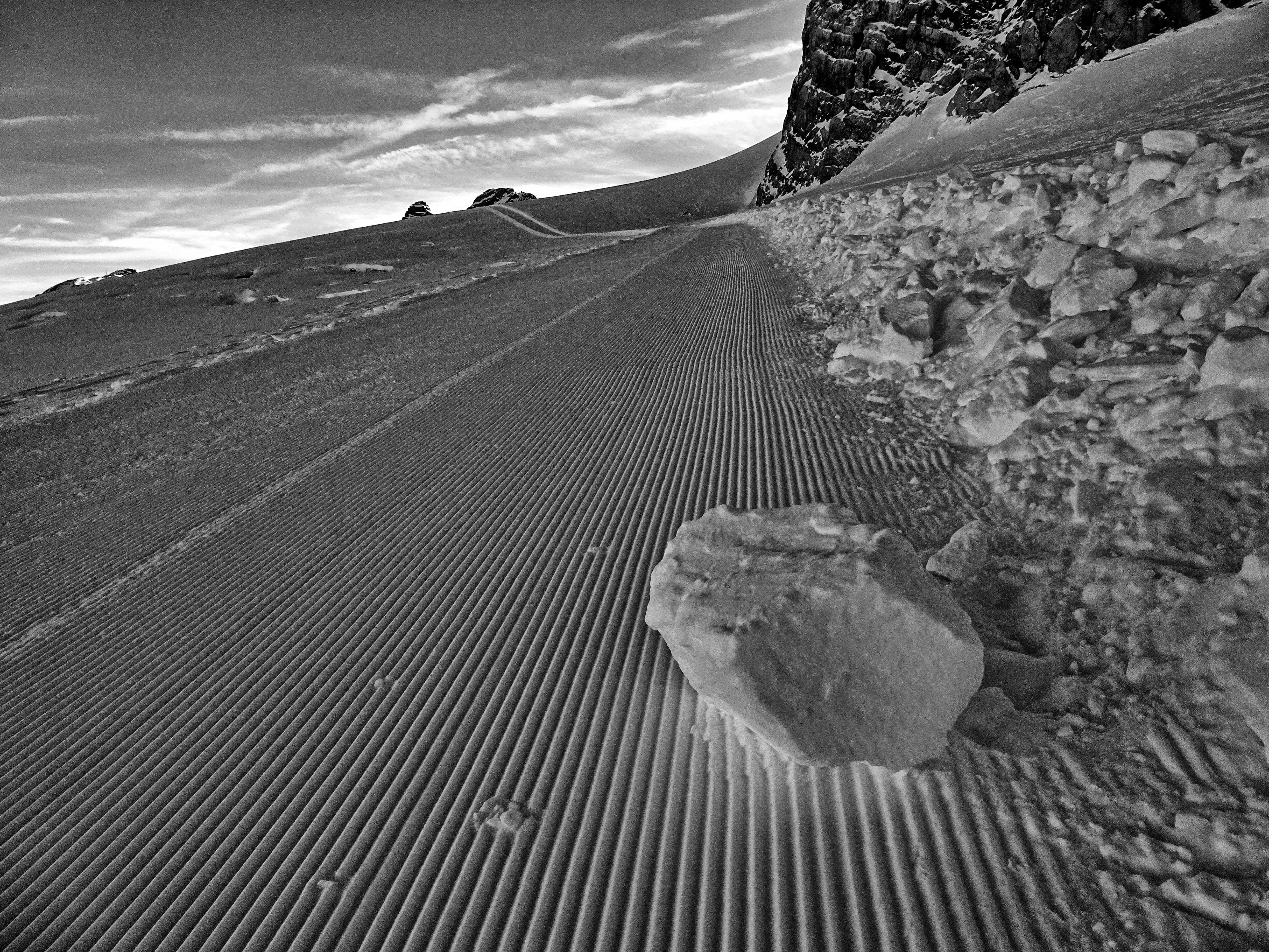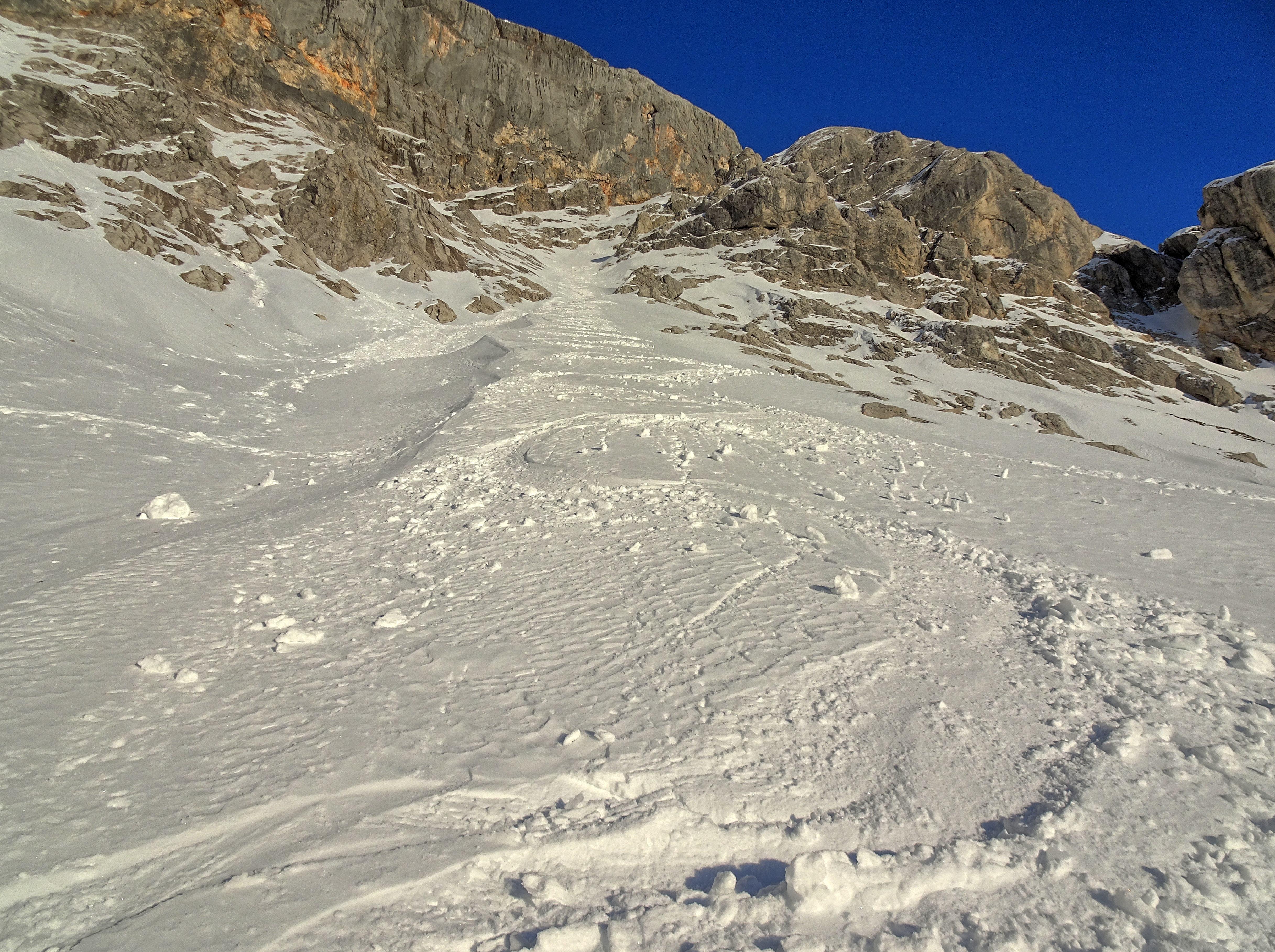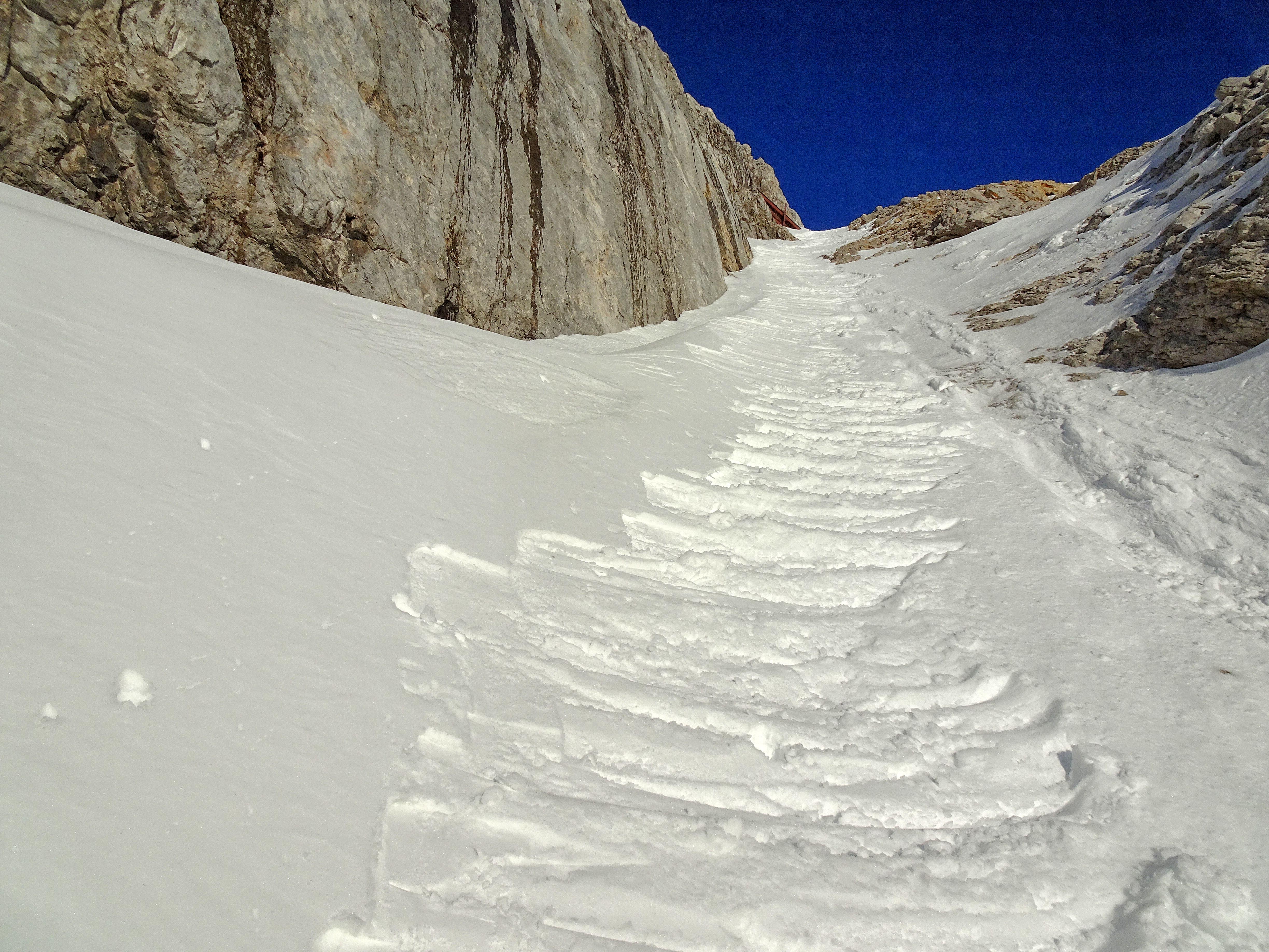 Schnee: windgepresster Pulver (schattseitig), harter Harschdeckel, Eis, (nasser) Firn