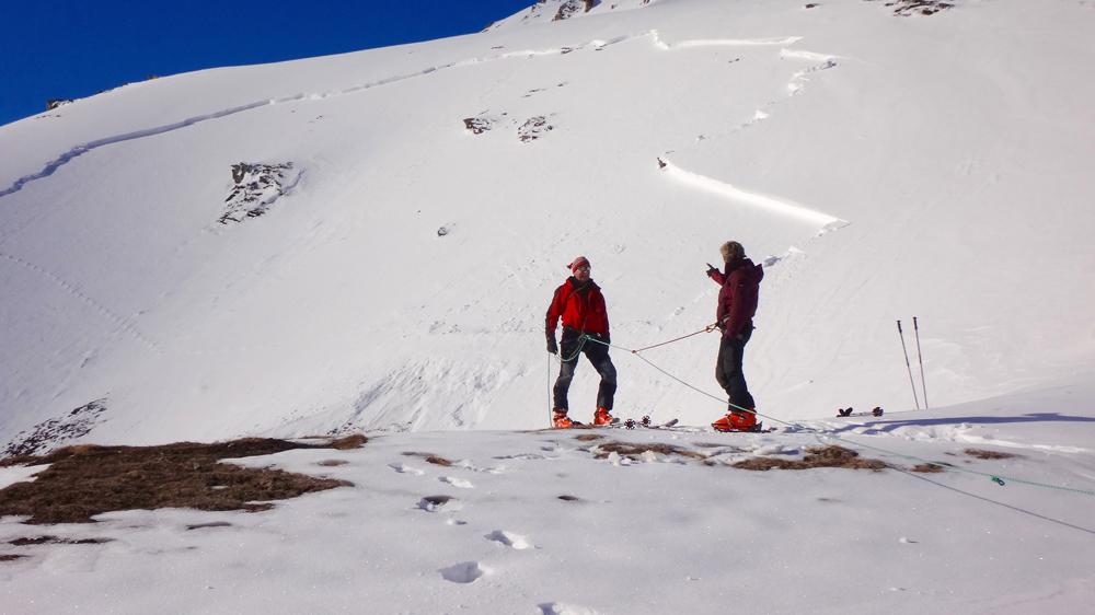 Südflanke- gute Verhältnisse, ein durchgehend schmales Schneeband leitet durch den Ausstieg bzw die Einfahrt.