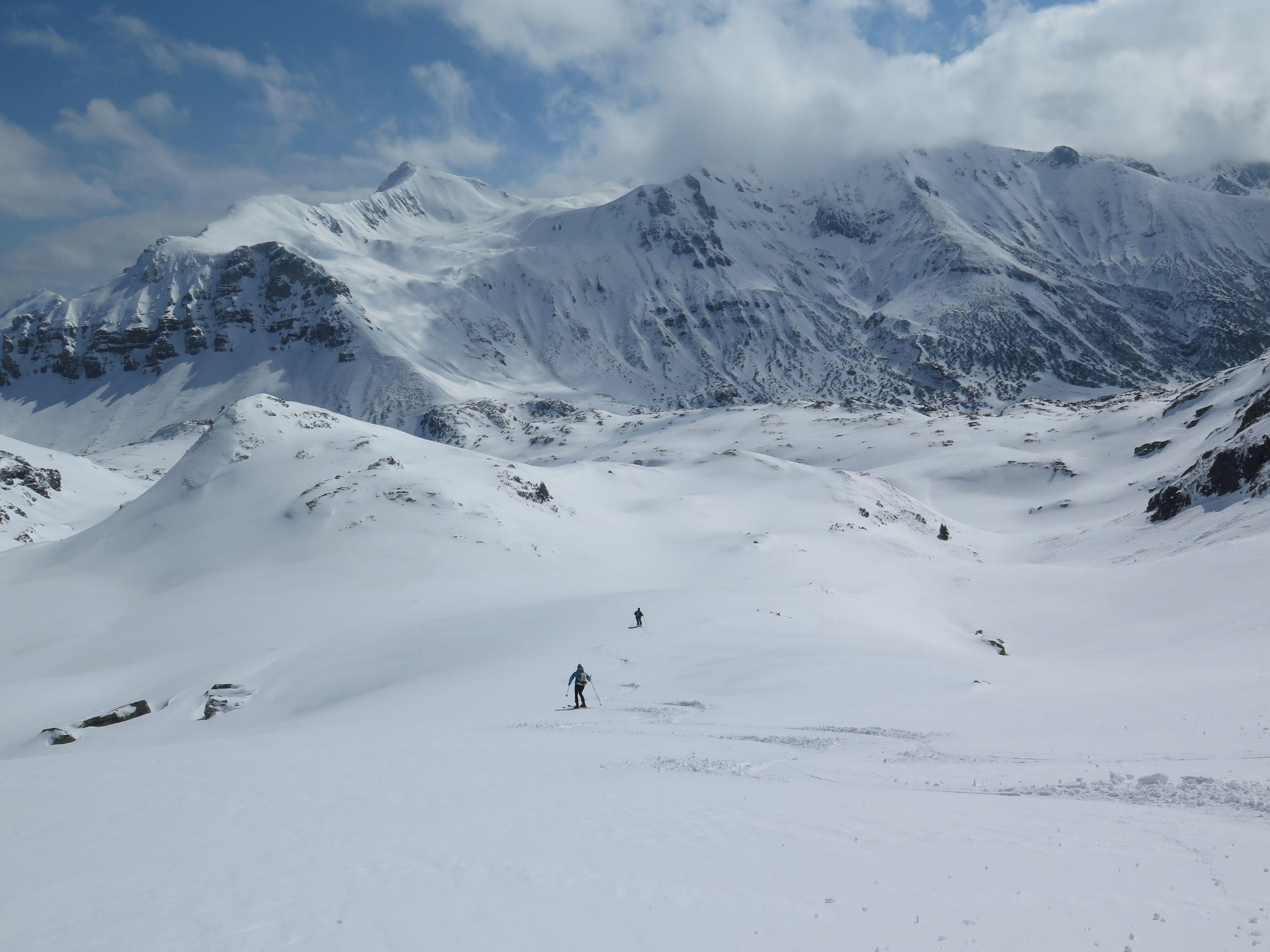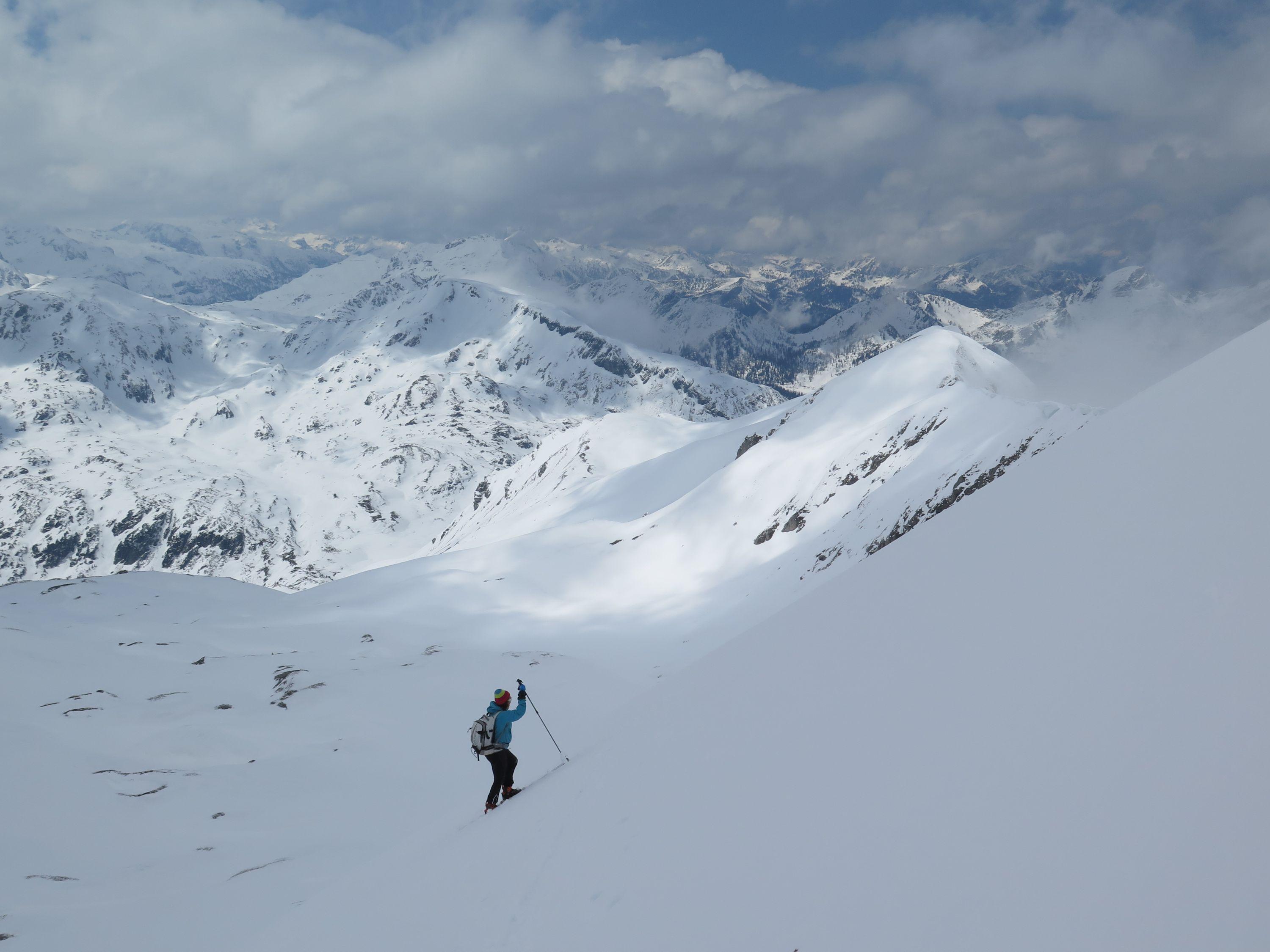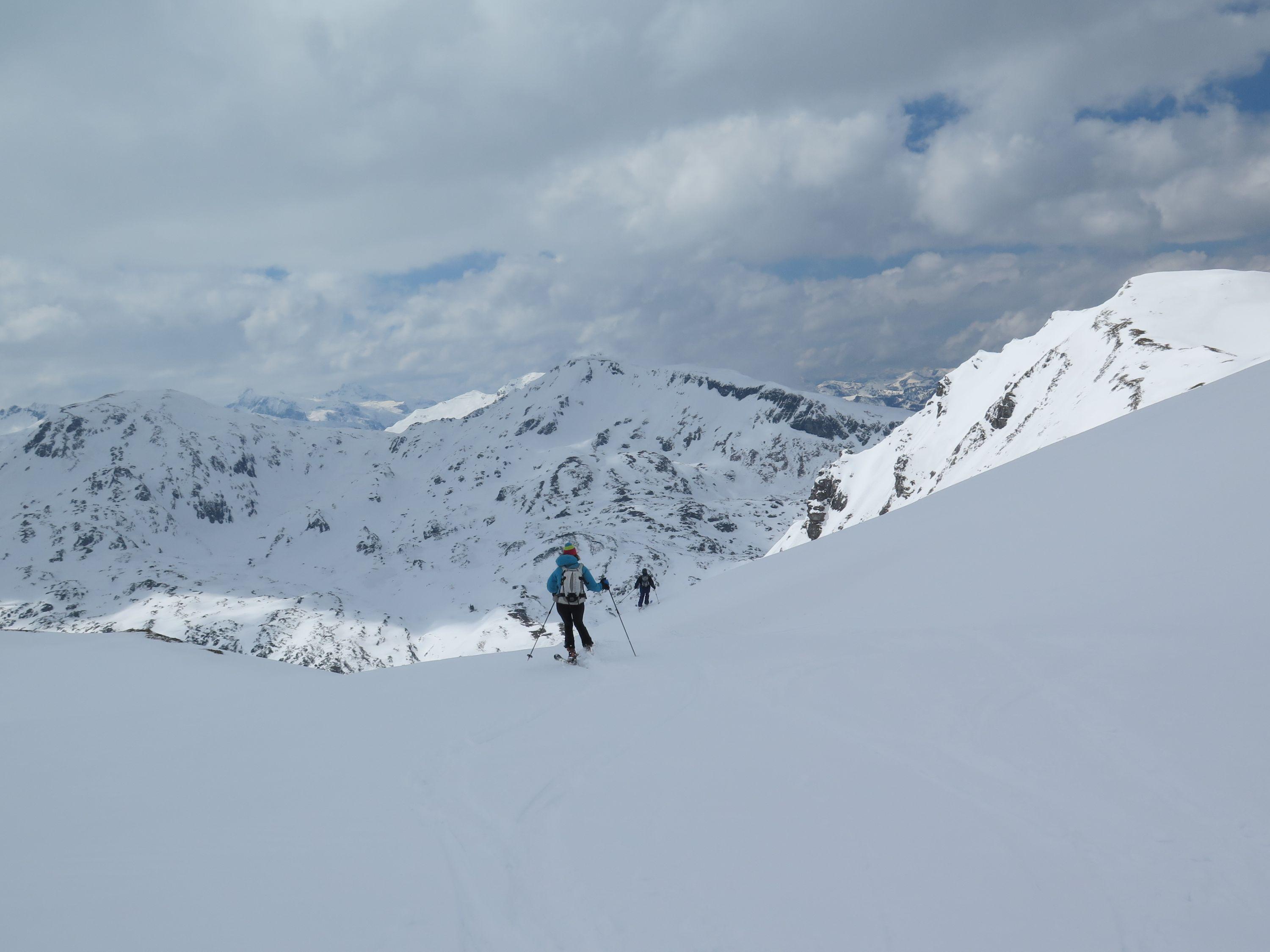 Start beim Seekarhaus-Hundskogel-Roßkogel-Oberhüttensattel-Ahkarscharte-Lungauer Kalkspitze-Steirische Kalkspitze. Heute Aprilwetter, ständiger wechsel von Wolken, Nebel und Sonnenfenstern, dazu lebhafter Wind.Abfahrt : Schnee vom Roßkogel und zum Oberhüttensattel gut,auch die hälfte von der Steirischen Kalkspitze noch gut zu fahren, dann wirds durch die Sonneneinstrahlung rasch tiefer und schwerer