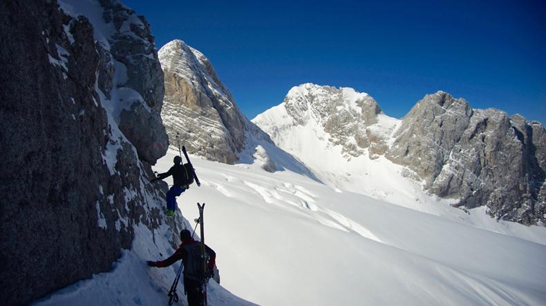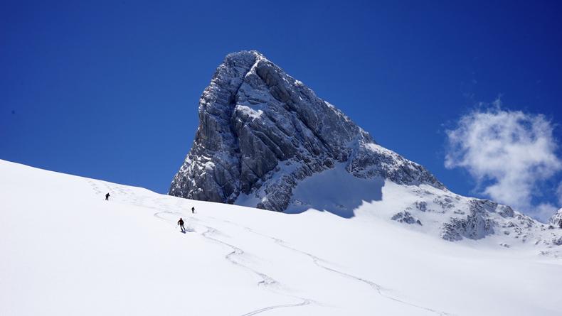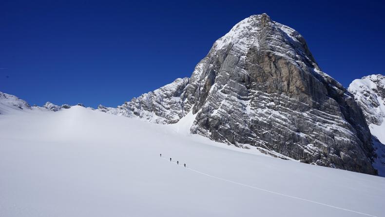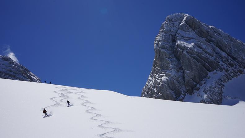 Verlauf: Von der Bergstation Hunerkogel über die Steinerscharte(2720m) in die obere Windlucke (2746m)- Abfahrt über den Gosaugletscher in den Bereich der Adamekhütte (2200m)- Aufstieg über das Torsteineck in die Windlegerscharte (2300m)- Abfahrt durchs Windlegerkar in den Bereich Schnittlauchmoosboden- kurzer Anstieg zum Sulzenhals mit anschließender Abfahrt zur Oberhofalm/Filzmoos.