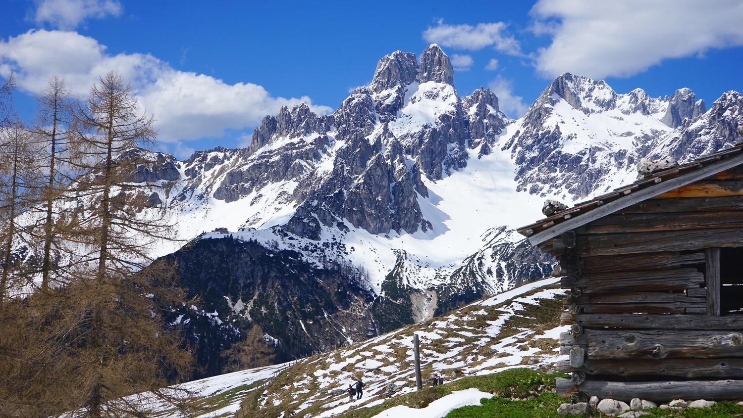 Abfahrt Sulzenhals zur Oberhofalm- eher ein Ausgleiten über Restschneefelder bis in den Bereich des oberen Almbodens- von hier 20 min zu Fuß zur Oberholalm die seit diesem Wochenende wieder geöffnet hat.