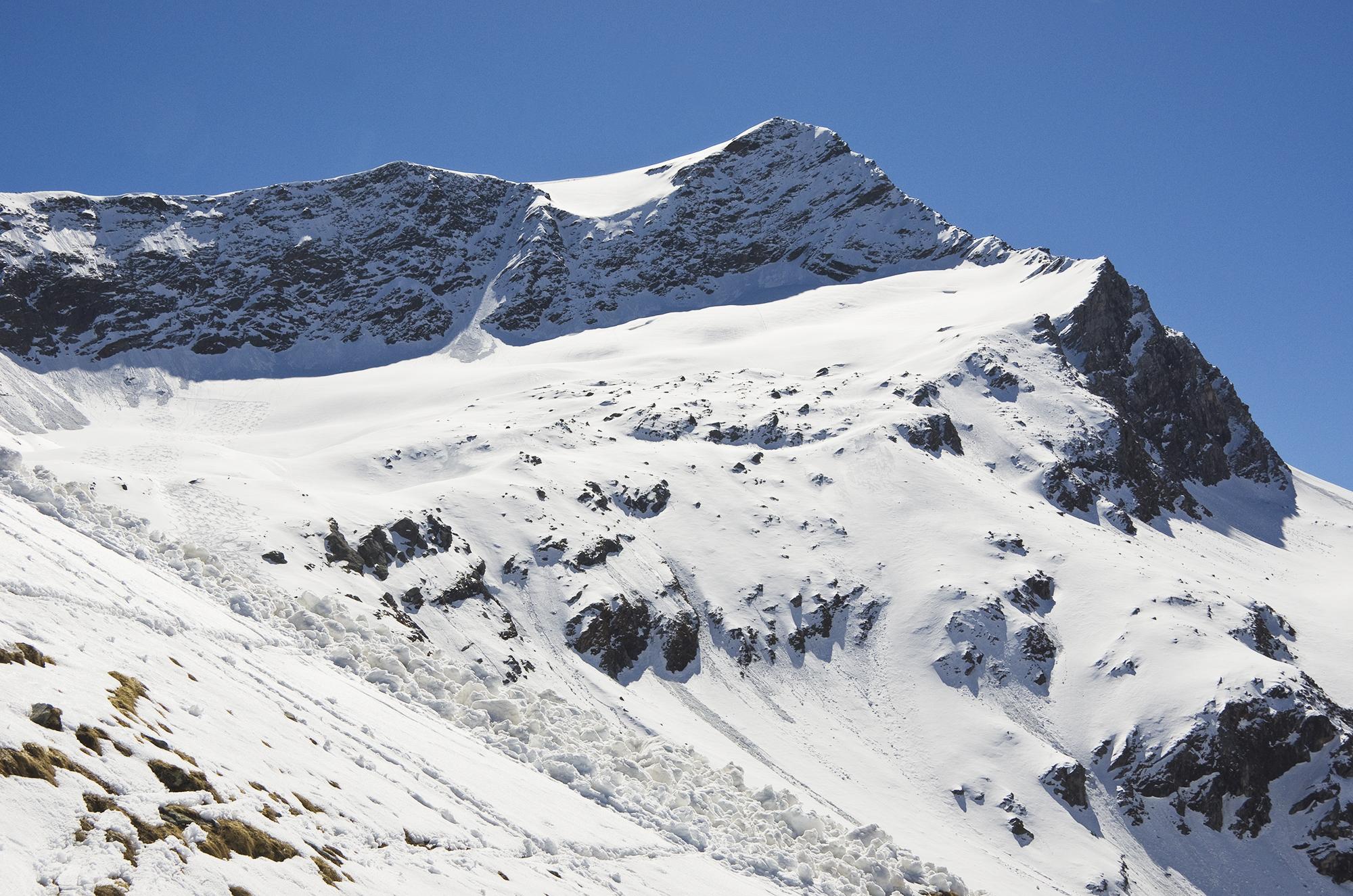Beste Verhältnisse haben wir heute angetroffen, obwohl wir spät gestartet sind. 1/2 h mit Turnschuhen, dann weiter mit Ski. Der Schnee war über Strahlungs-Nacht hartgefroren. Durch die Sonne jedoch morgens um 11 schon ganz gering angewärmt, so dass wir die Harscheisen im Rucksack lassen konnten. Die meisten Naßschneelawinen waren auch schon unten. Am oberen Kees hatten wir dann sogar Pulverschnee, leicht feucht und gesetzt.