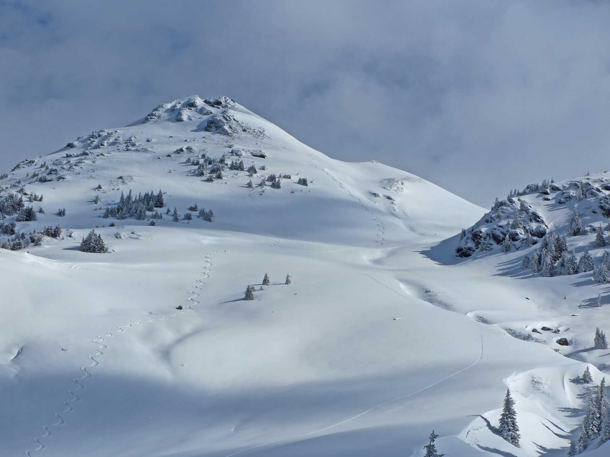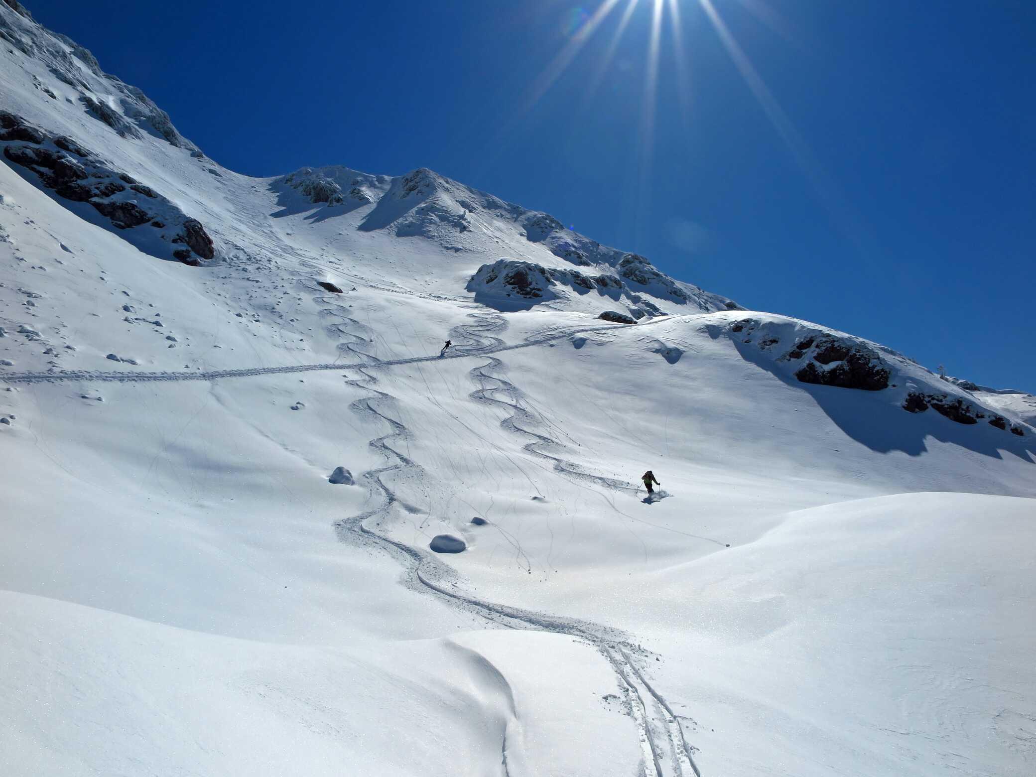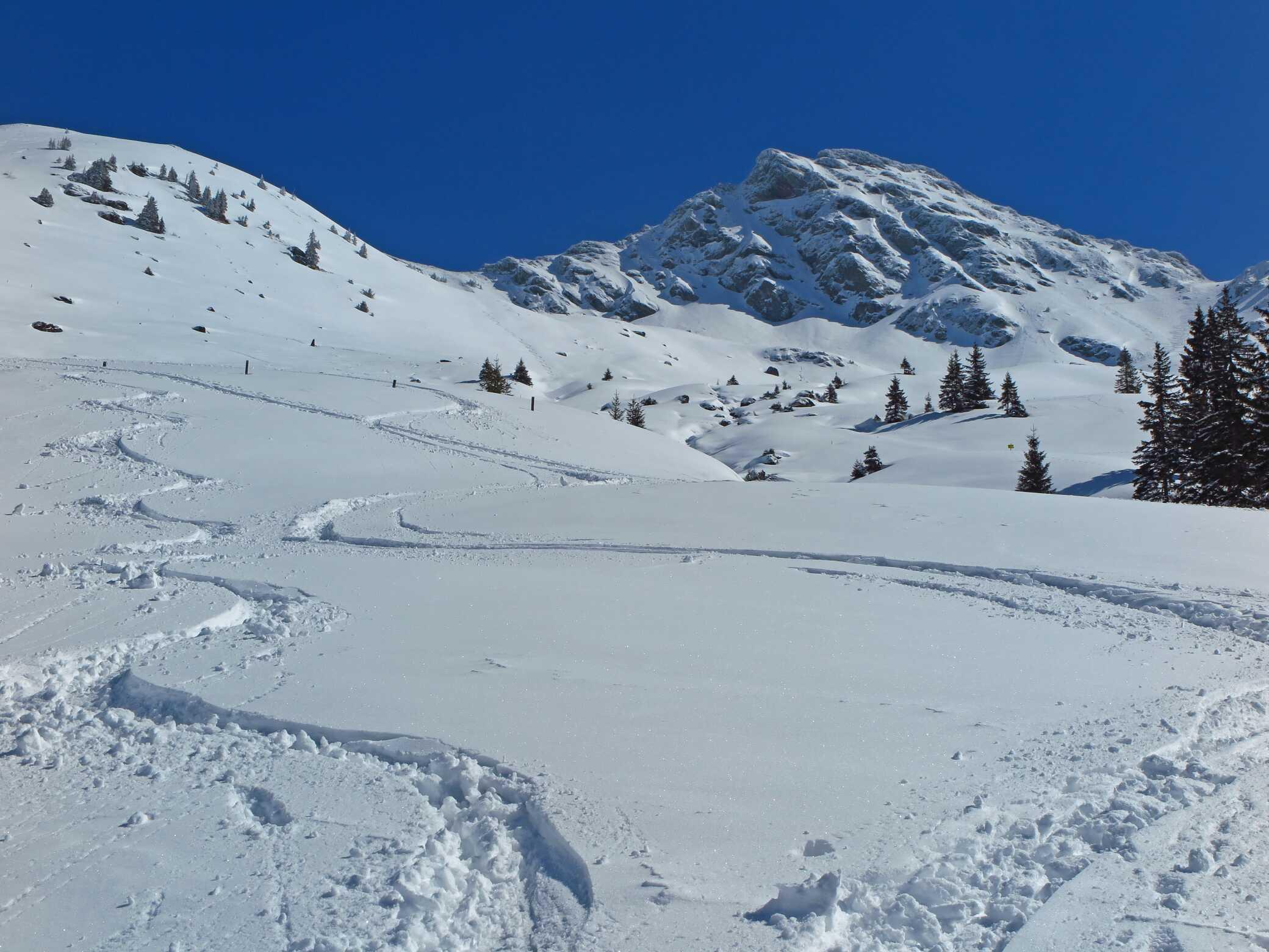 Schneelage: Vom PP mussten die Ski ca. 50m weit getragen werden, dann gings mit Ski in den Wildalmgraben hinein. Unten nur wenige cm , oben 10-15cm Neuschneeauflage. Der Untergrund trug unterhalb von ca. 1500m nicht, man sank etwas ein, oberhalb wurde er zunehmend tragfähig und kompakter. Oberhalb der Waldgrenze war stellenweise deutlicher Windeinfluss erkennbar, Gipfelbereiche und Grate oft abgeblasen oder windgepresst. Insgesamt waren alle Abfahrten gut machbar, ab dem Spätvormittag wurde der Schnee sonnseitig schon recht pappig, im Schatten blieb er noch pulvrig.