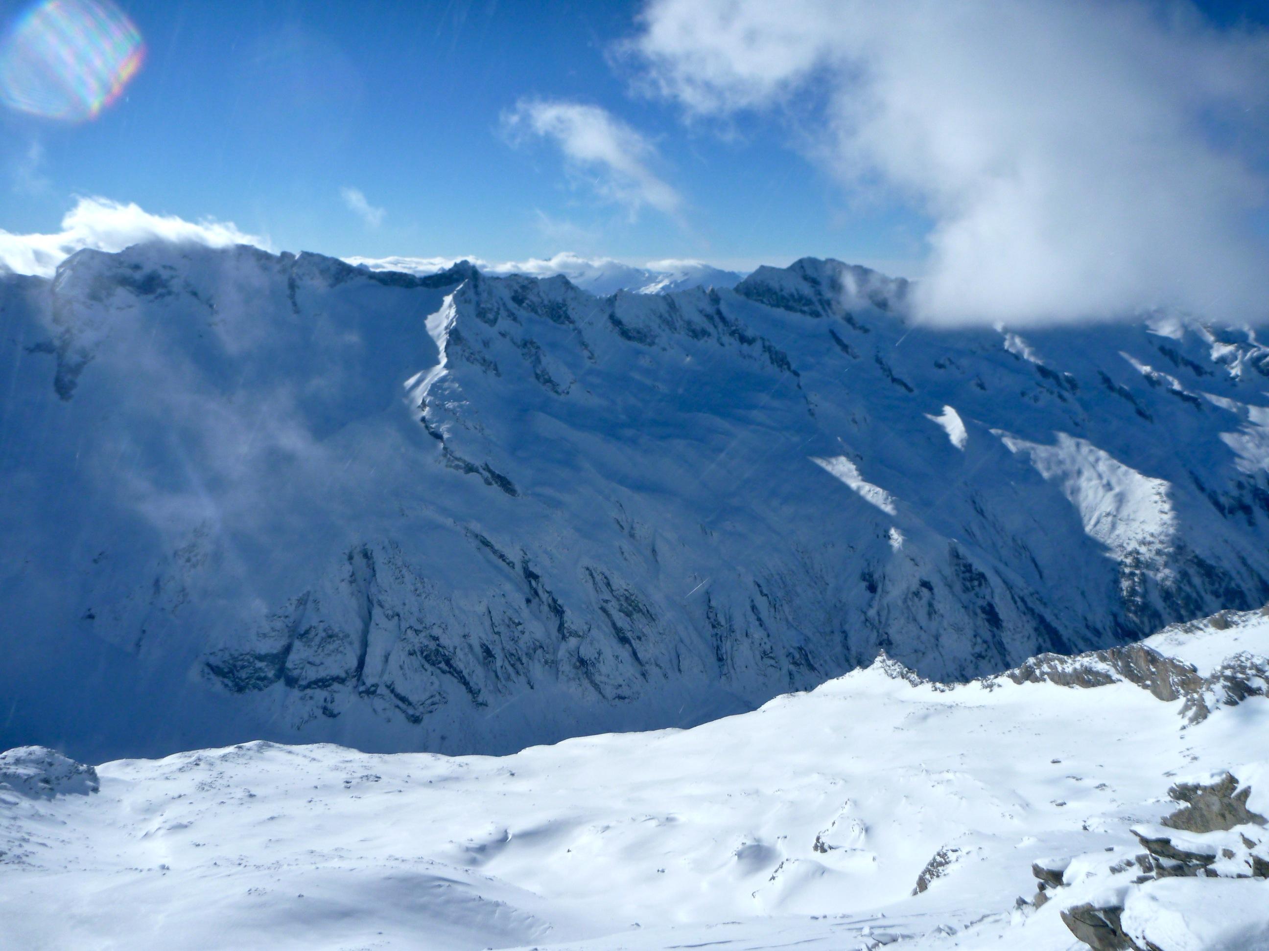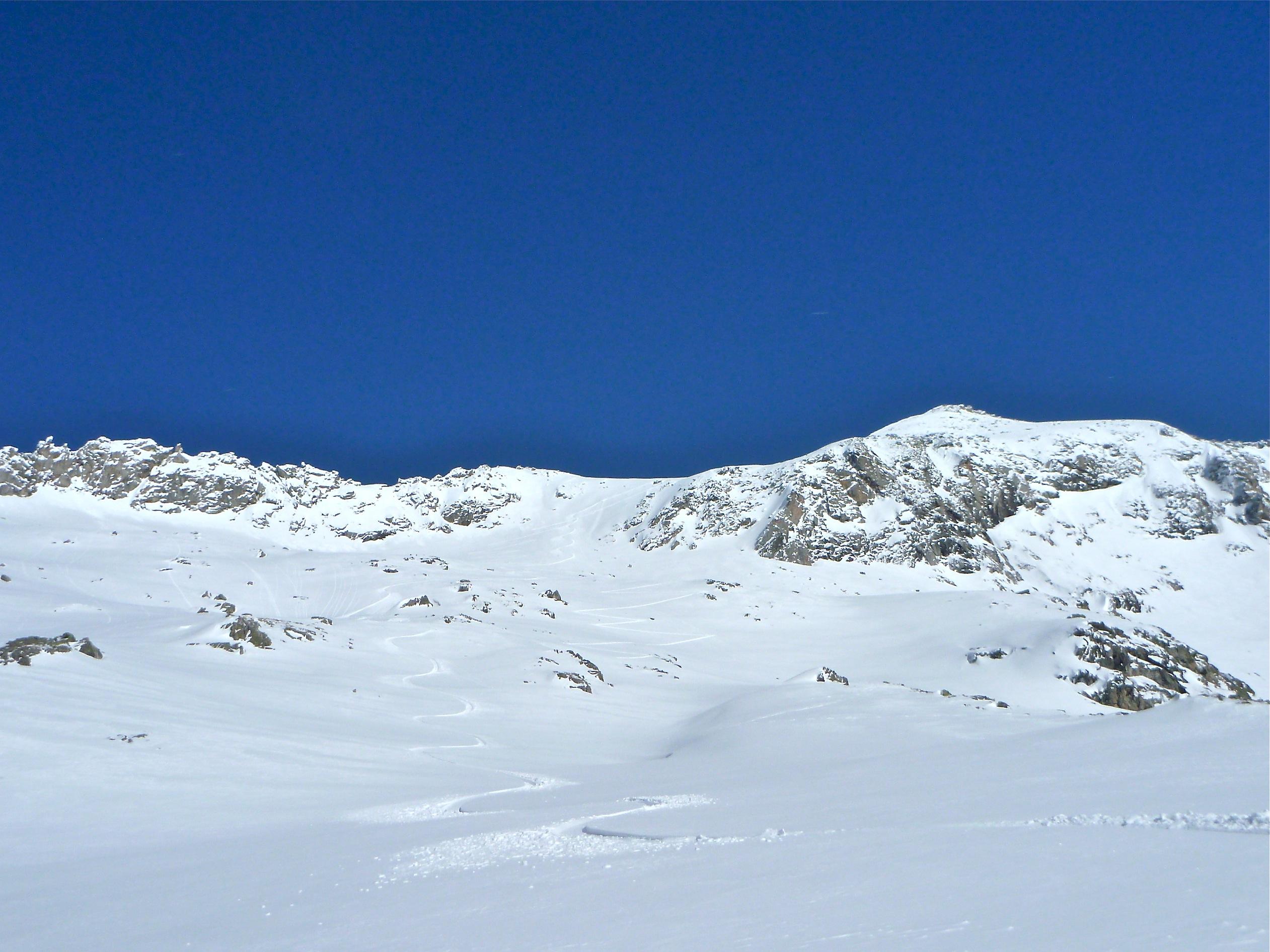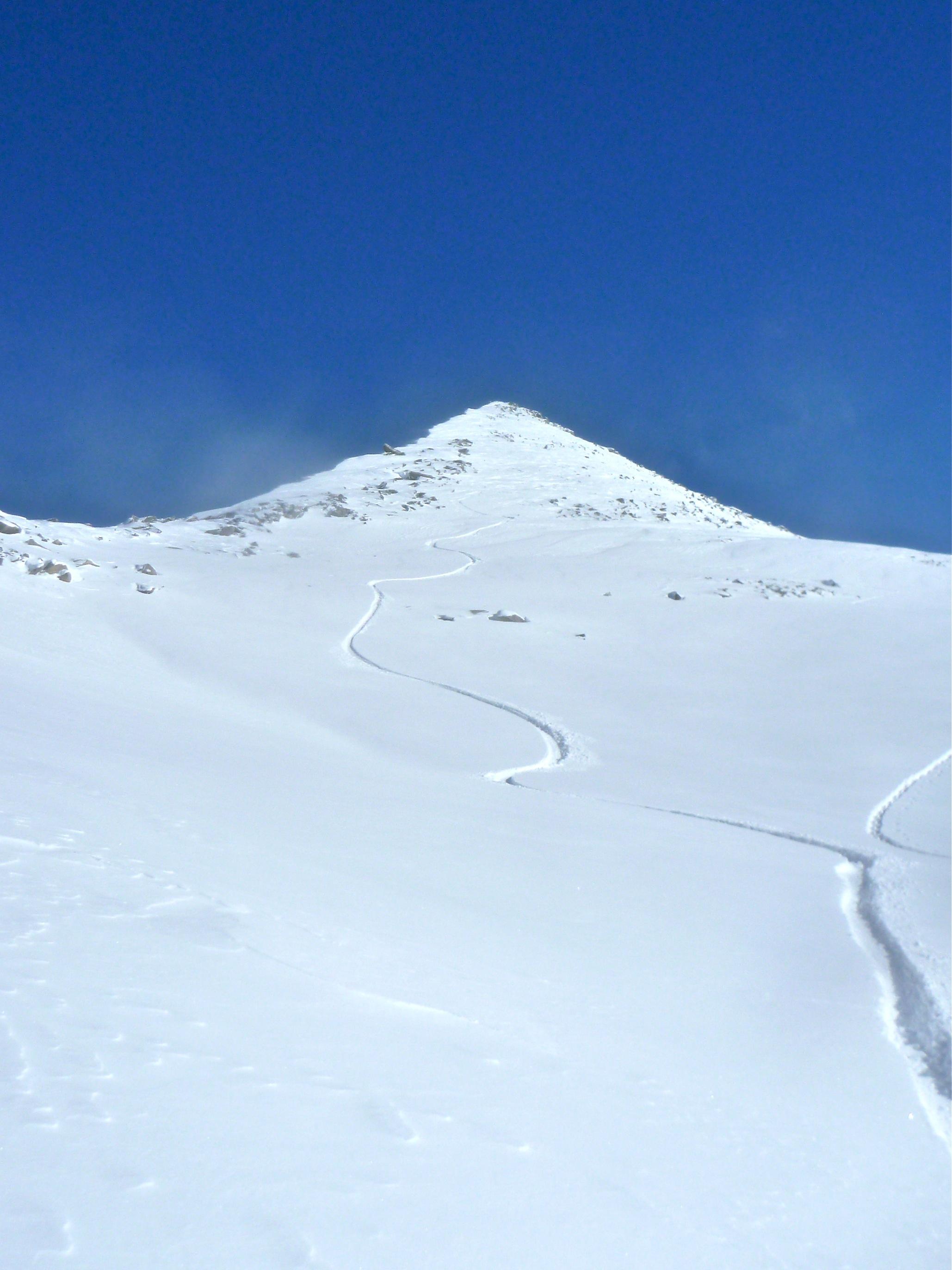 Nach Start um 10:15 beim GH in der Au und 45min. Forststraßenhatscher ging`s dann kurz vor der Schönhüttenalm über eine schöne Rinne hoch, alles stabil, ein paar alte Lawinenknollen, Pulver und sogar Stellen mit Wassereis, der Ausstieg dank glatter Felsplatten kurz zu Fuß und "tricky". Ab hier ging`s nur mit 1 Stock weiter, weil ich einen leider in der Rinne vergaß und nicht mehr zurück wollte. Es folgte eine steinige Querung ins Schönhüttenkar und ein schöner Anstieg über sanftes kupiertes Gelände. Ein steiler Aufschwung und noch ca. stürm. 100hm zum Gipfel, die letzten 10hm zu Fuß.