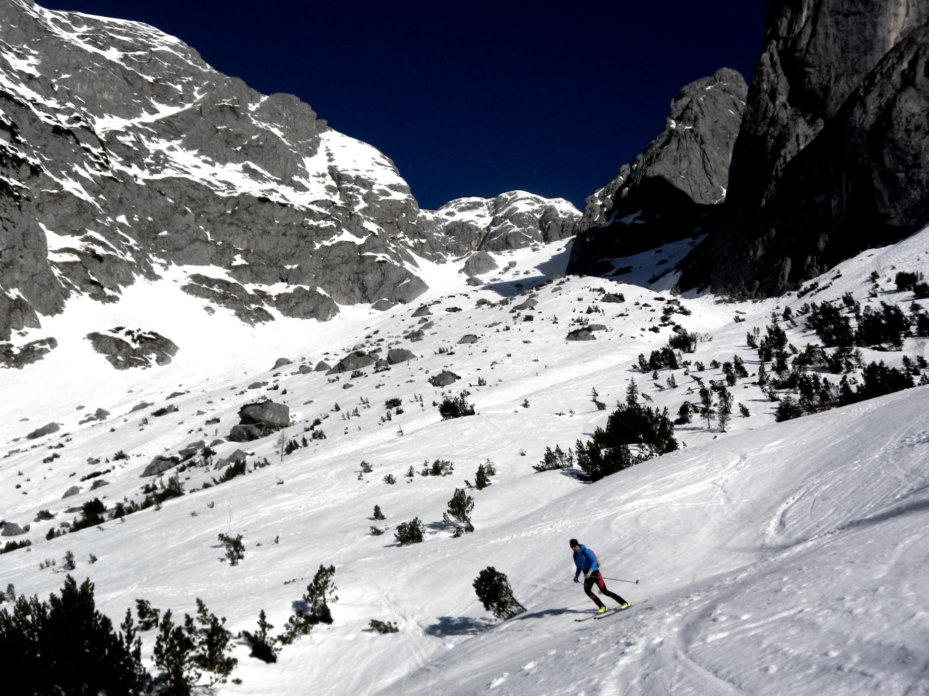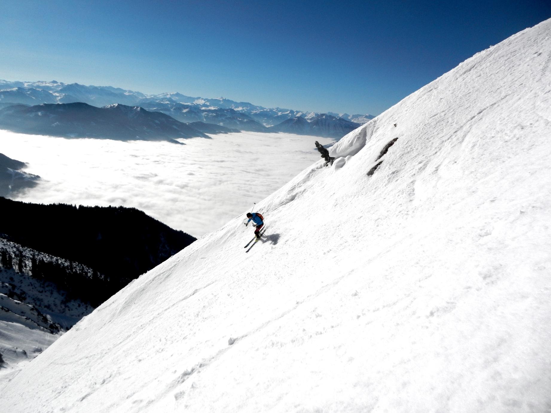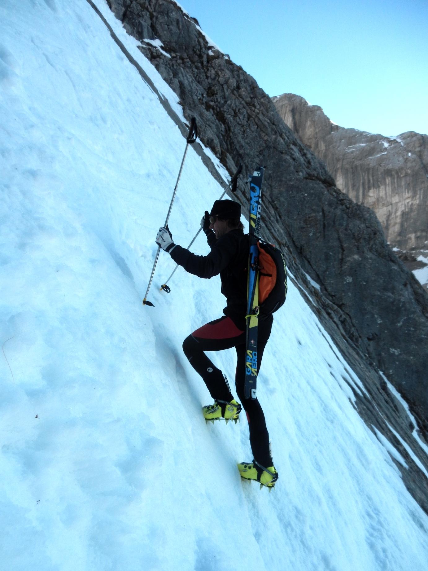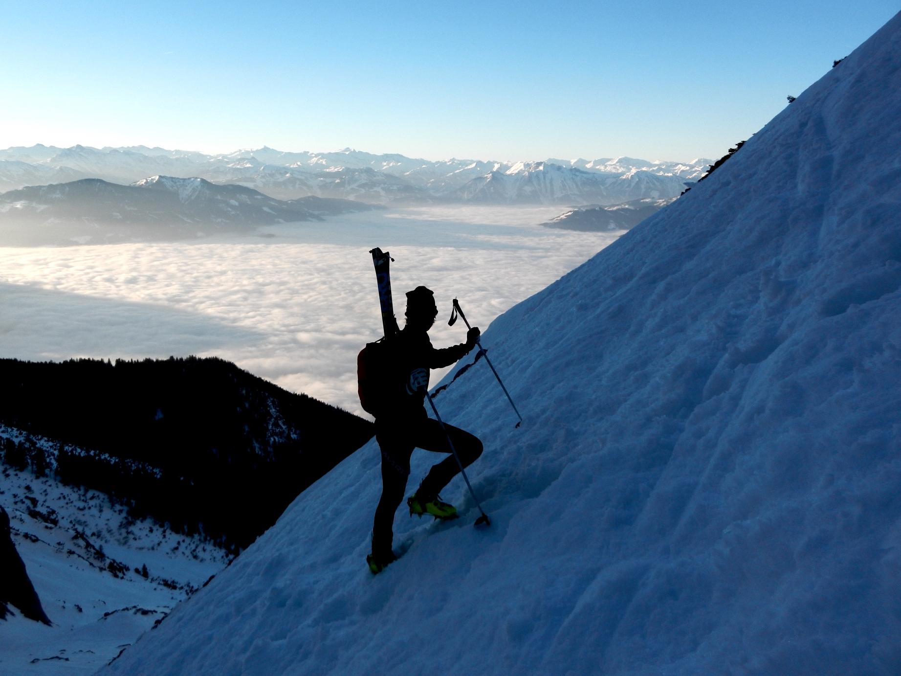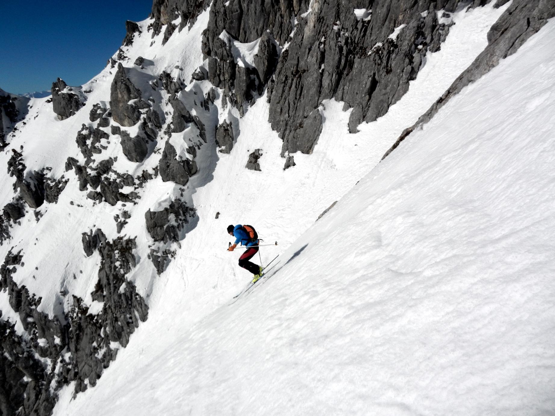 Der Vollständigkeit halber noch ein Hinweis: Das Plattl ist irgendwas zwischen 45 und 50 Grad steil und da sollte man schon halbwegs sicher auf den Schiern stehen, wenn man das fährt. Also bitte nicht einfach so nachfahren, weil es schön aussieht. Gilt sicherlich für alle Touren in diesem Forum, aber ganz besonders für die steileren Sachen ...