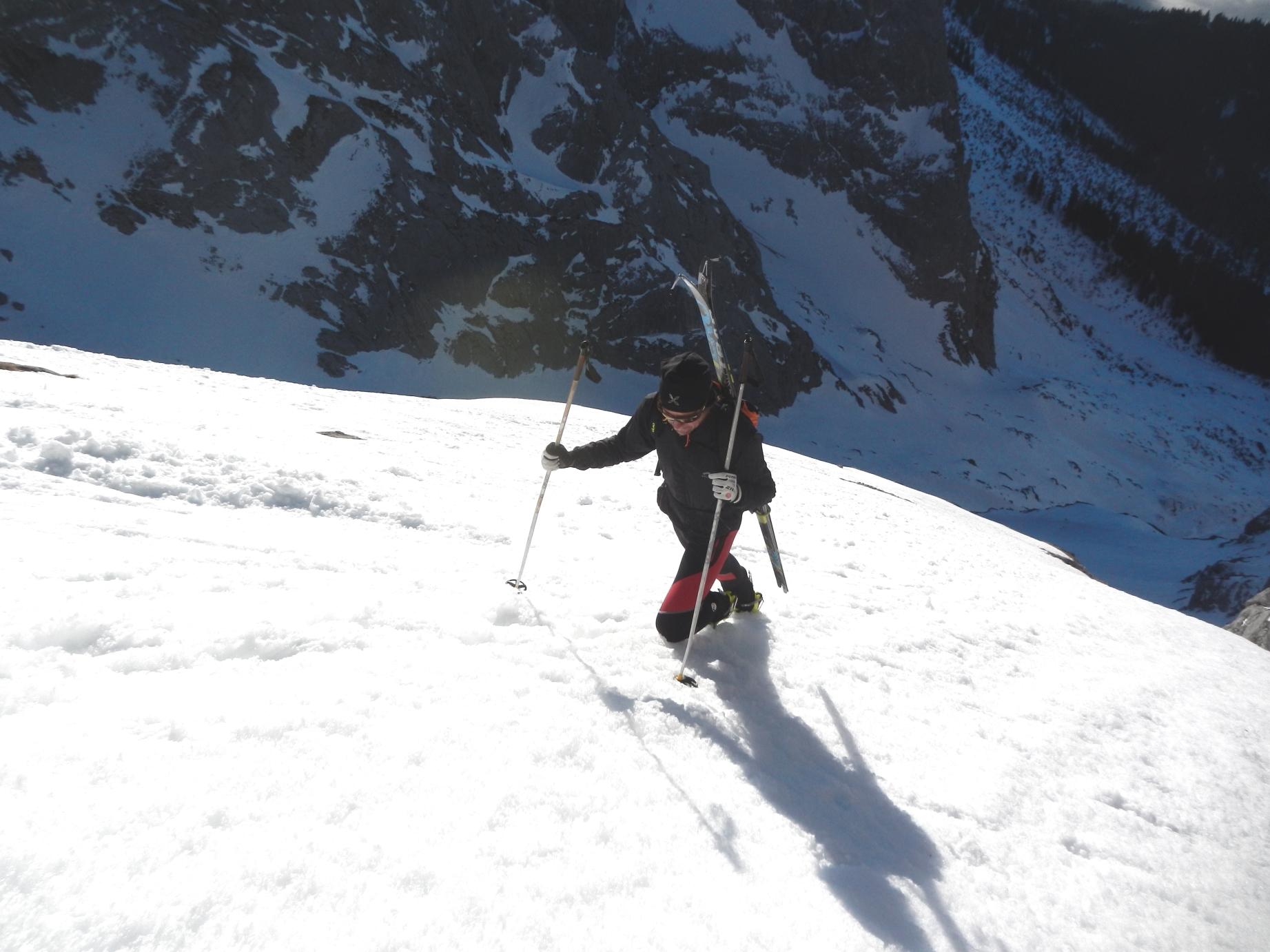 Verhältnisse: Alles gut durchgefroren, aber schon relativ wenig Schnee und ziemlich „grobblat“. Wenn’s die nächsten Tage weiterhin so warm ist, wird es wohl bald vorbei sein. Um 10:00 hat’s vom Firn her halbwegs gepasst, 20 Minuten später wäre besser gewesen. Grund war vermutlich der Wind, den es von oben runter gedrückt hat. Generell waren die Verhältnisse heute nicht so schön. Die Rumpelkammer hat dann ihrem Namen alle Ehre gemacht: es war noch sehr hart und durch die alten Spuren hat es recht gerumpelt.
