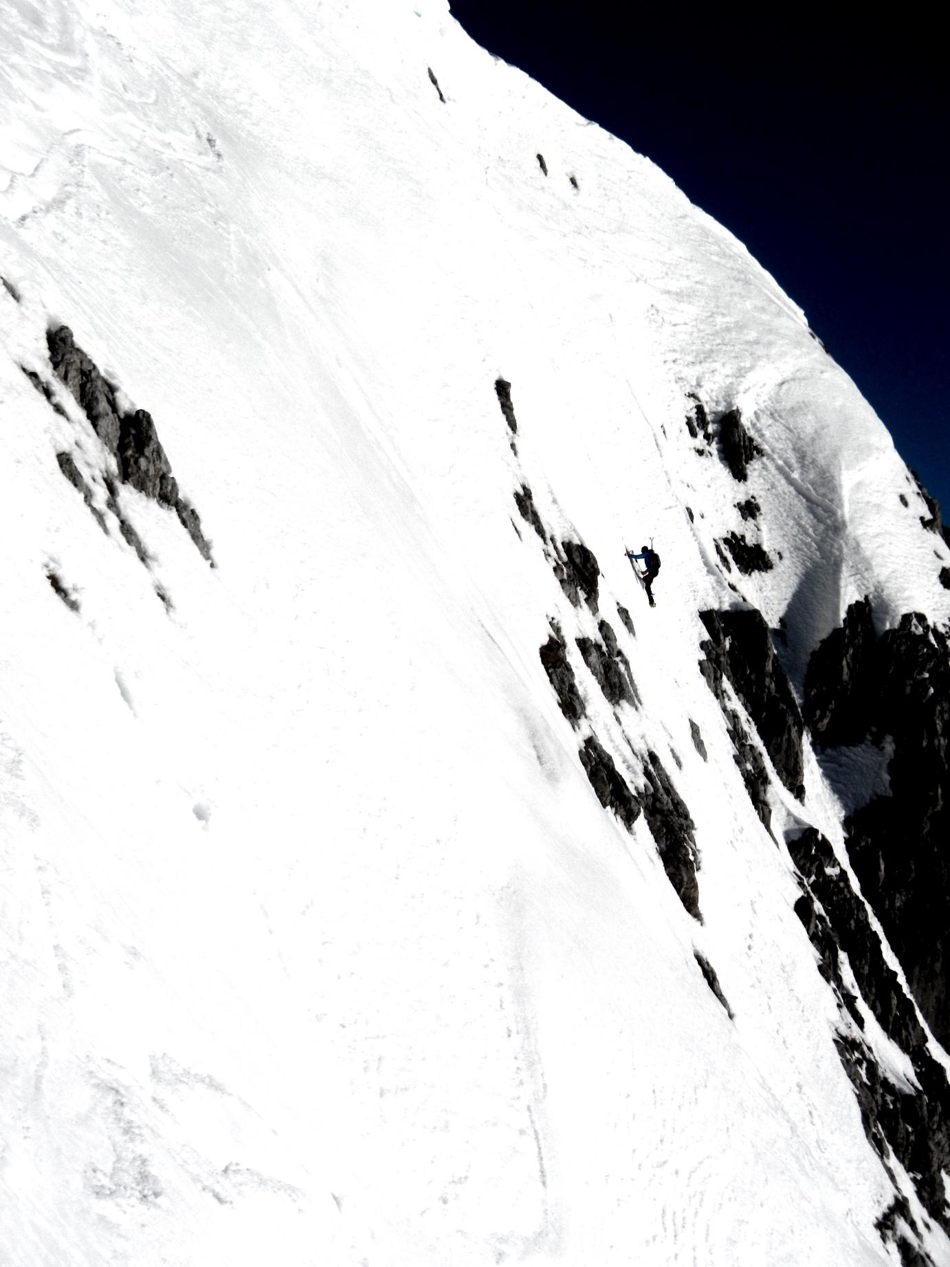 Um 08:30 sind wir oben – viel zu früh. Oben frischer NO-Wind, alles noch hart. Um 09:00 fahren wir den Gipfelhang runter zur Einfahrt ins Plattl (sehr hart - und da es oben ja auch schon steil ist, war keine so gute Idee). Bei der Plattl-Einfahrt warten wir noch bis ca. 10:00, bis wir dann runter fahren.