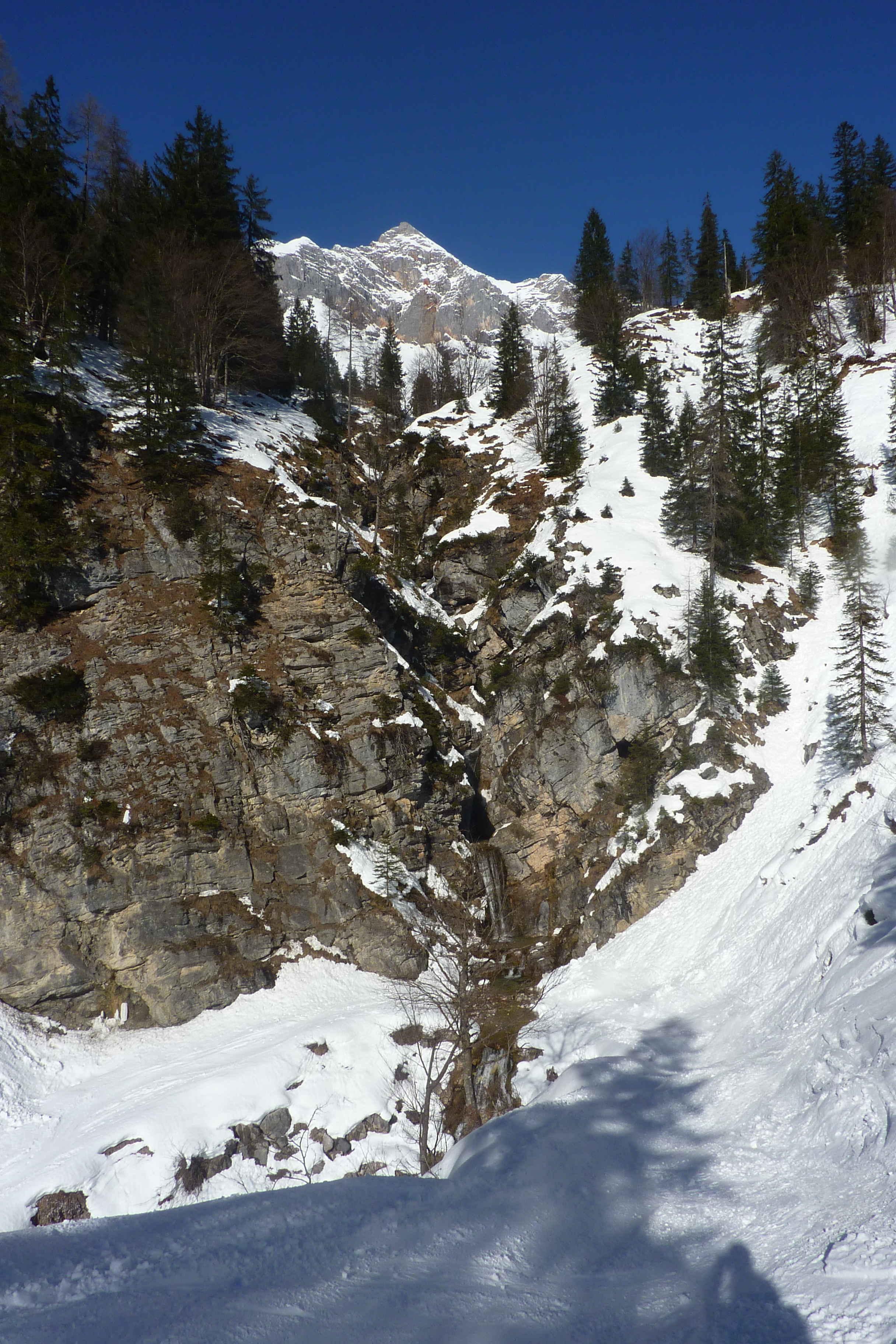 Starzeitpunkt 8 Uhr hat ausgereicht, um bis zur Freitholfalm schönen, schon etwas tieferen Firn zu genießen. Nur die obersten 100 Hm und in der Scharte kalter Wind (der dort auch das auffirnen verhindert hat). Ab der Alm sulzig, auf der Straße nach dem Wasserfall die ersten kleinen aperen Flecken - das wird bald mehr werden.