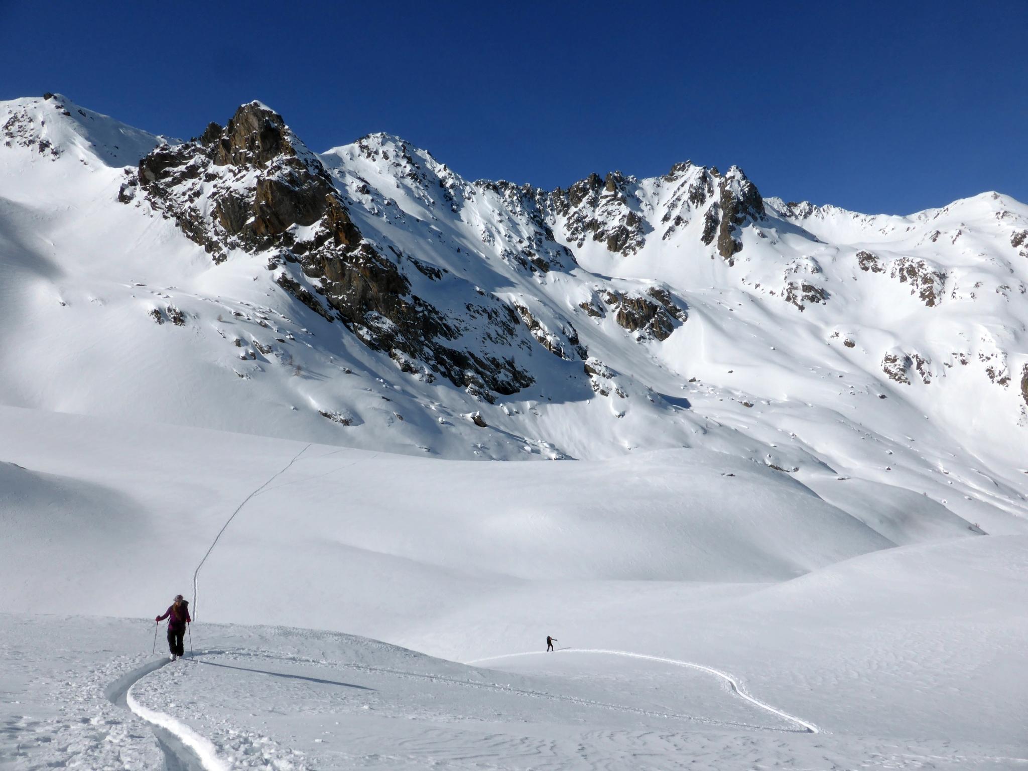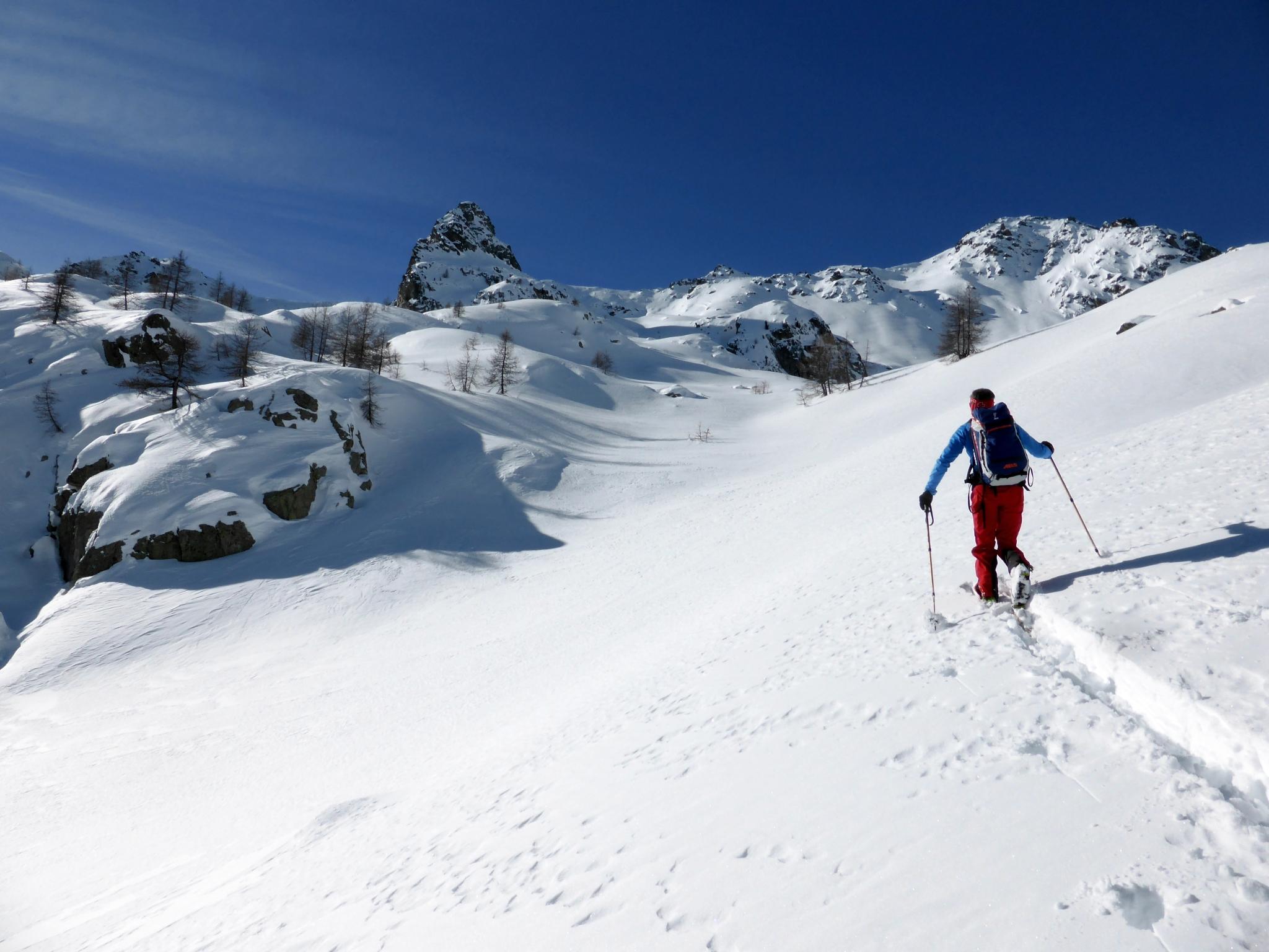 Route: Villagio Primavera – Vallone Forneris – Colle del Ferro Sud – Testa del Ferro, 2769 m. Der steile und schmale Schlauch im ersten Teil der Tour bildet den Schlüssel zum weitläufigen Skiparadies des oberen Vallone Forneris.