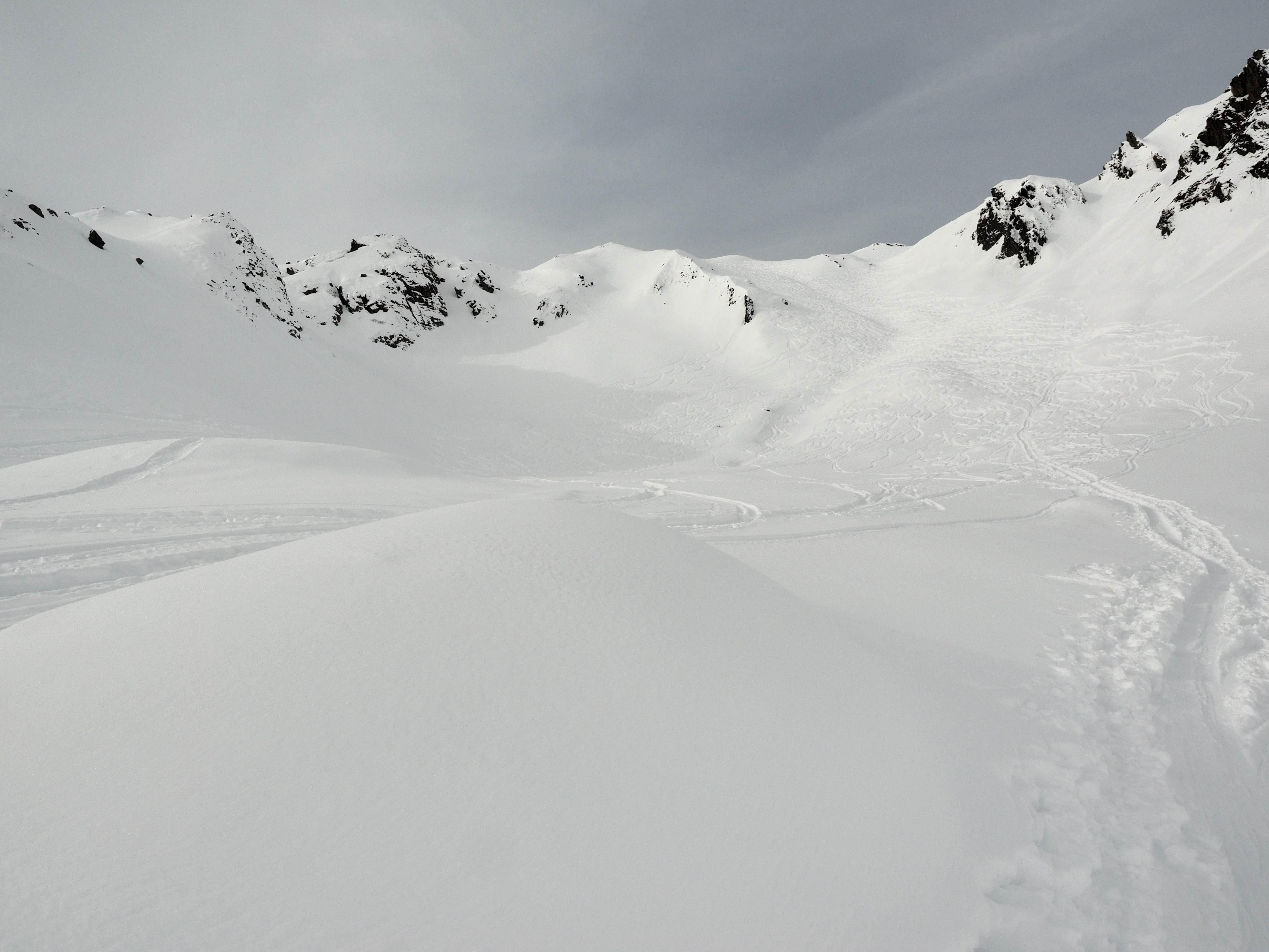 Schnee: sonnseitig bereits Harschdeckel, schattseitig super Pulver, wenn nicht verspurt