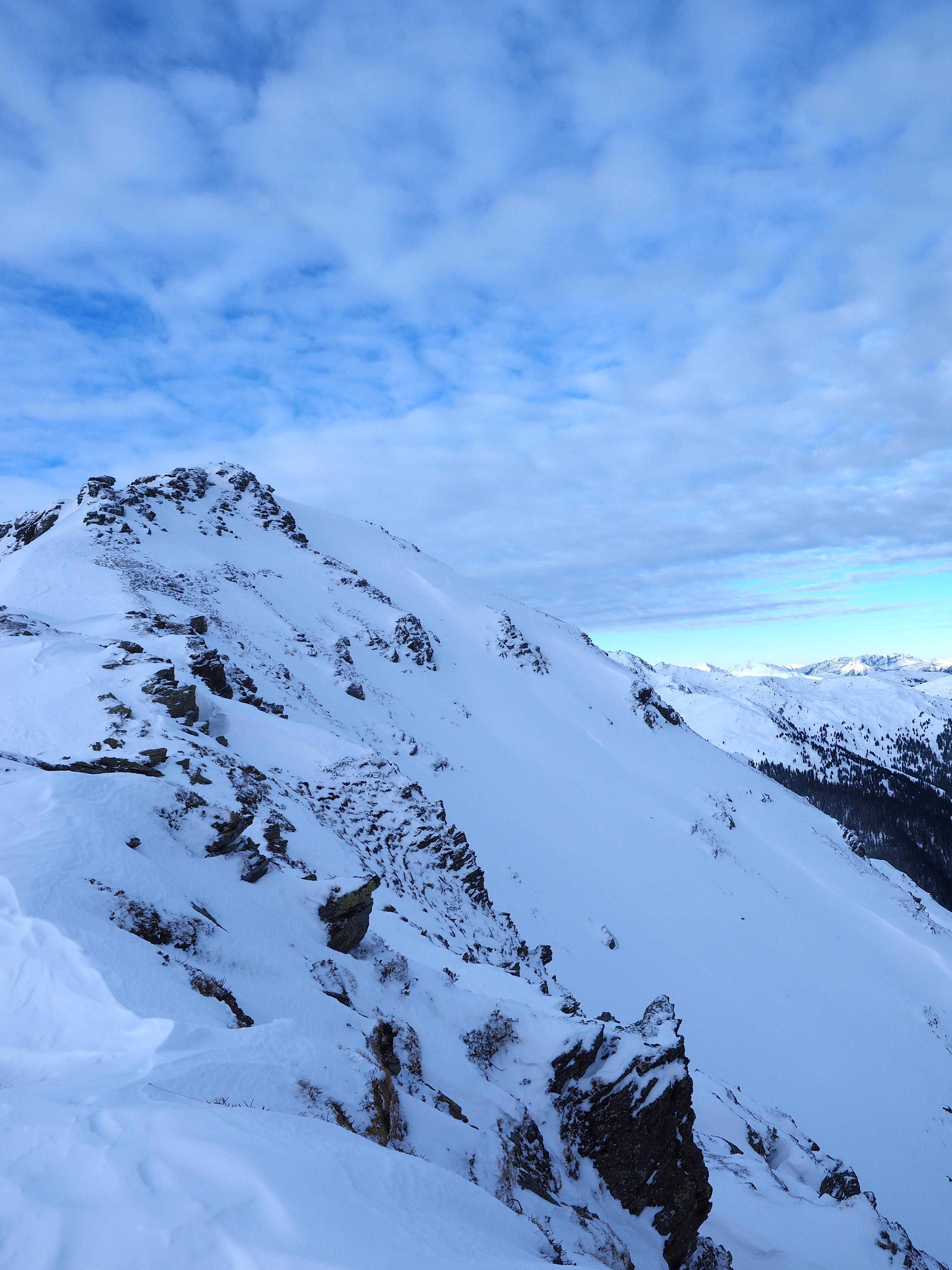 Lawinen: im Nordsektor teilweise ein paar alte Lawinenknollen, sonst nichts beobachtet. Entlang Gipfelgrat und Aufstiegsroute unproblematisch. Größte Gefahr ist eher in den Bach zu fallen....