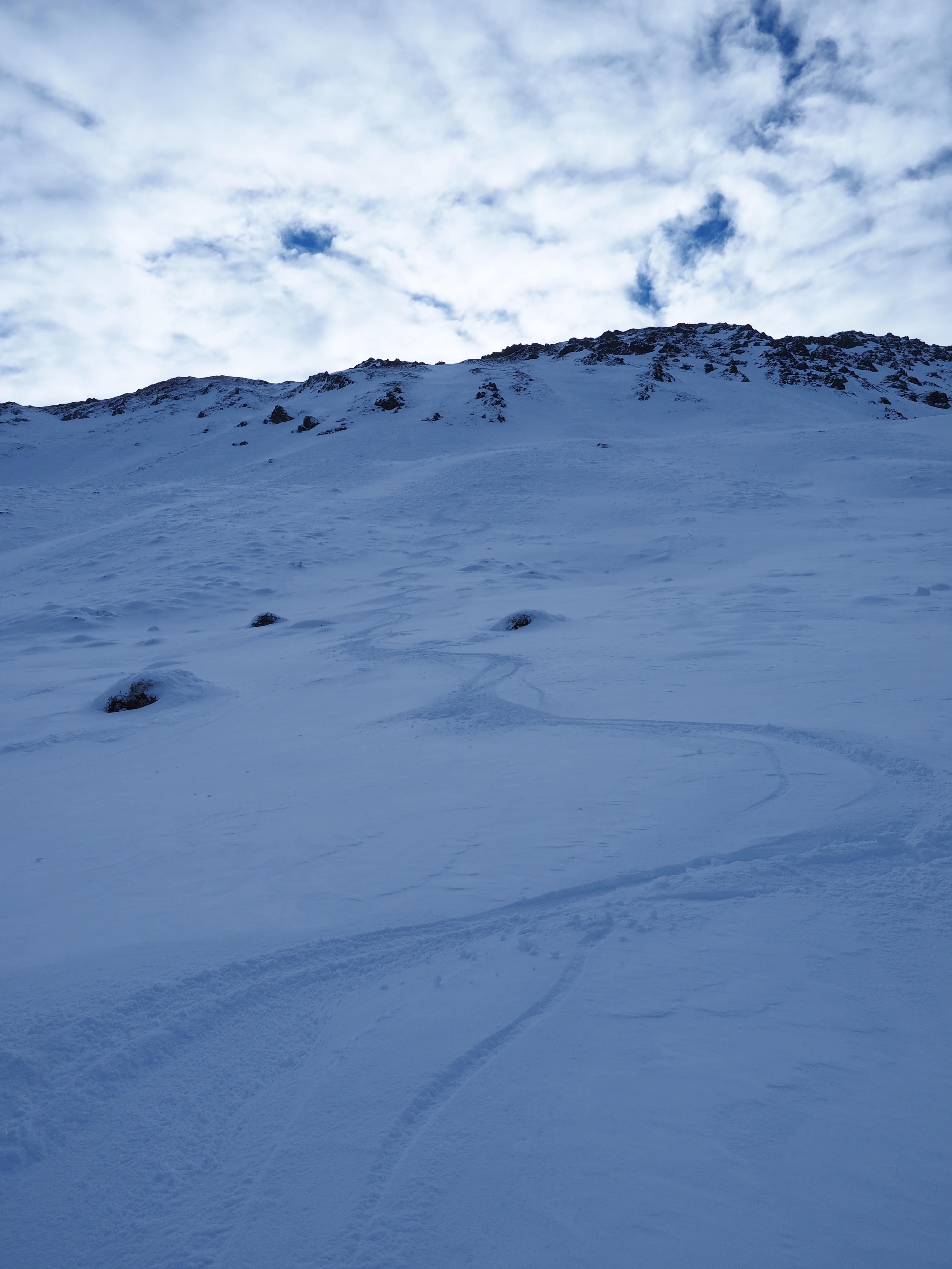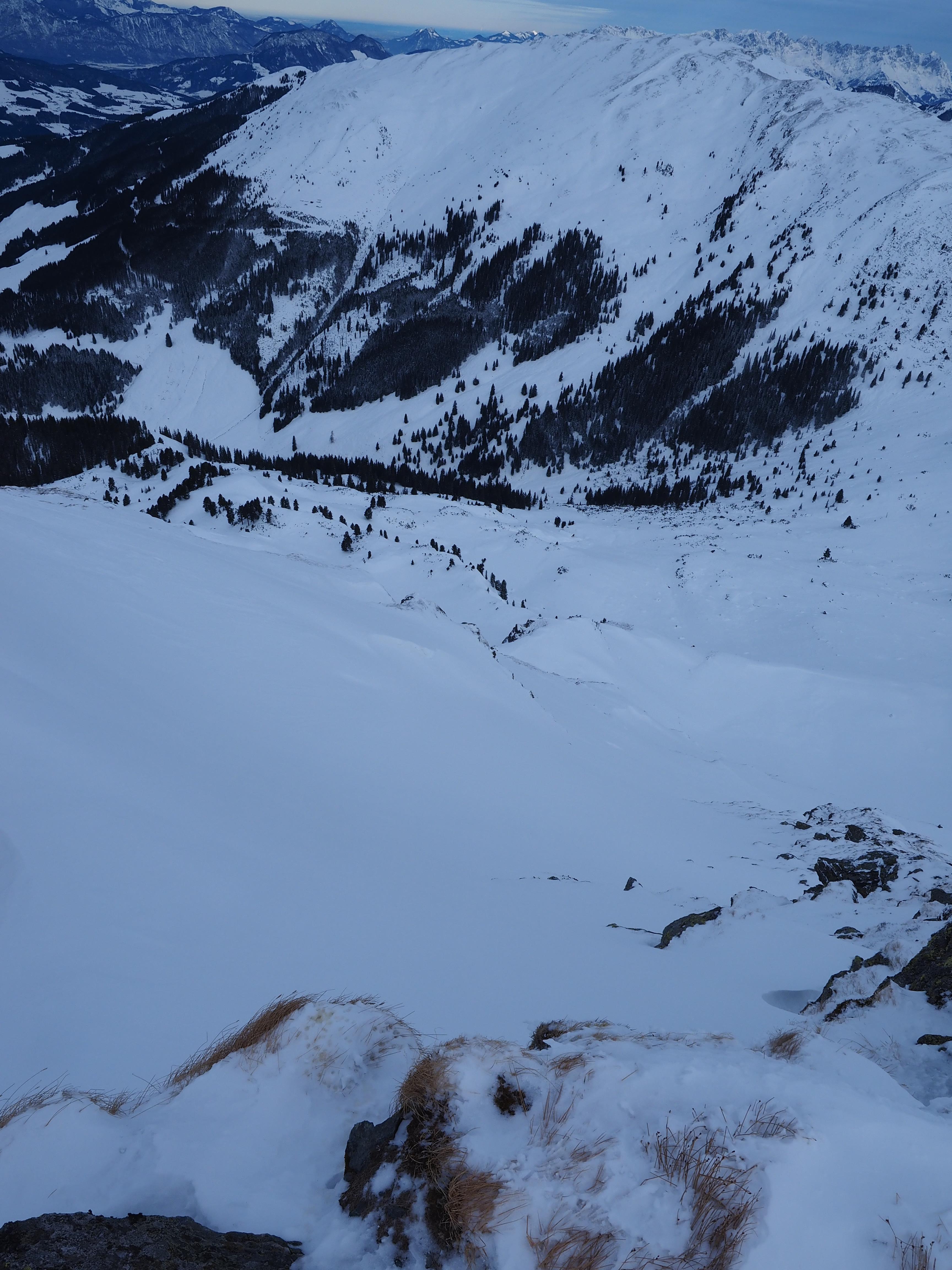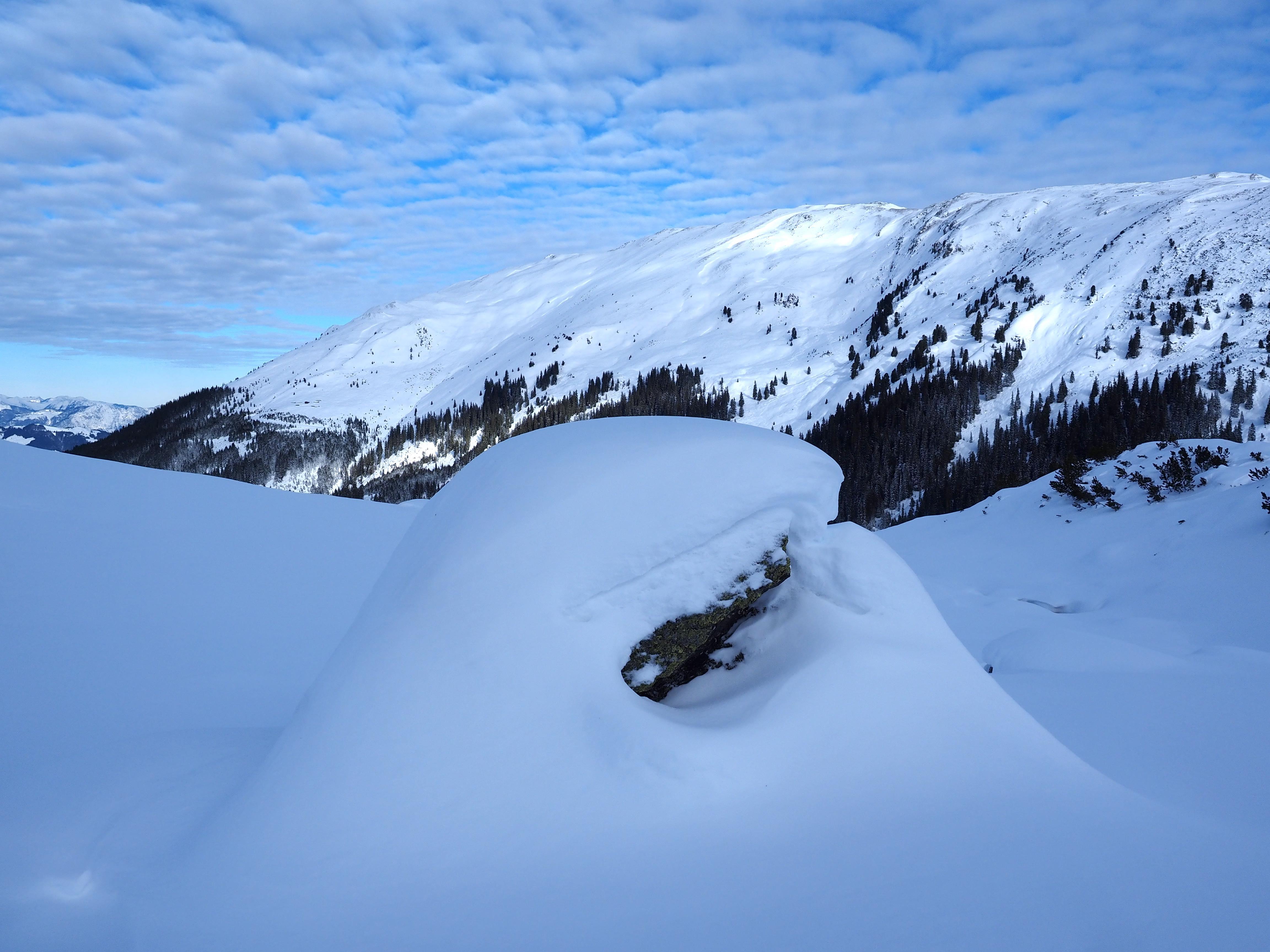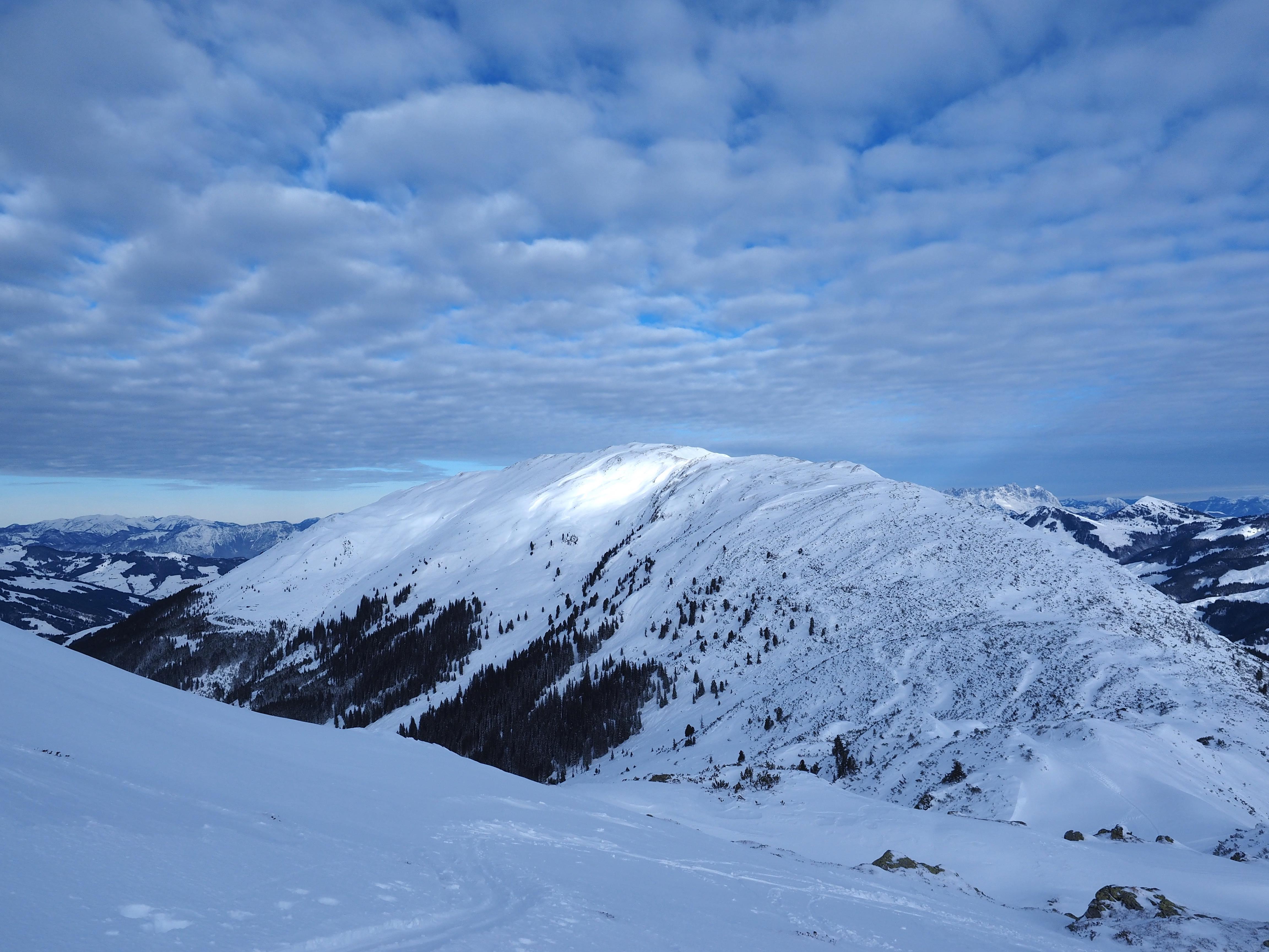 Schnee: unten 5 cm Neuschnee, ab 1400 m bis zu 10 cm, dann teilweise 15 cm Pulver abwechselnd mit harter Altschneedecke und Bruchharsch (bis ca. 1600 m dürfte es geregnet habe). Der Abfahrtsgenuss ist entlang des Gipfelgrates gut, dann zunehmend schlechter. 1 m Neuschnee (ohne Wind) würde helfen. Im Südsektor Richtung Oberkaralm einiges an Triebschnee..schaut verlockend aus.