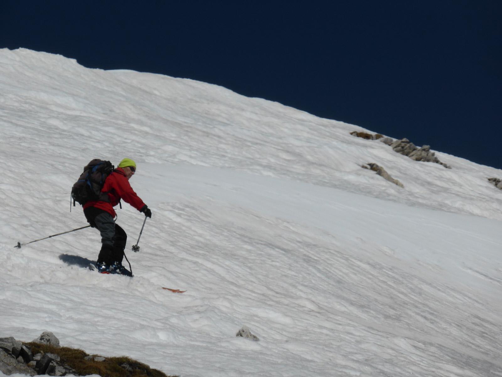 wegen forstarbeiten war die strasse bis 1250hm fast schneefrei(tragestrecke in beiden richtungen) anschliessend bis oberennsalm griffiger harsch. im anschliessenden grandiosen kar waren harscheisen sehr hilfreich(teils eisig im schatten). letzten 74hm zum gipfel wegen unbefahrbarkeit nicht mehr begangen.