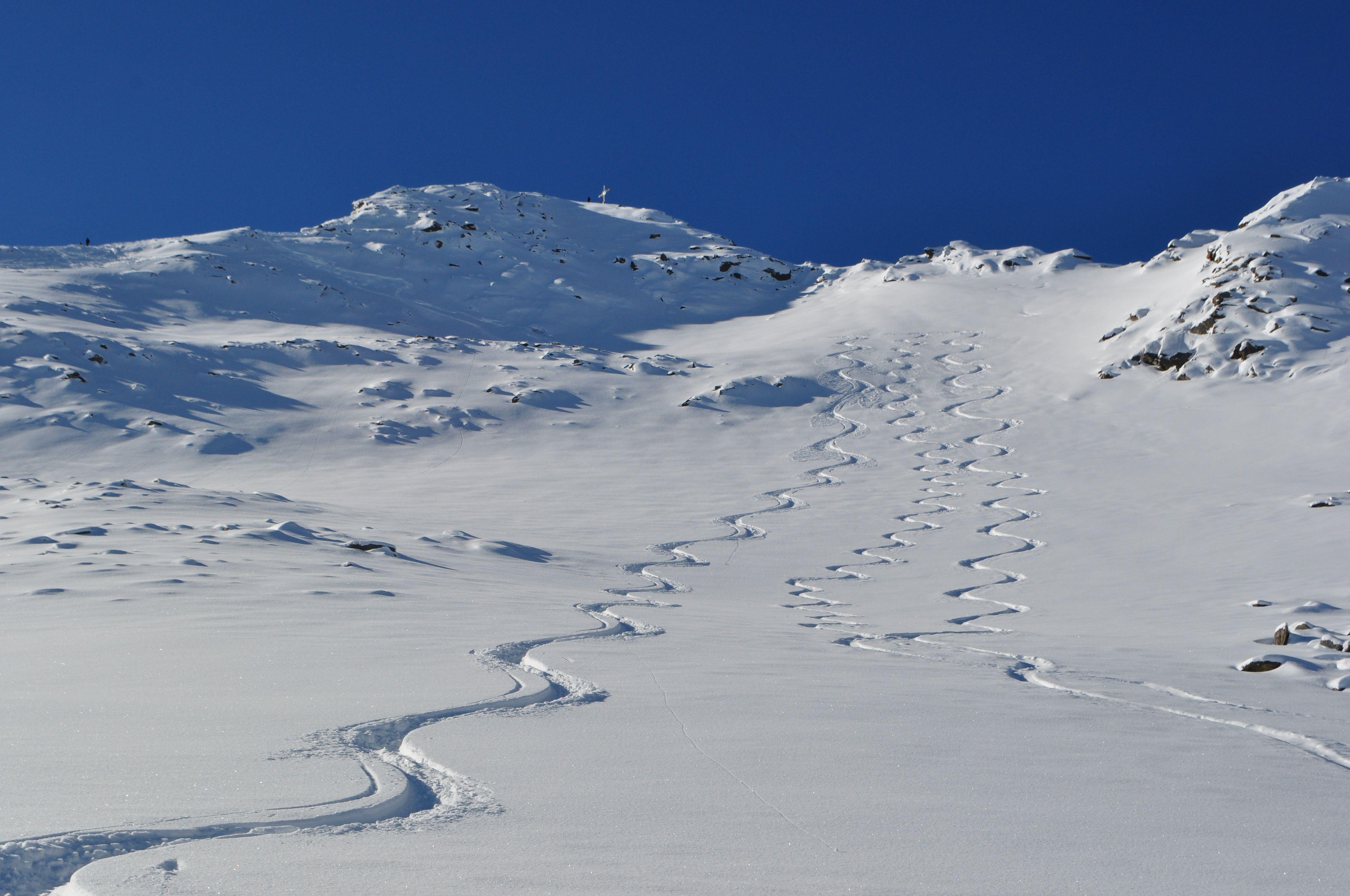 Schnee: Im N Sektor Champagner-Powder, sonnseitig bereits klebrig, Zahlreiche (alte) Rutsche aus steilem N-Sektor erkennbar, Ostseitig frische Anhäufungen, kein Windeinfluss vom Vortrag, teilweise stark verspurt