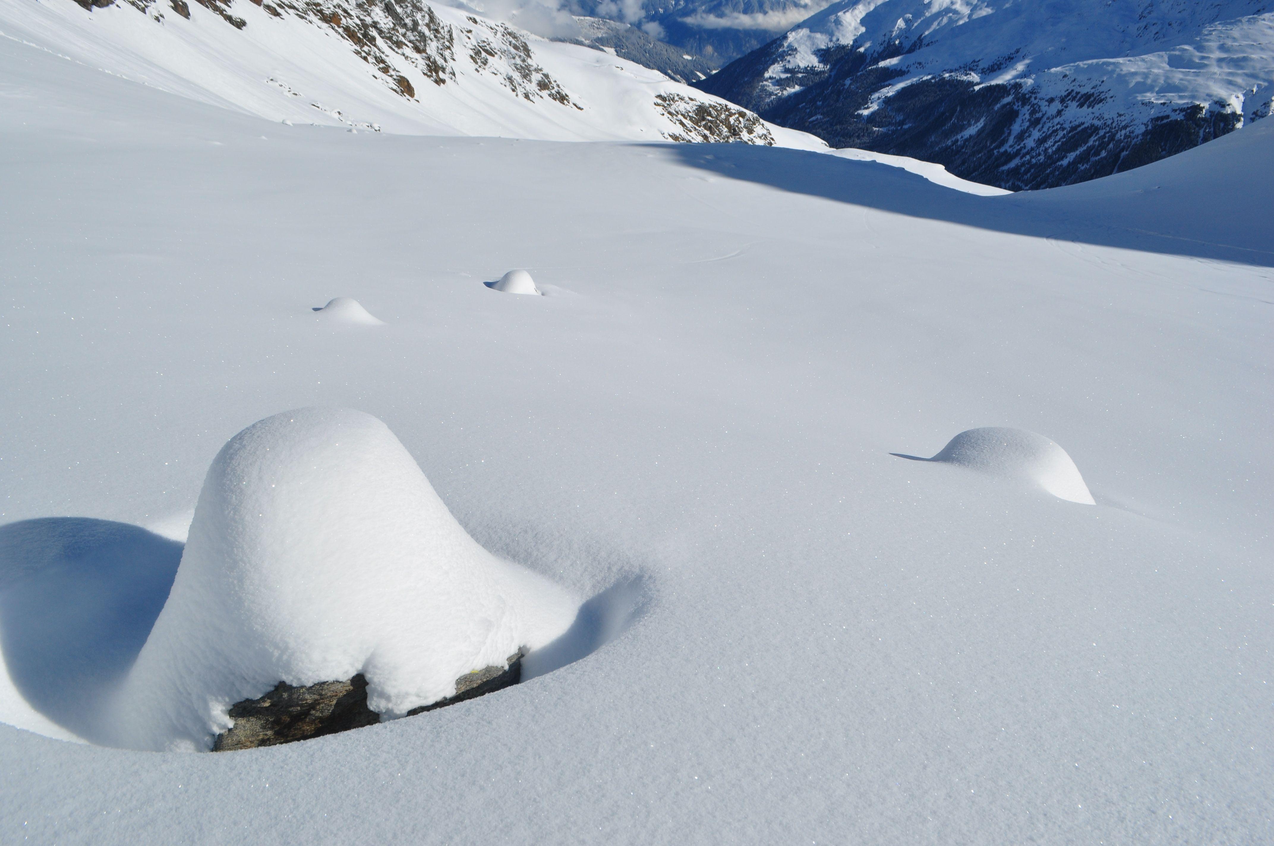 Schnee: Champagner-Powder, Achtung auf Sharks, der Neuschnee täuscht, vereinzelt Rutsche aus steilen Osthängen beobachtbar, zum Satteljoch noch teilweise unverspurt, ansonsten Aufstiegshang stark verspurt