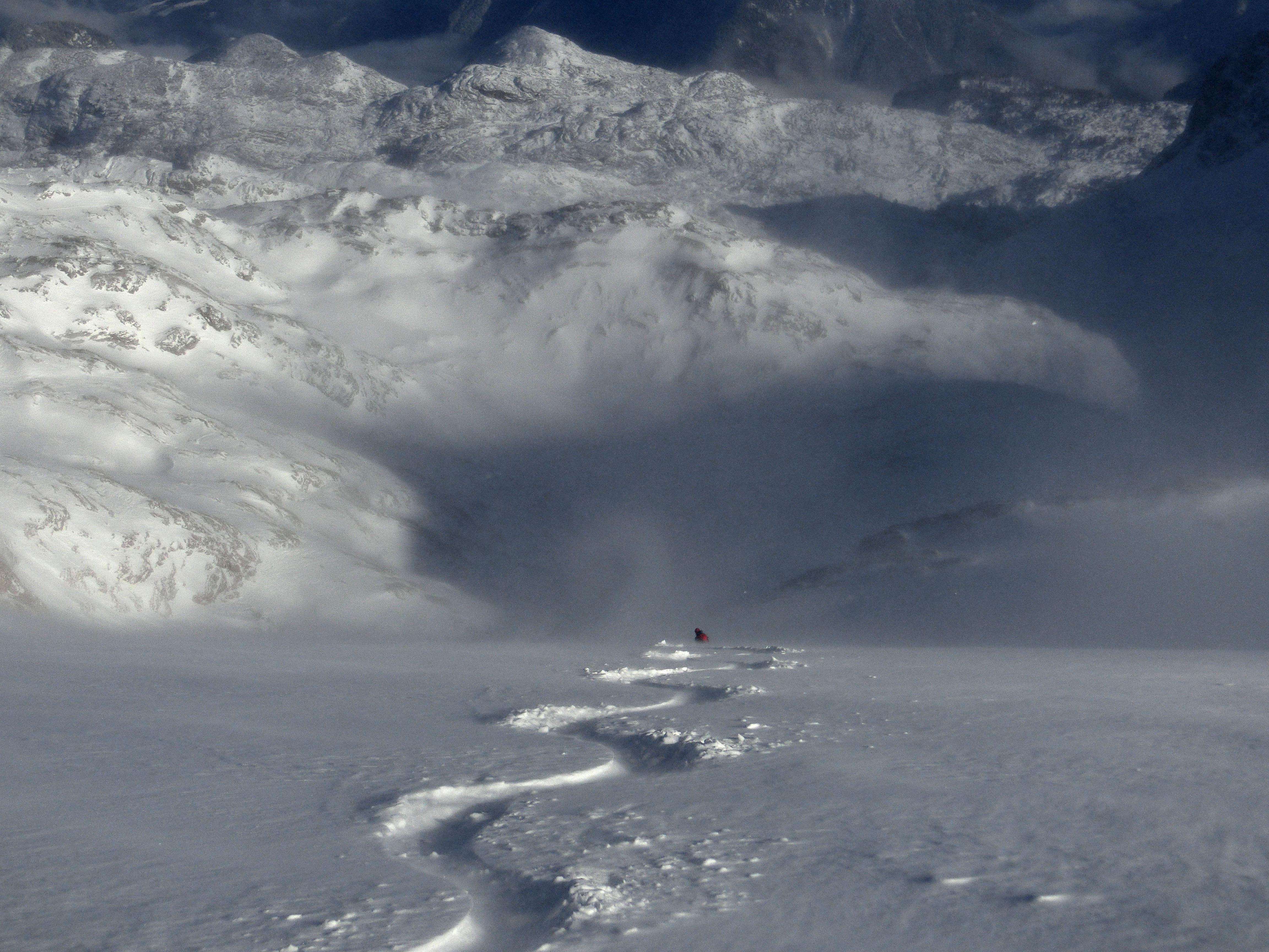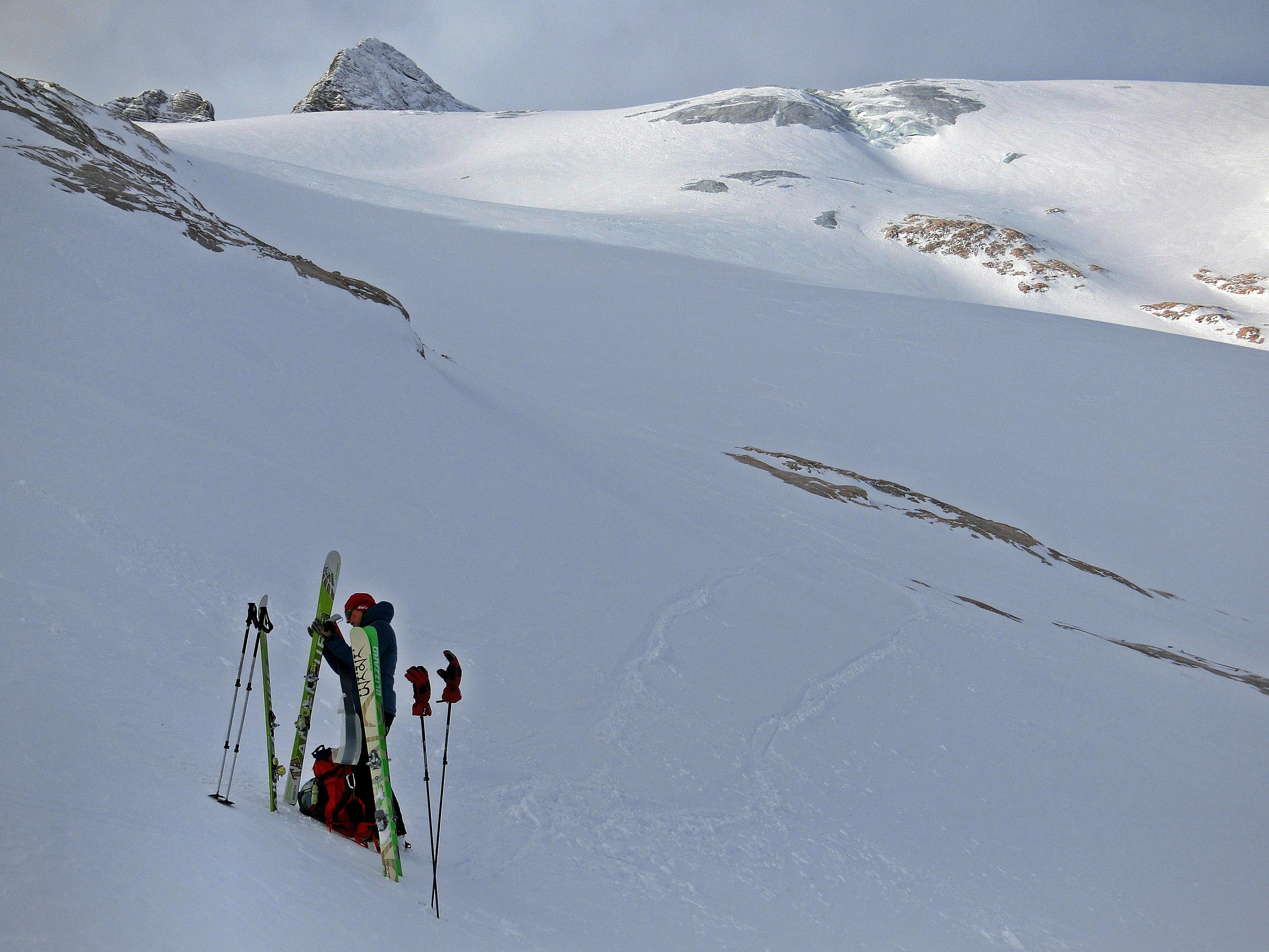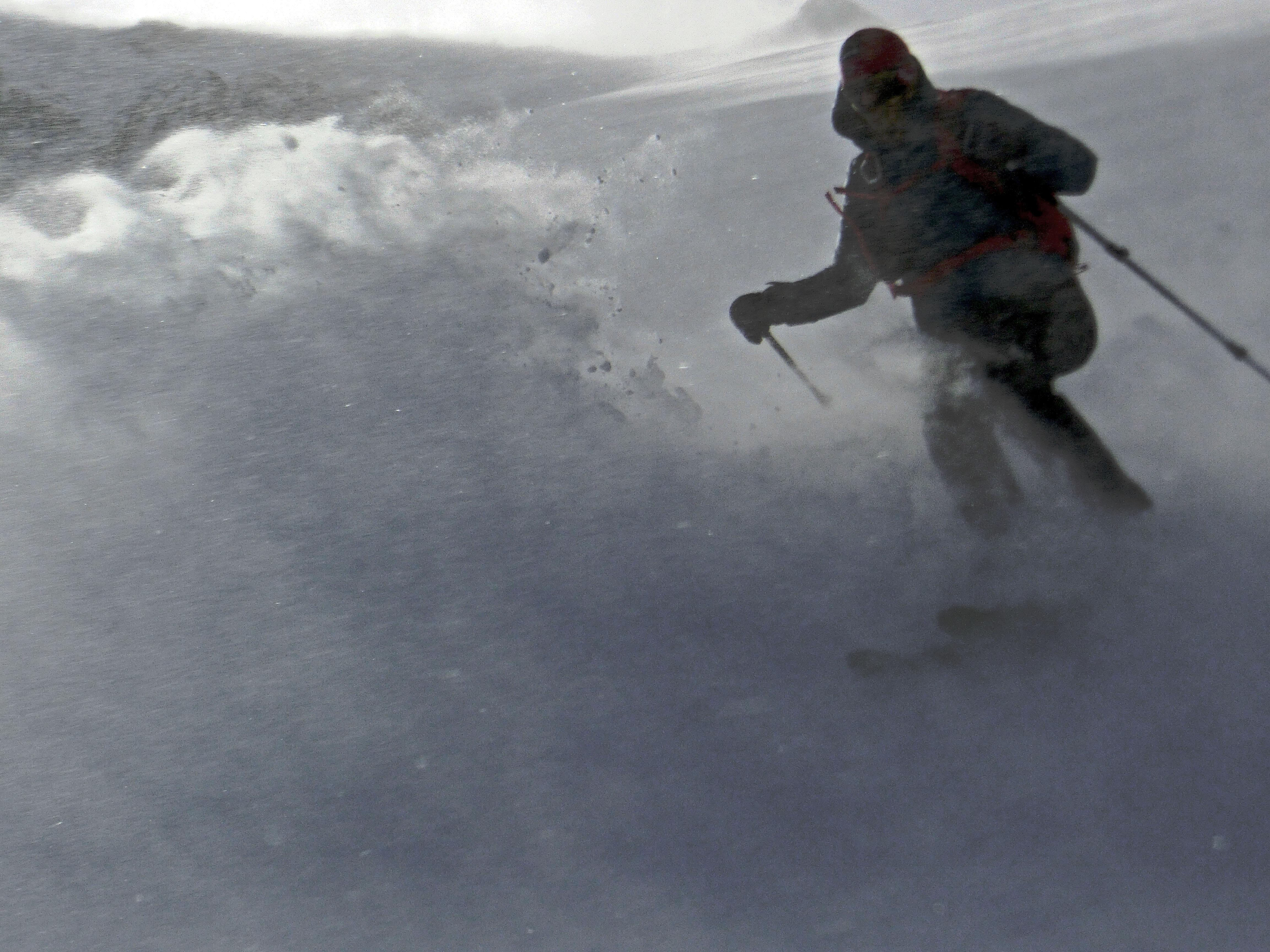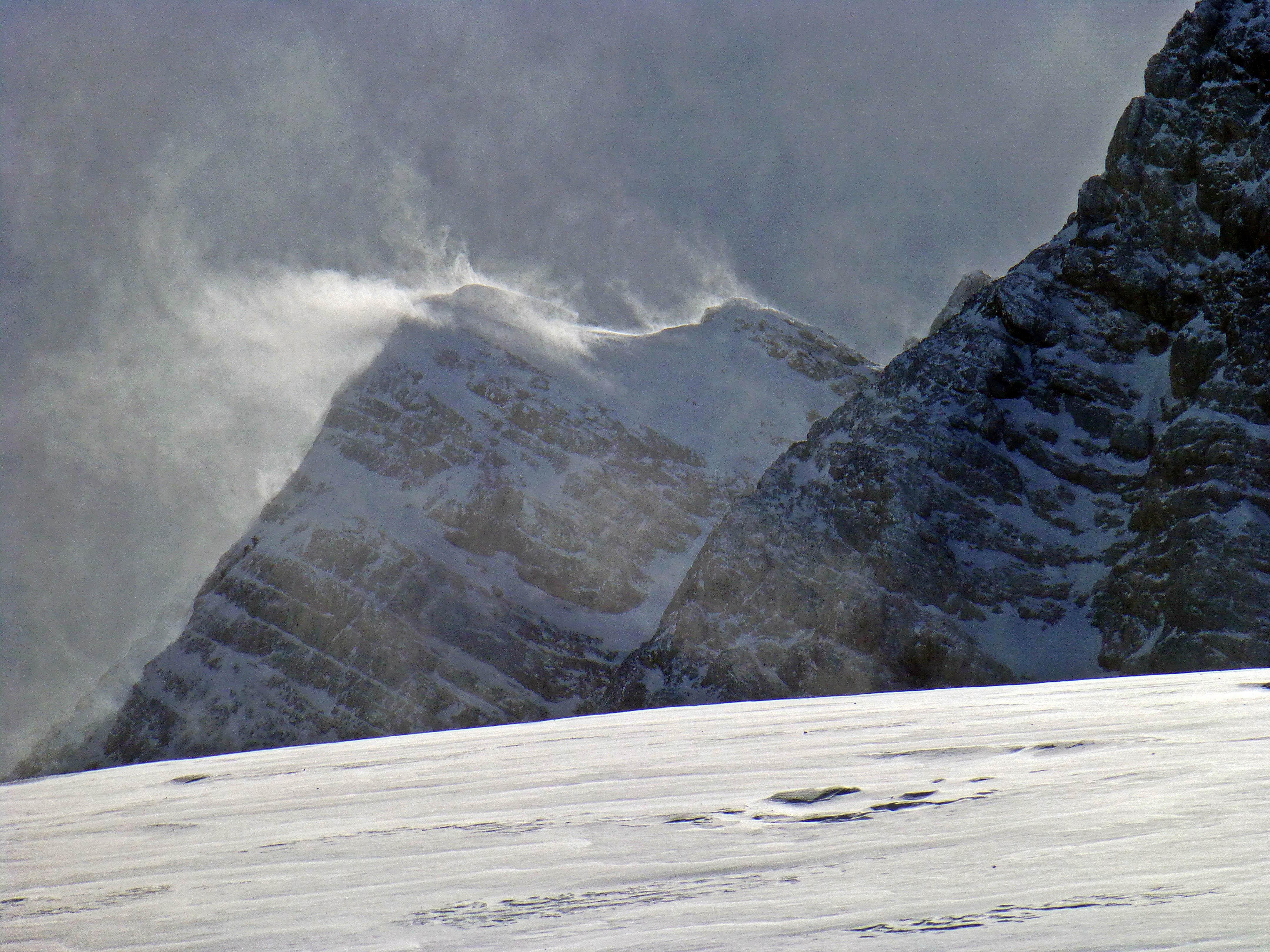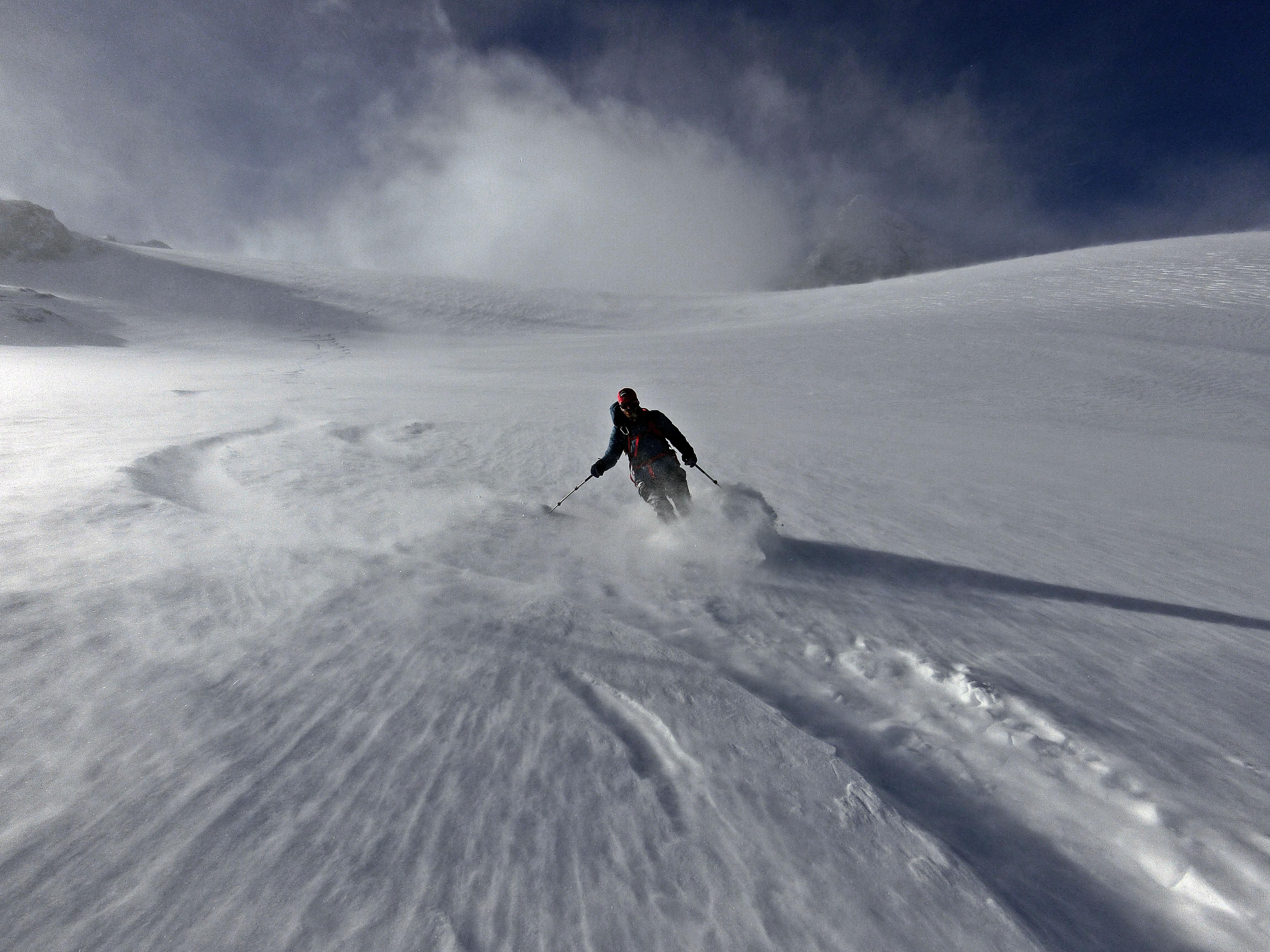 Der stürmische Südwind am Hunerkogel sowie die Tatsache dass wir nur zu dritt in der ersten Gondel waren, ließen uns nur kurz an unserem Vorhaben zweifeln. Vom Vortag her kannten wir die Verhältnisse vor Ort. Daher erhofften wir uns nun bei frühem Aufbruch entsprechend dem Lagebericht reichlich Pulver bei sicherem Untergrund.