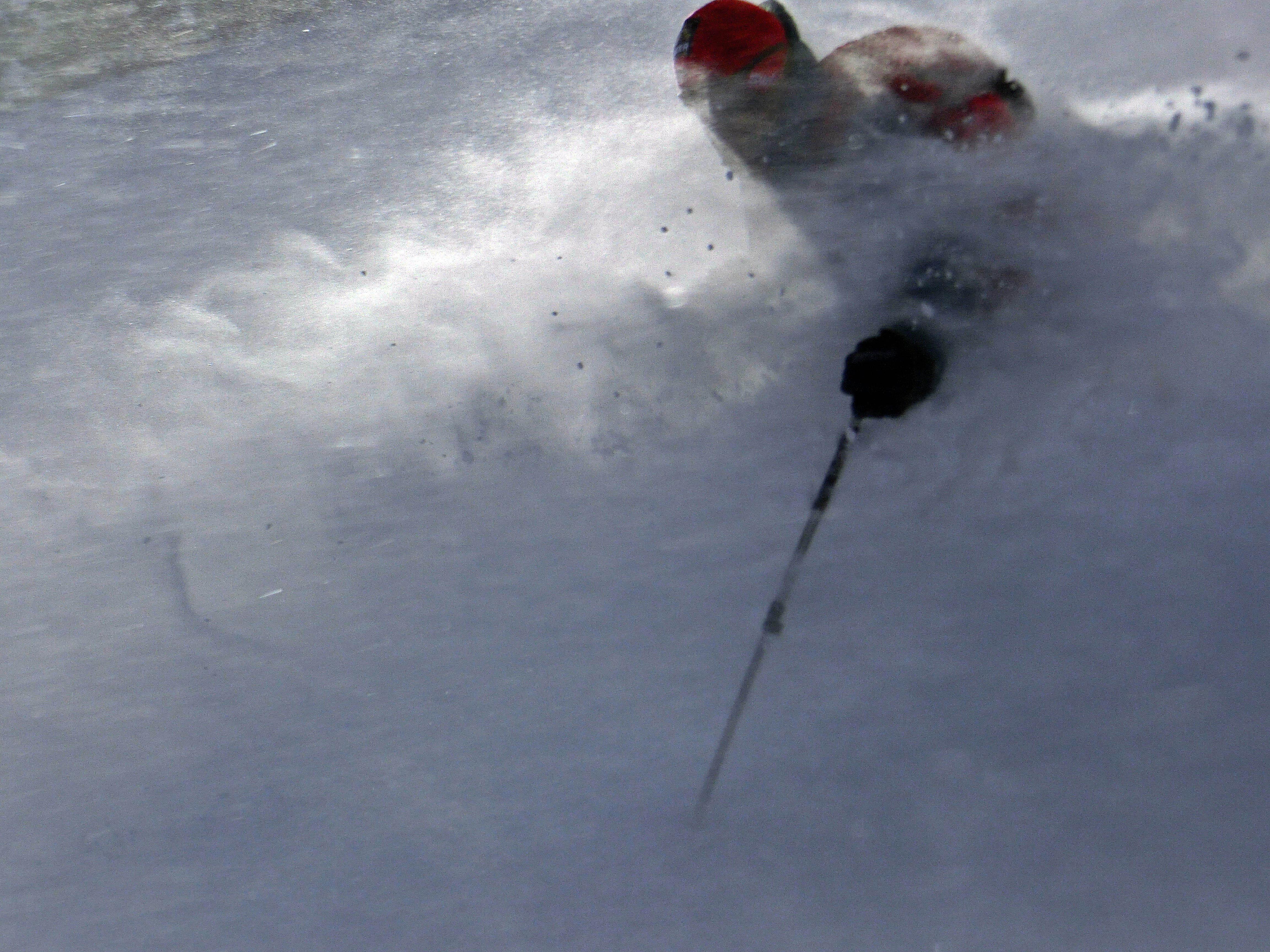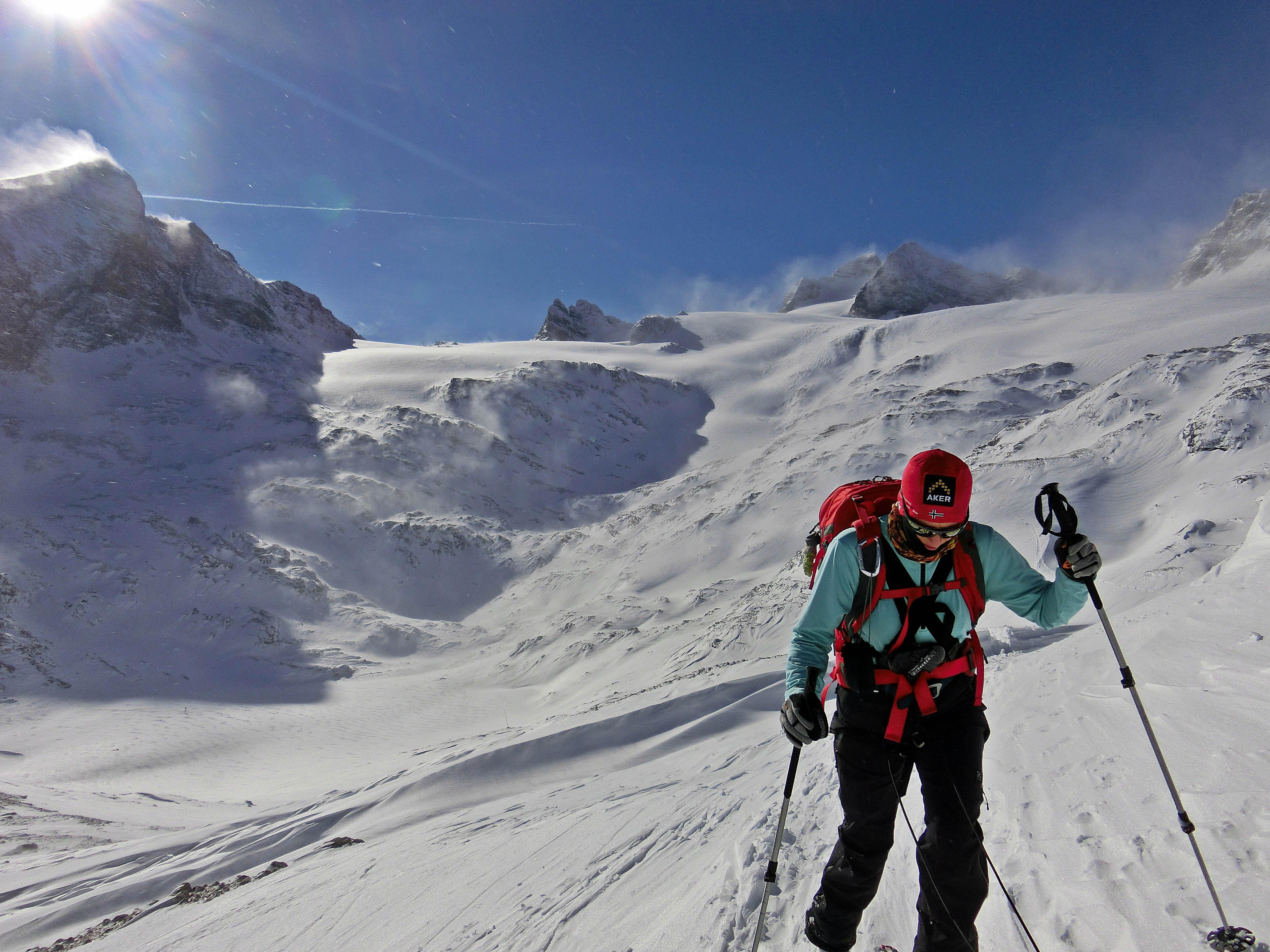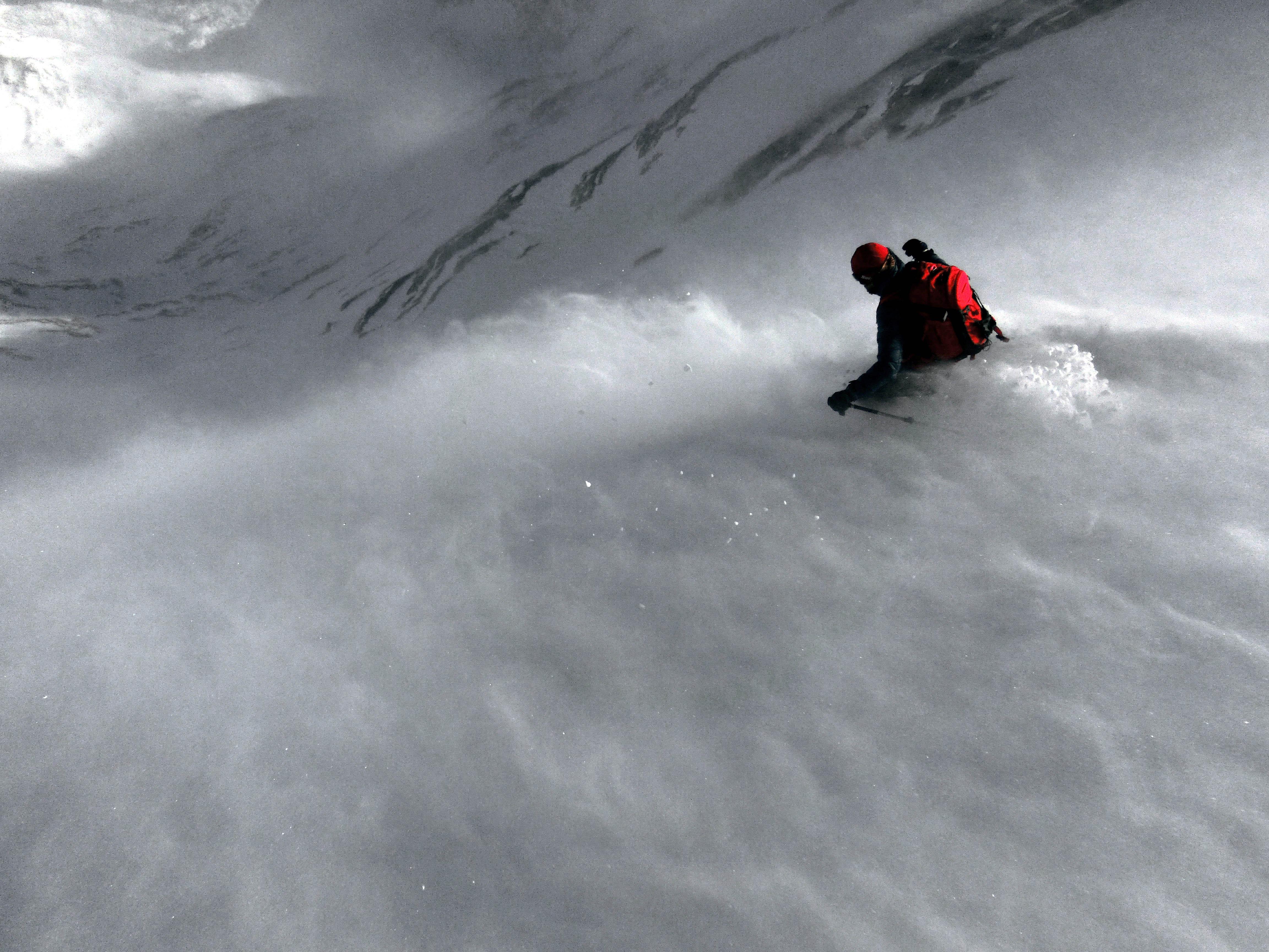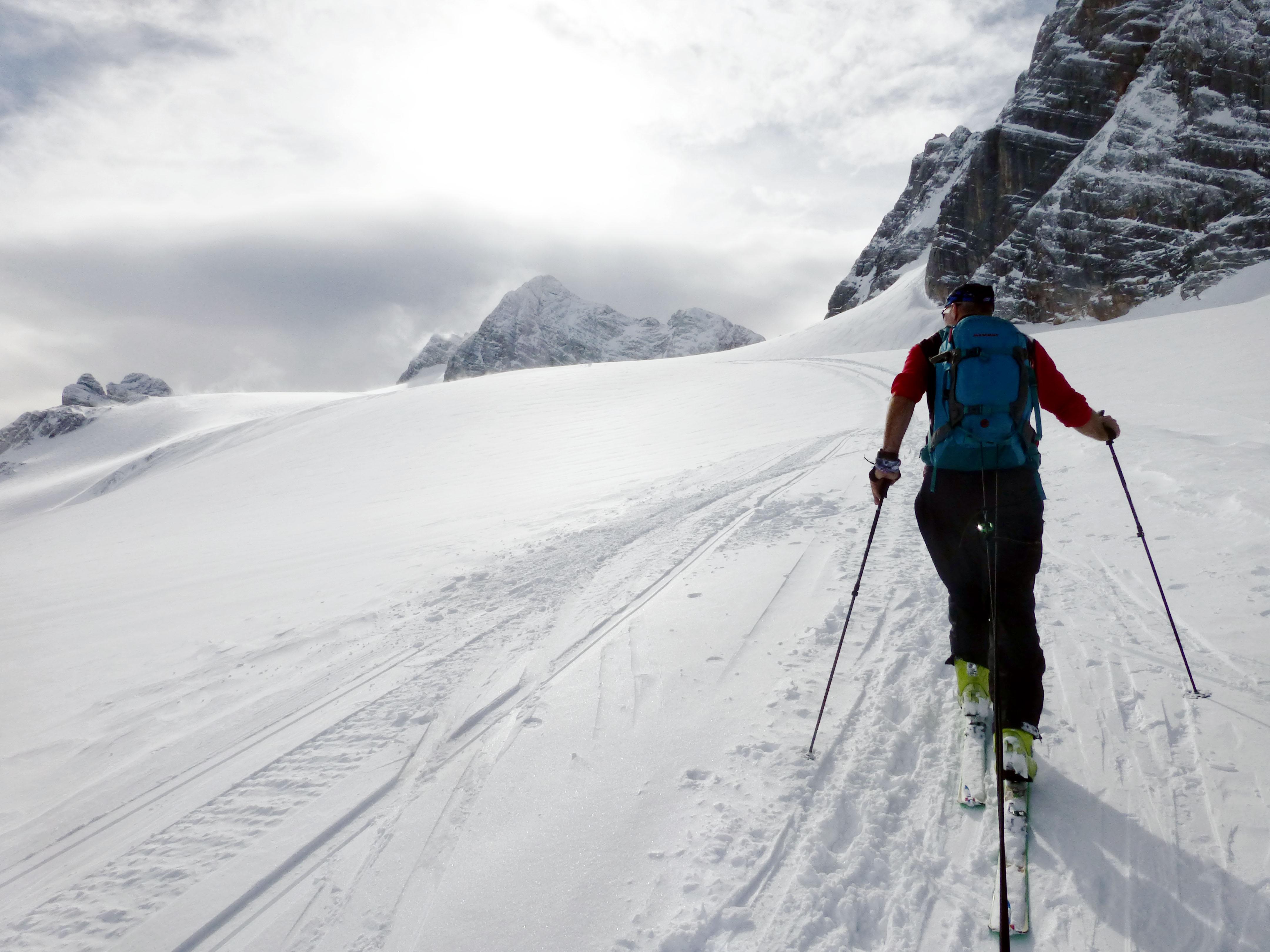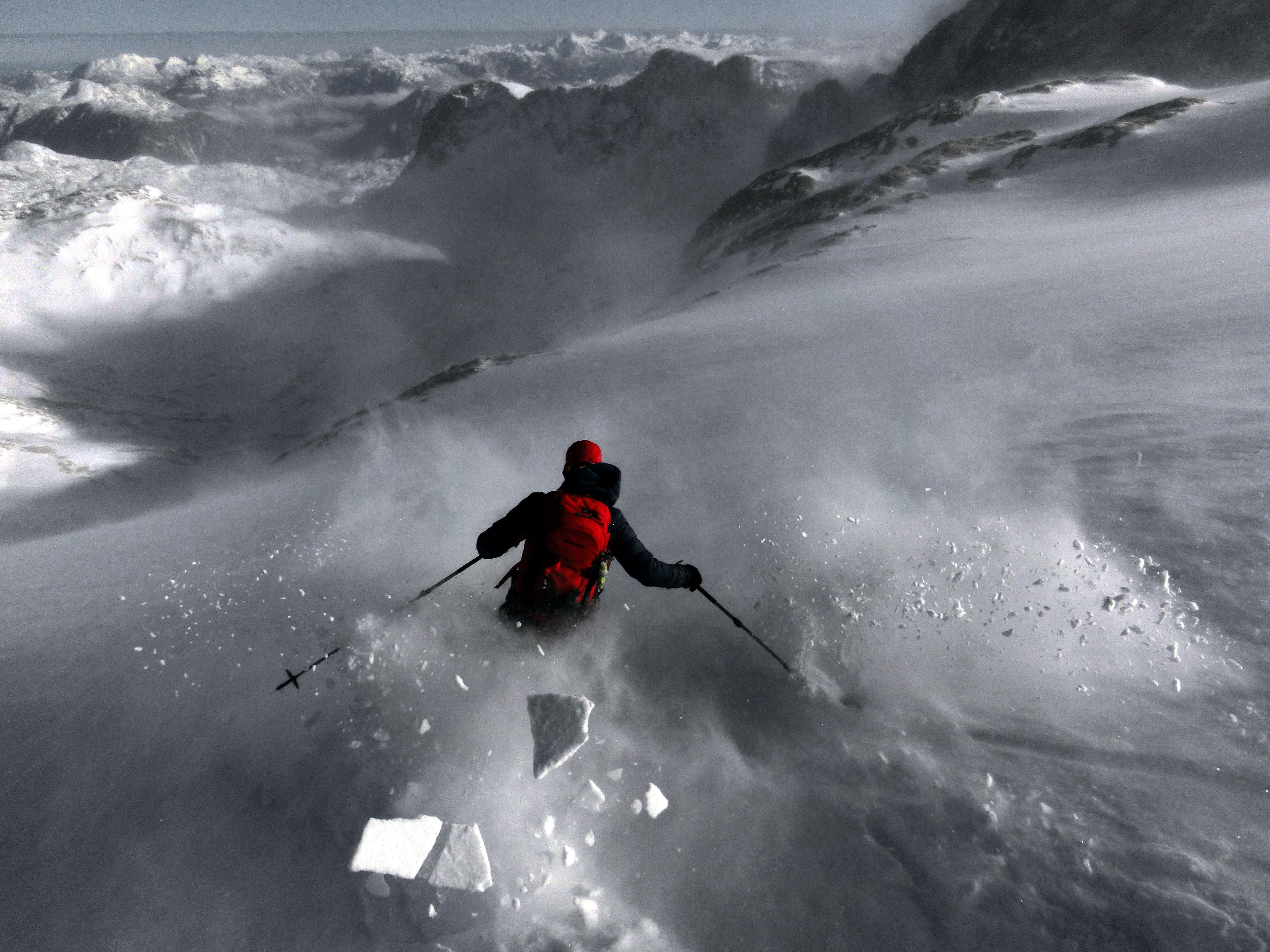Der stürmische Südwind am Hunerkogel sowie die Tatsache dass wir nur zu dritt in der ersten Gondel waren, ließen uns nur kurz an unserem Vorhaben zweifeln. Vom Vortag her kannten wir die Verhältnisse vor Ort. Daher erhofften wir uns nun bei frühem Aufbruch entsprechend dem Lagebericht reichlich Pulver bei sicherem Untergrund.