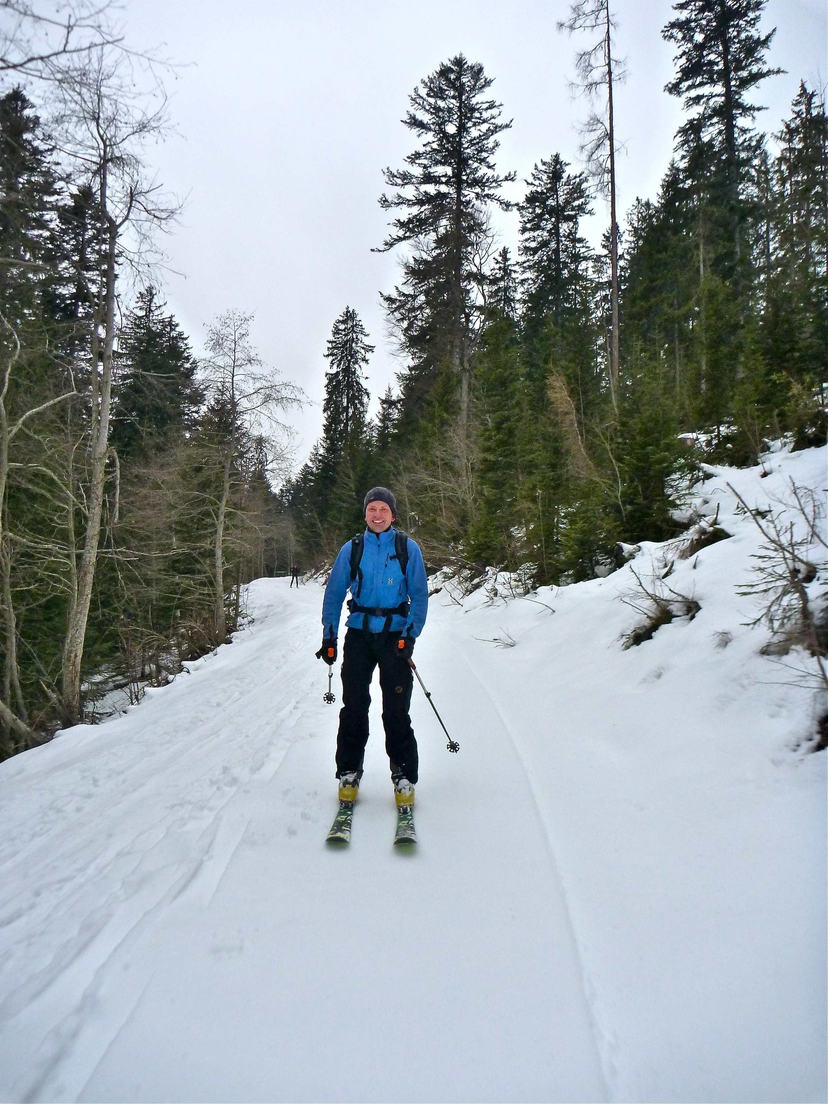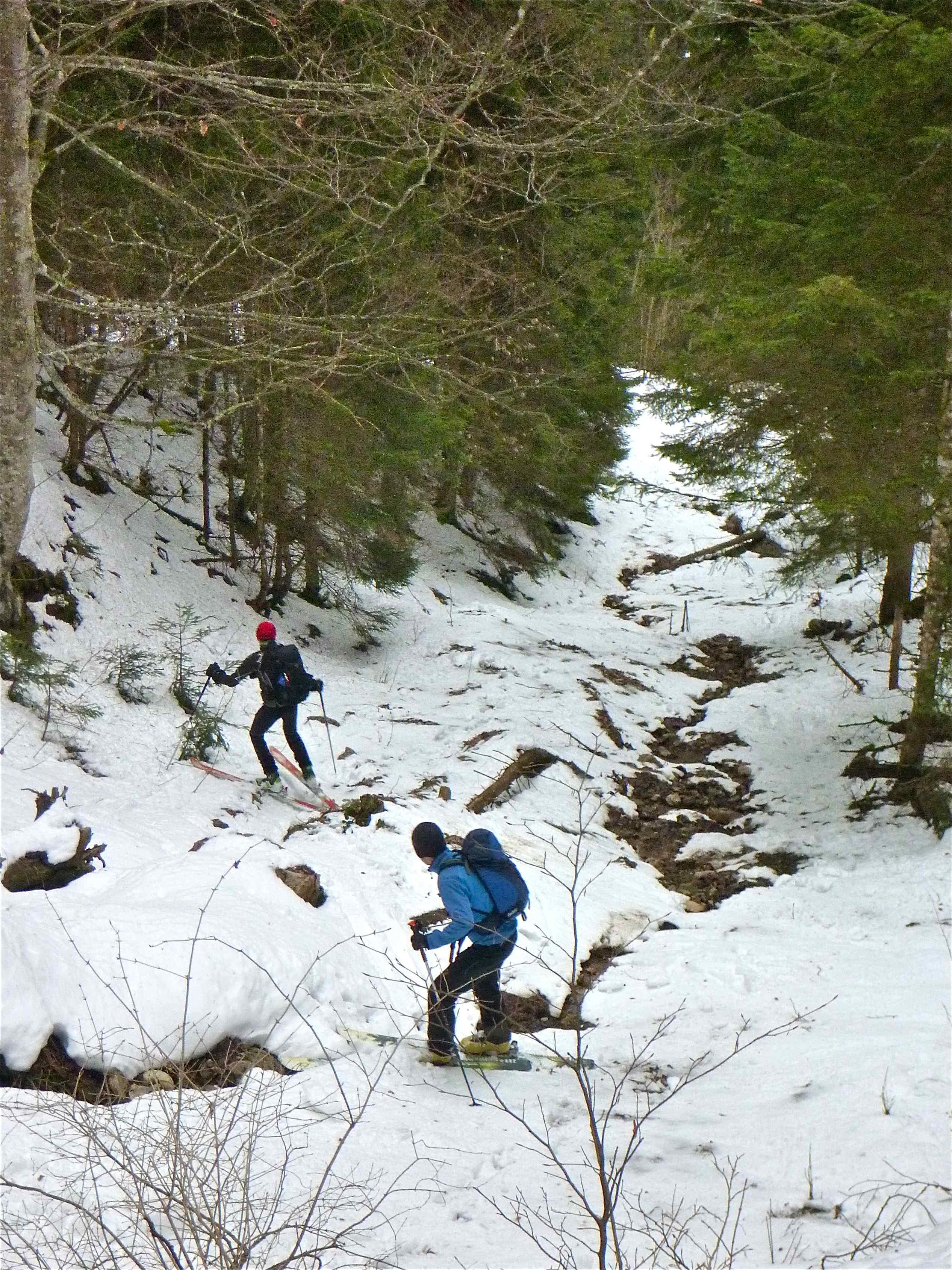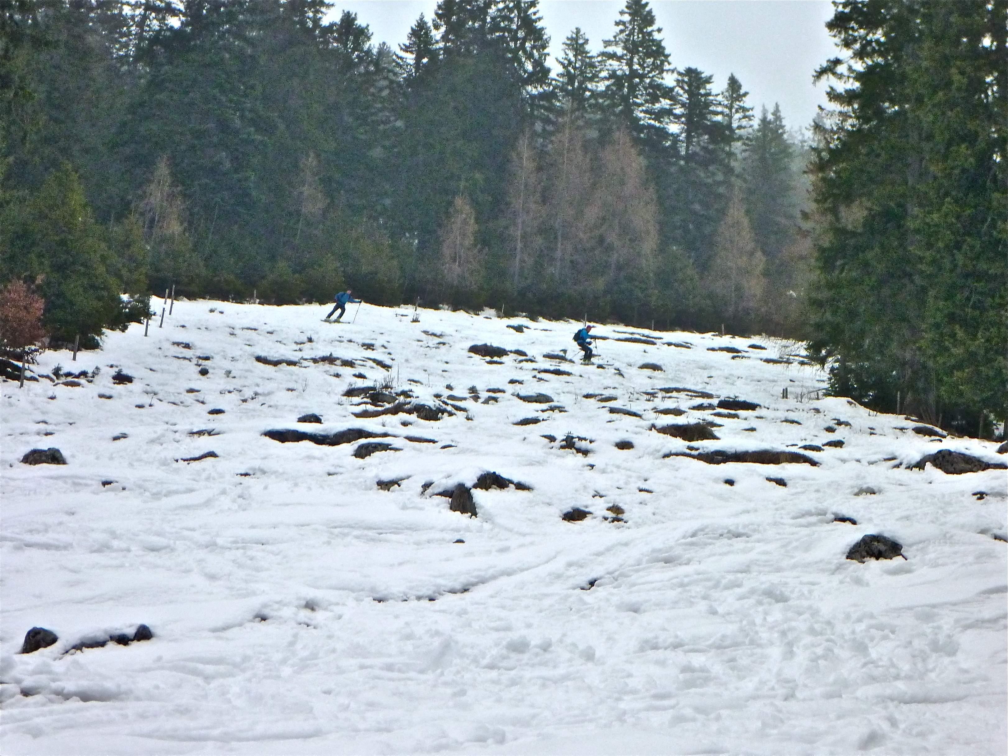 .....also machten wir uns auf Schneesuche. Die Ski konnten direkt am PP in Baumgarten auf 530m angeschnallt werden, und wär es über Nacht nicht kälter geworden, hätten wir auch noch fahrbaren Sulzschnee gefunden. So mussten wir das Skifahren/Snowboarden beinahe neu erfinden, um irgendwie wieder vom Berg zu kommen....