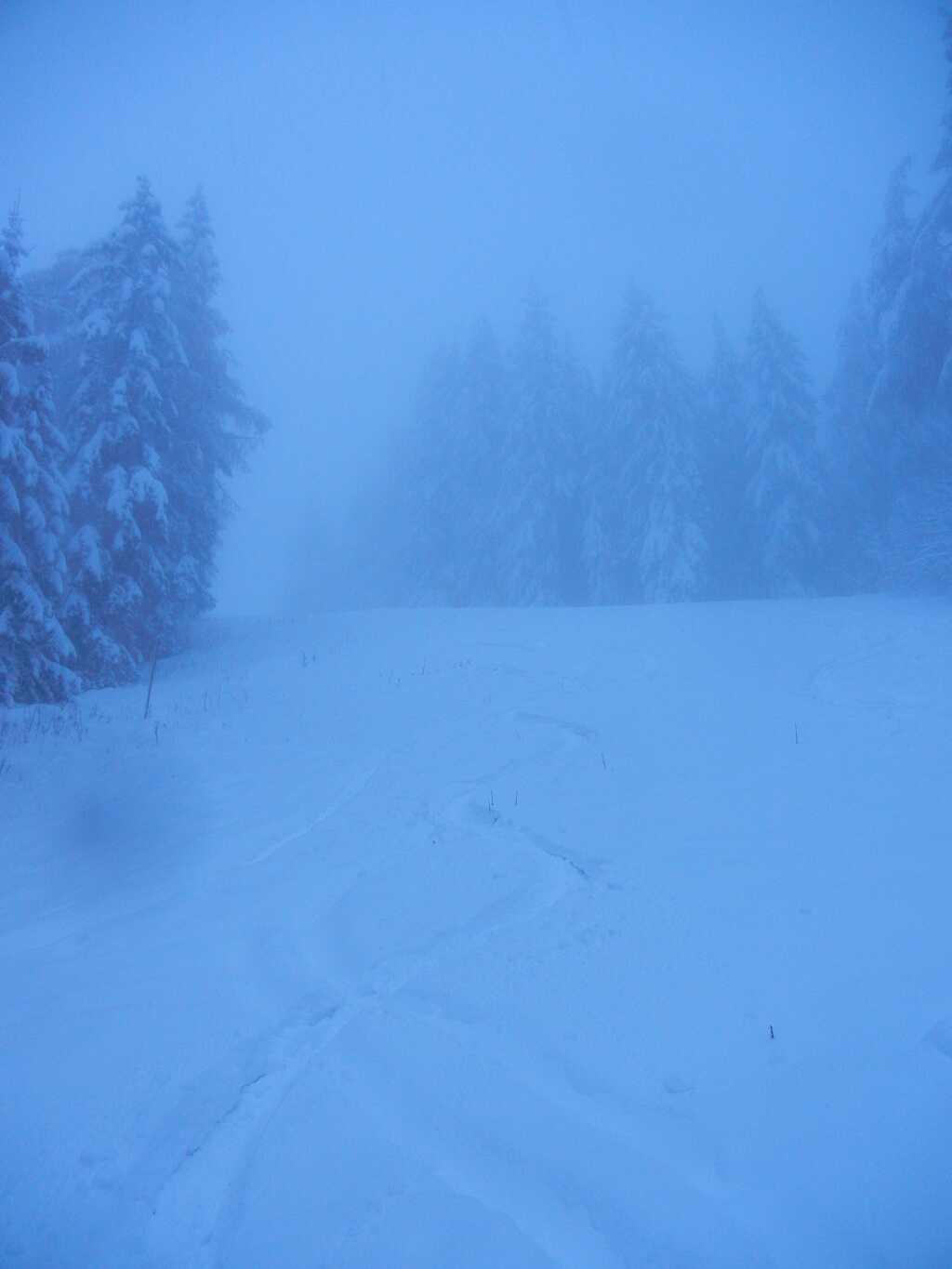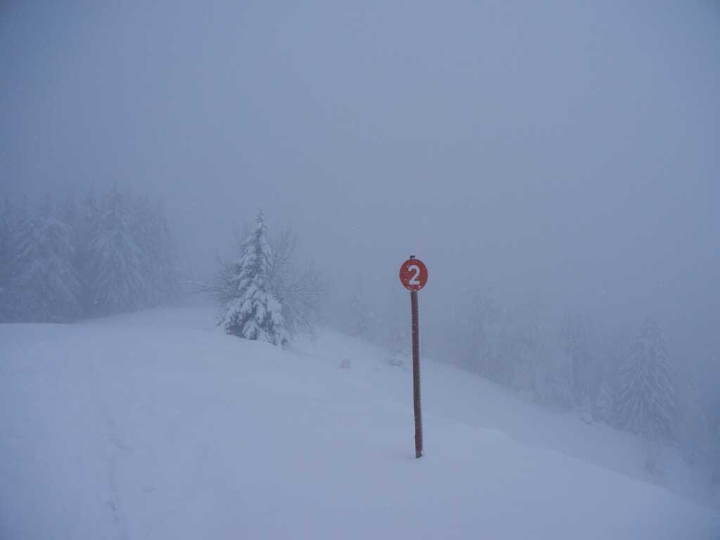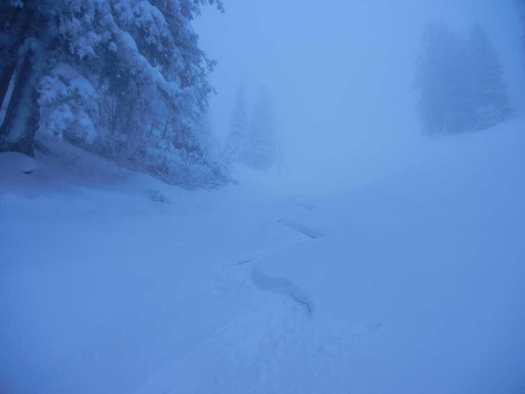Wetter: Trüb mit durchgehend leichtem Schneefall, Sicht ausreichend; oben leichter bis mäßiger Wind aus westl. Richtung, der noch zu keiner Schneeverfrachtung führte.