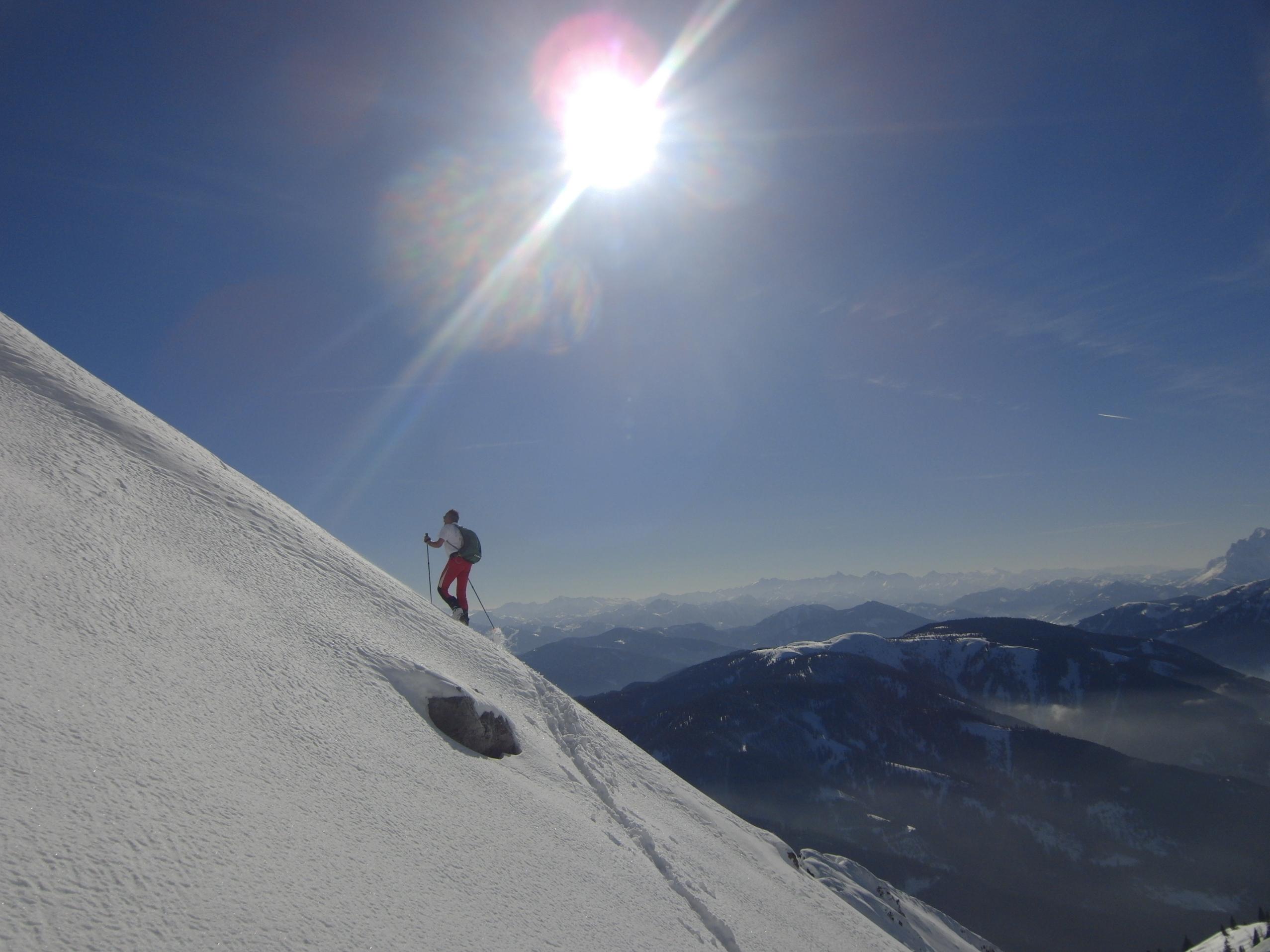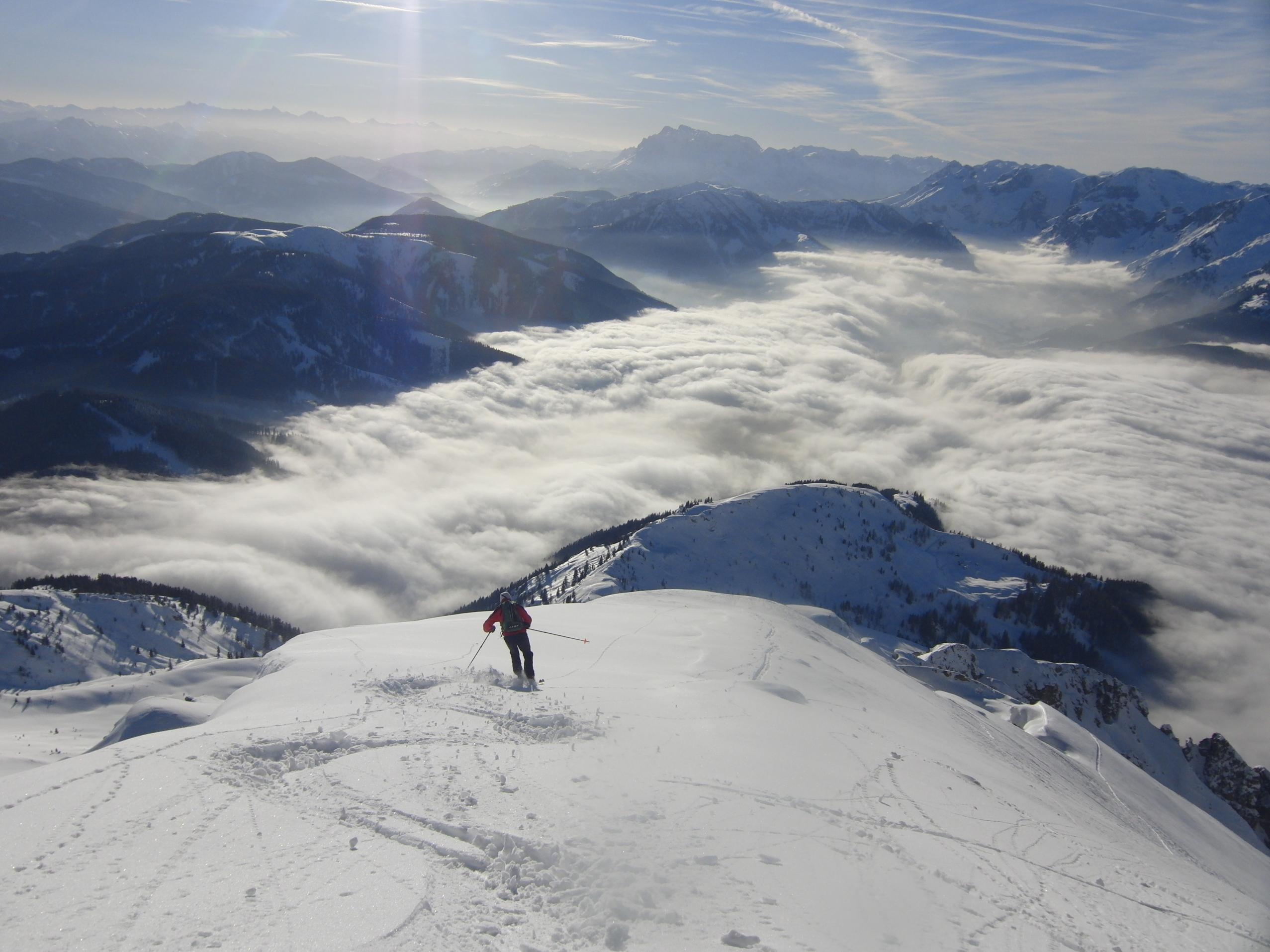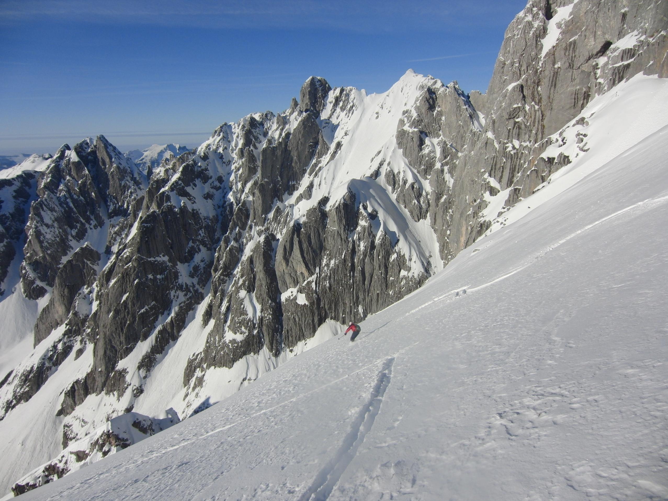 Nach einer arbeitsintensiven Woche gehts um ca. 14:00 mit Hias vom Pommer über die Lochalm, Kampl, Südsteilrinne und Bärmad an den Wandfuss der Kleinen Bischofsmütze. Abfahrt um kurz vor 16:30 über die Bärmad in das Stuhlloch.