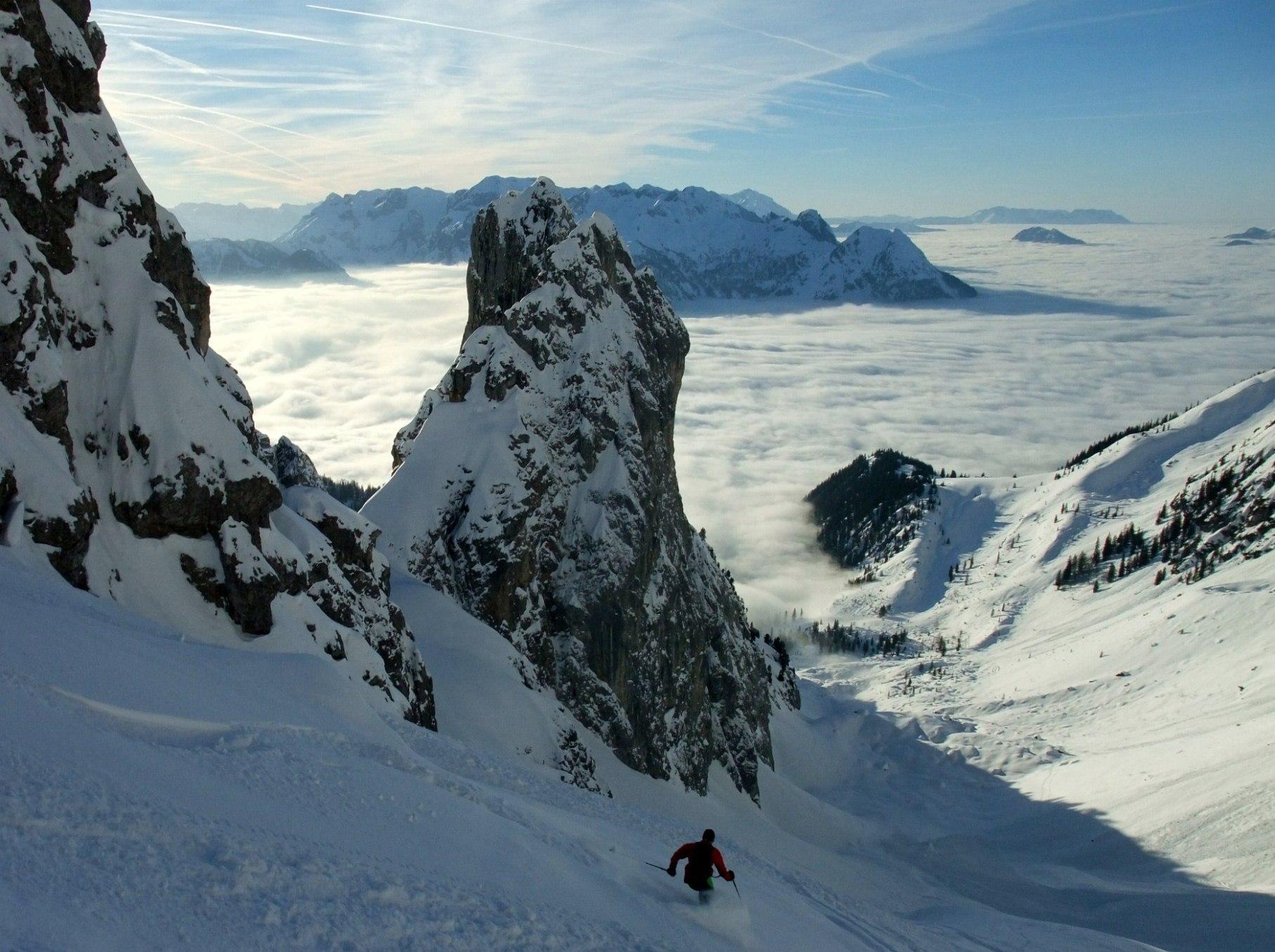 Schnee-Situation: Hias hat schattseitig einen Pulver prophezeit - ich habs nicht geglaubt, aber er hat recht gehabt. Sonnseitig z.T. schon recht guter Firn. Schattseitig bis ca. 1500 einwandfreier Pulver, darunter schon etwas angegriffen.In der Bärmad nicht unkritischer Schwimmschnee.