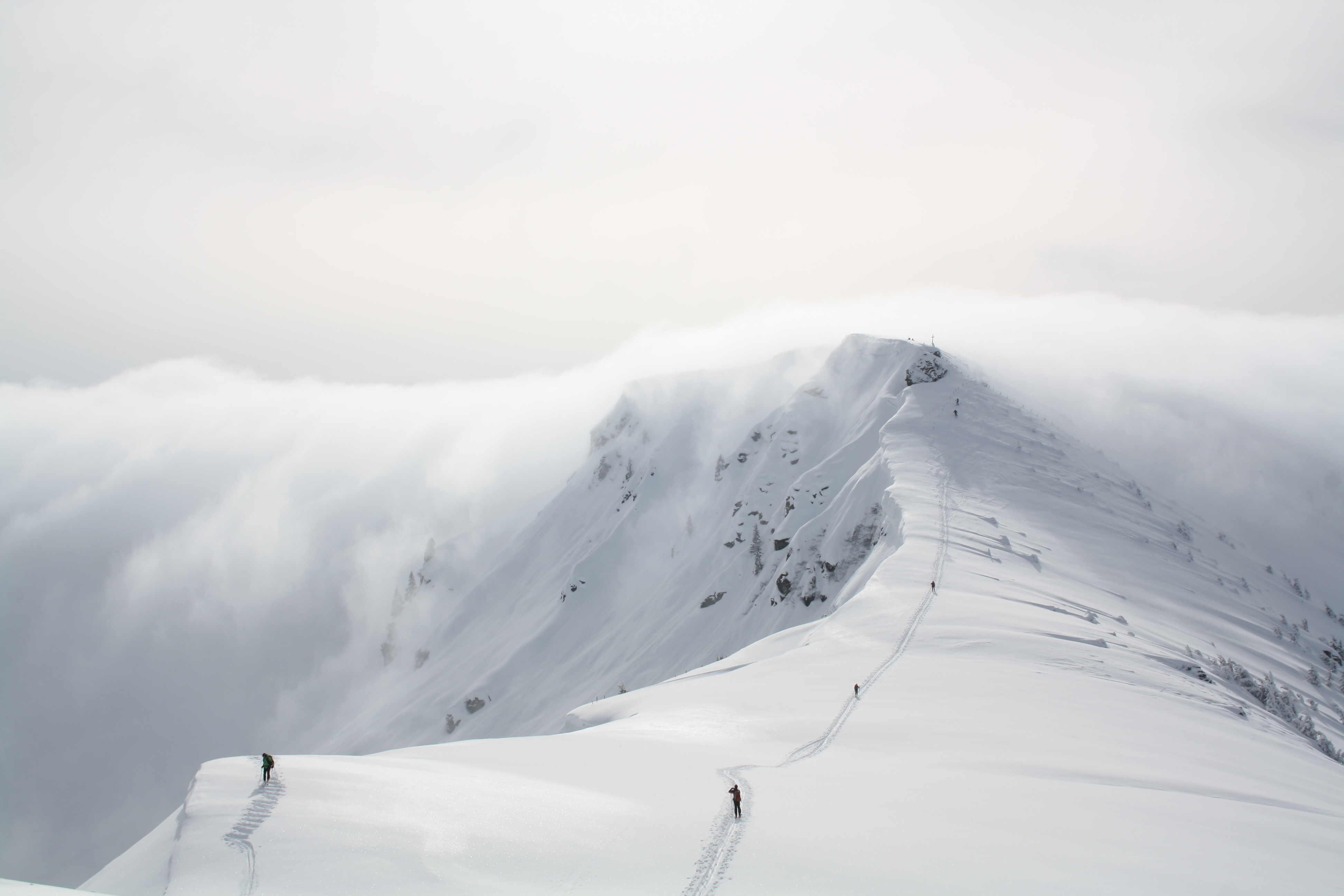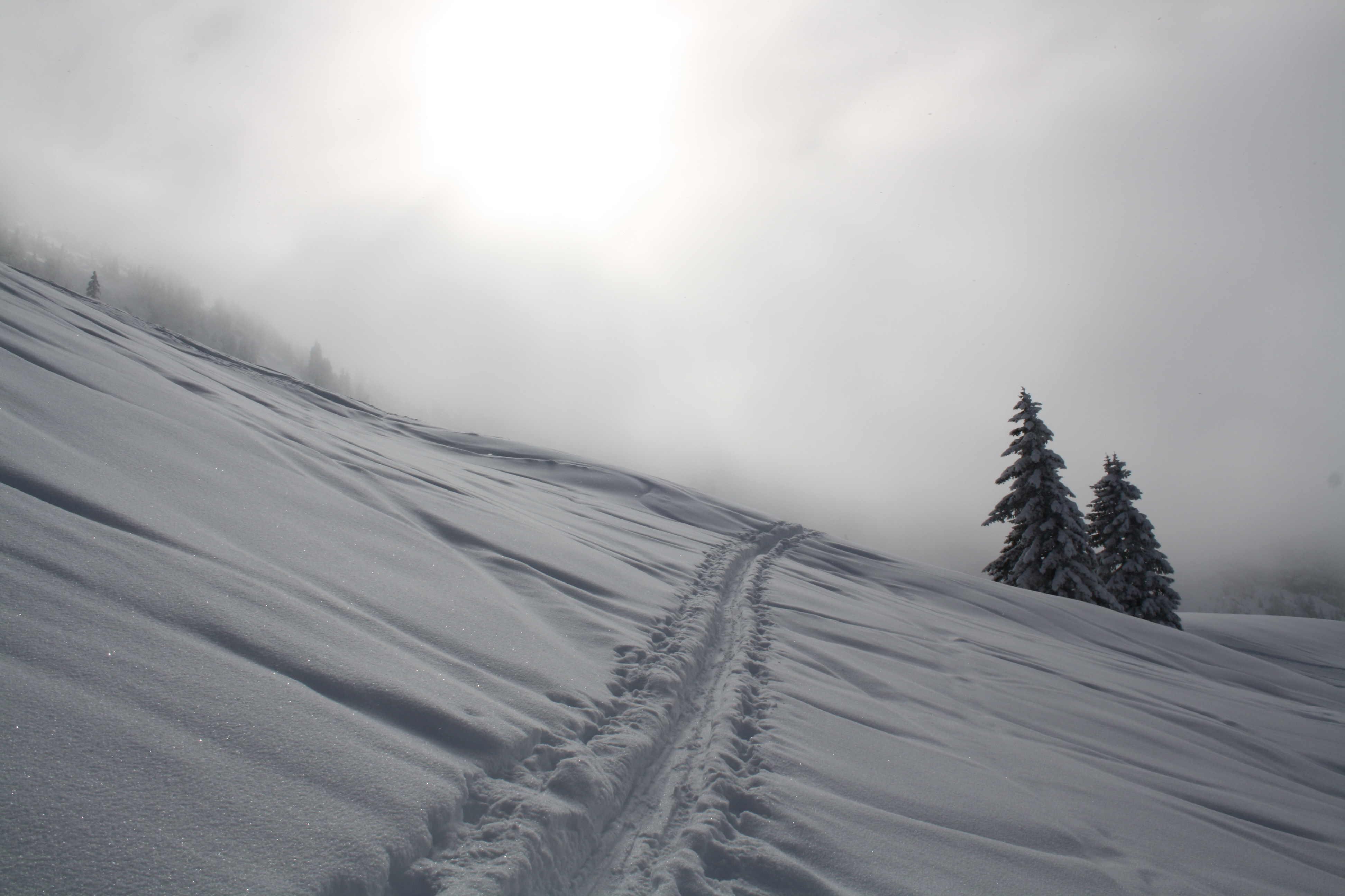Bei der Abfahrt staubt der kalte, lockere Pulverschnee. Dass die letzte Wiese schon etwas zerfurcht ist, und sich das hier durch die geringere Neuschneeauflage auch bemerkbar macht, stört das Vergnügen nicht.