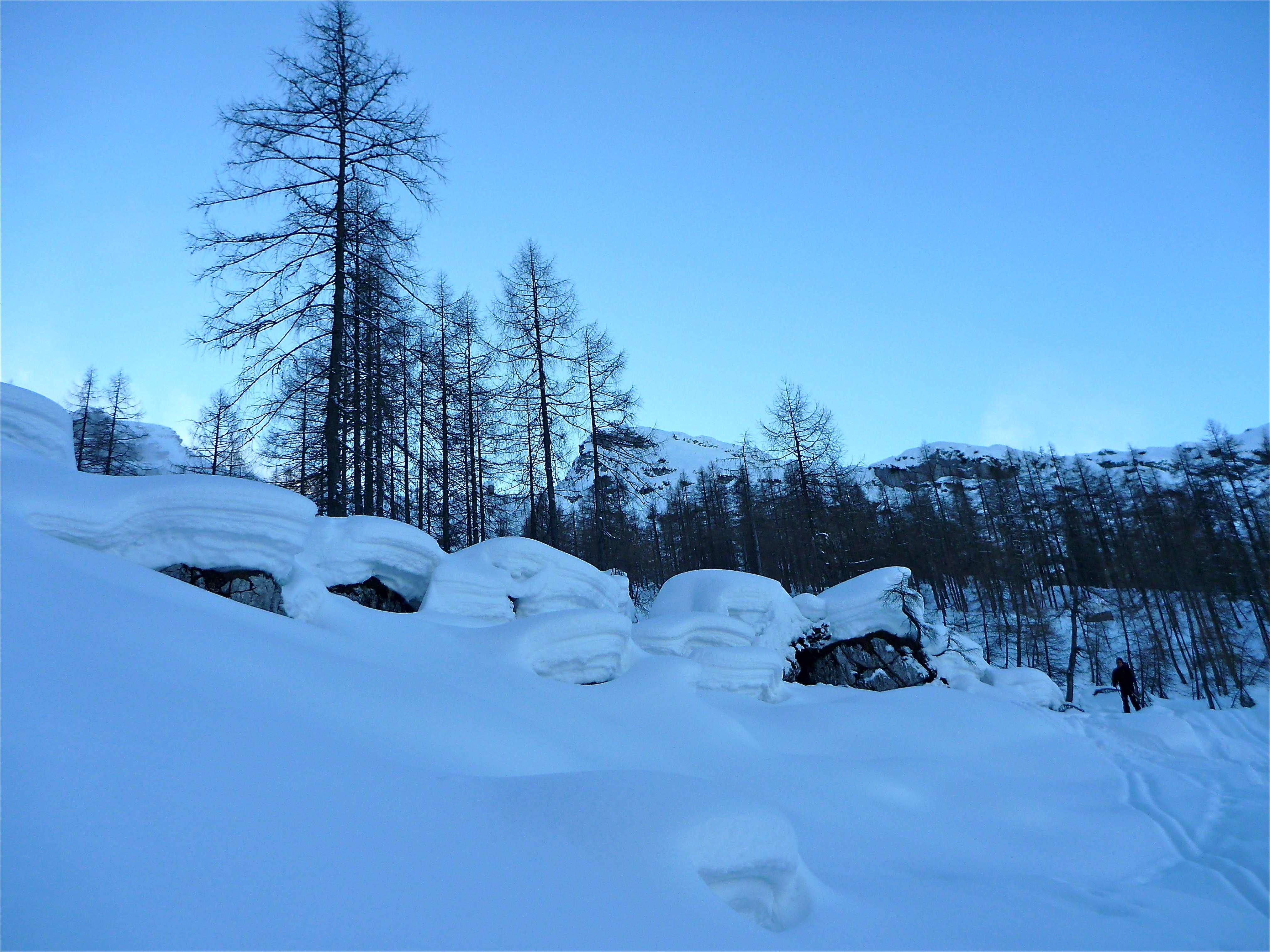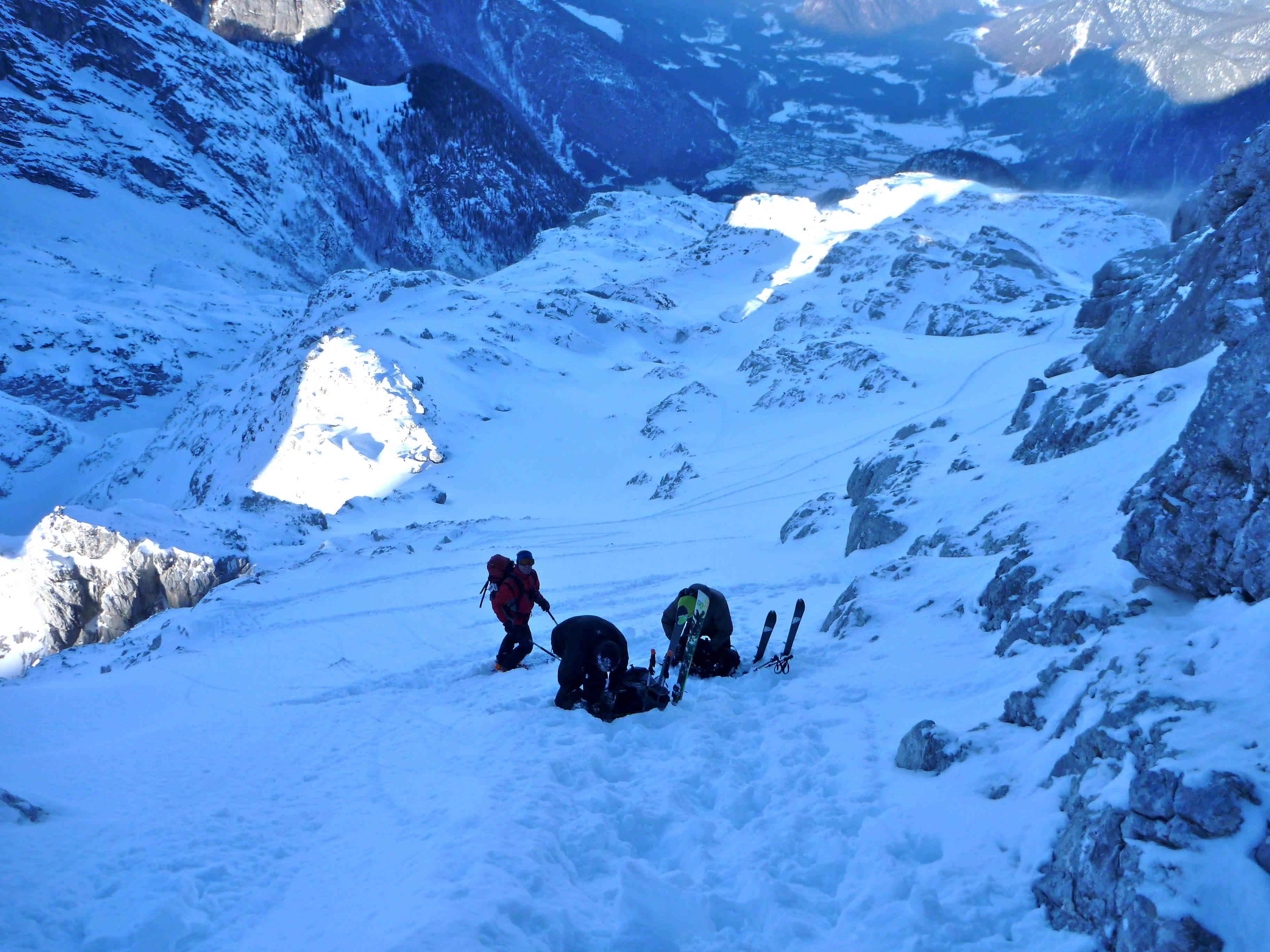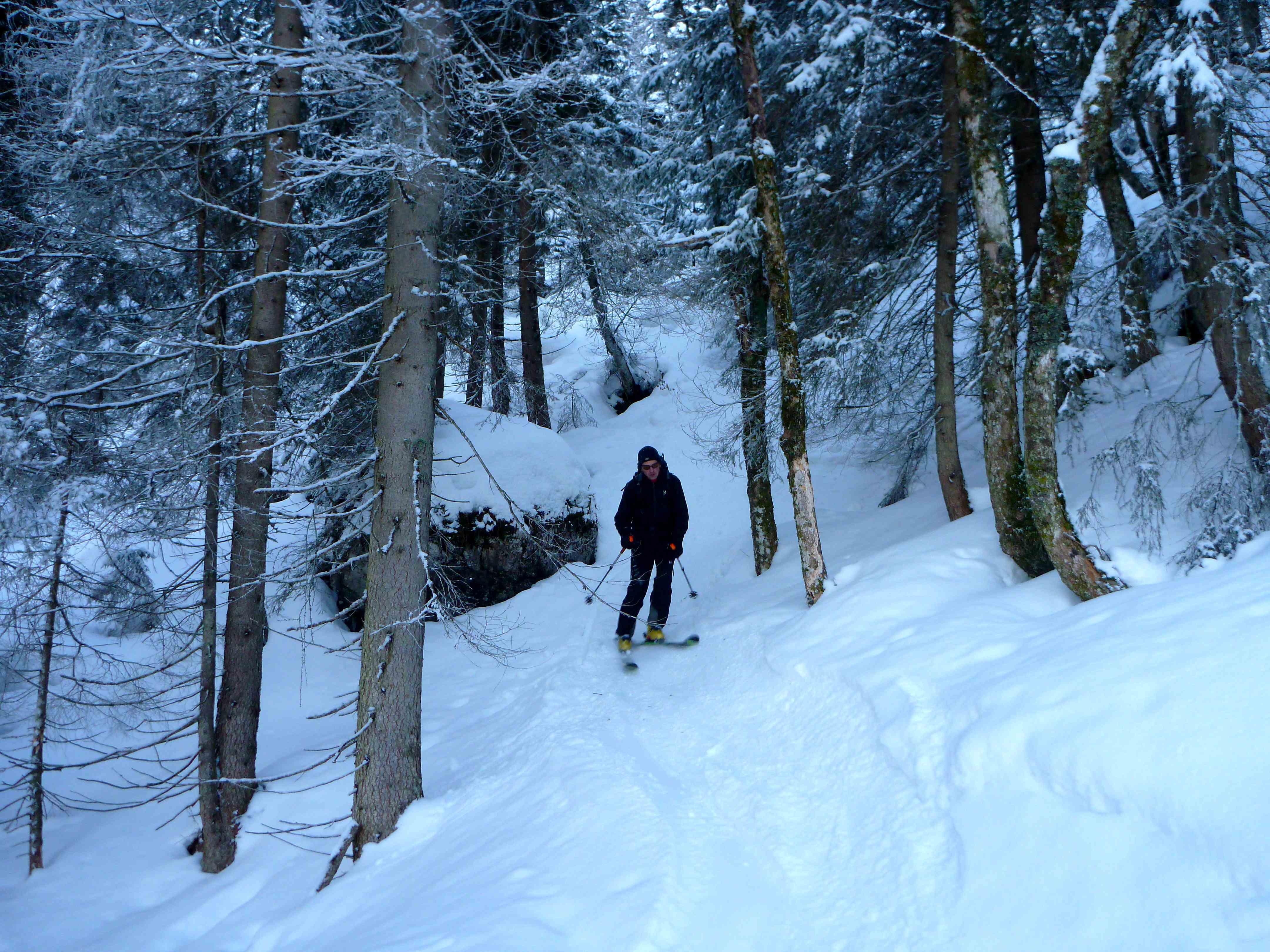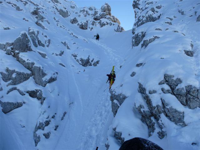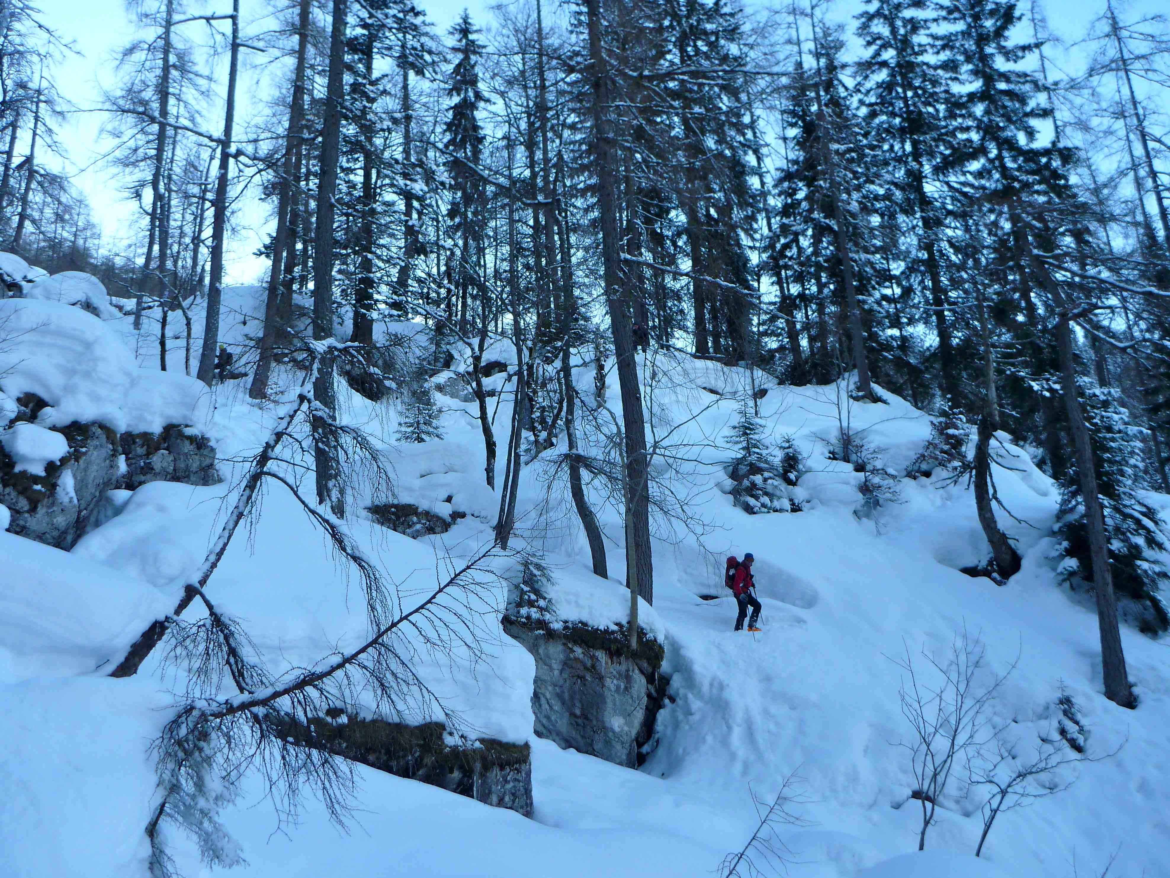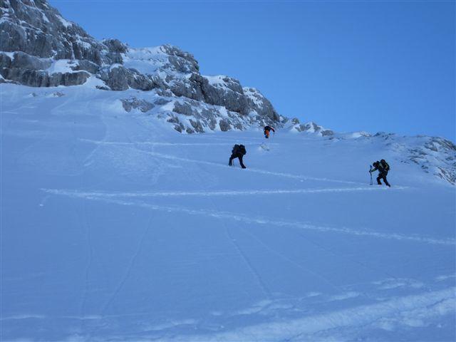 Forststraße, freie Schläge, dicht bewachsenen Steilwald, geniale Pulverhänge, fesldurchsetztes Gelände mit bis zu 50°, Kletterstellen, Stapferei, 2-stellige Minusgrade, Wind, Schatten, Sonnenschein am Gipfel, 4 tolle Bergkameraden