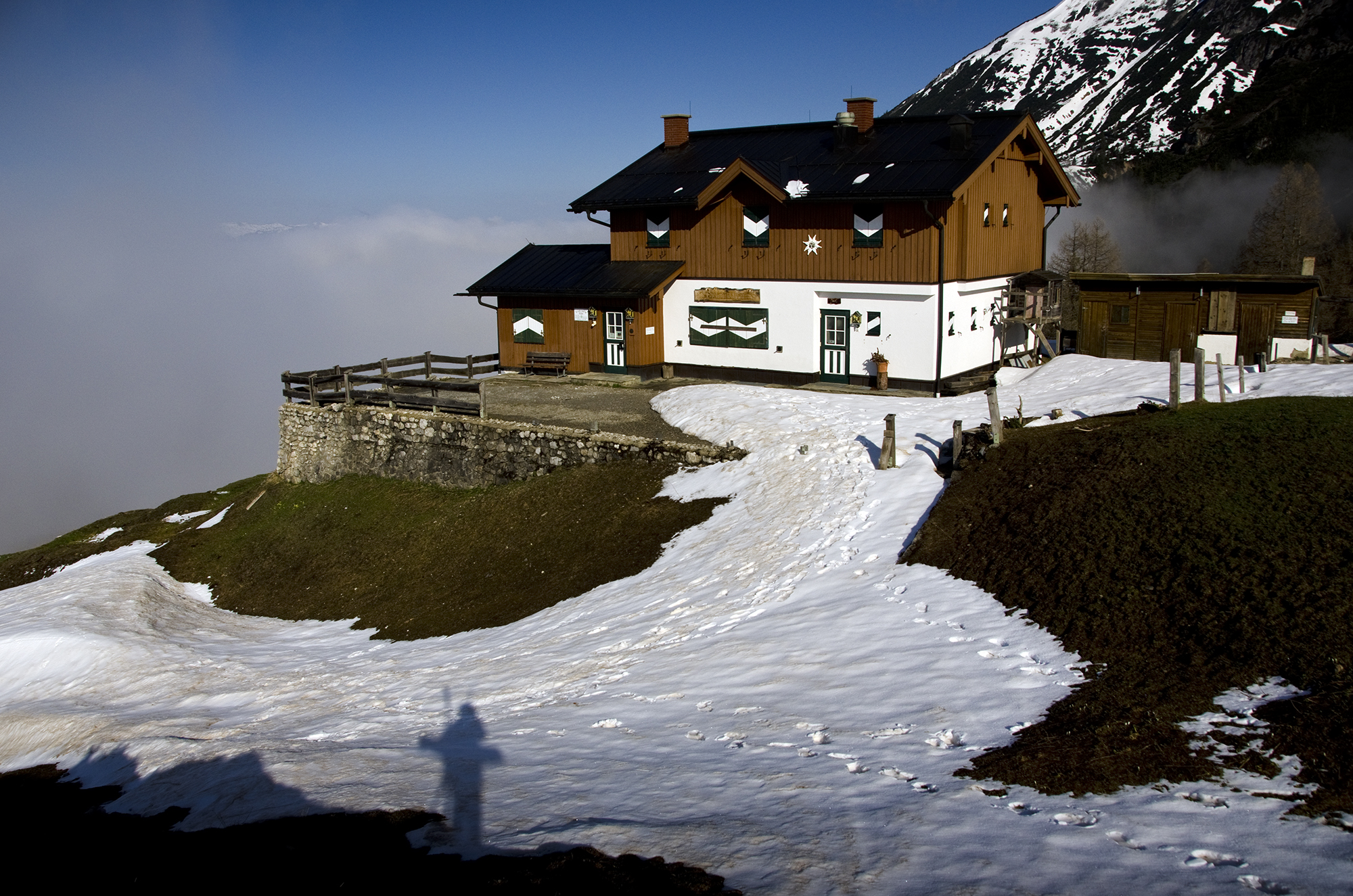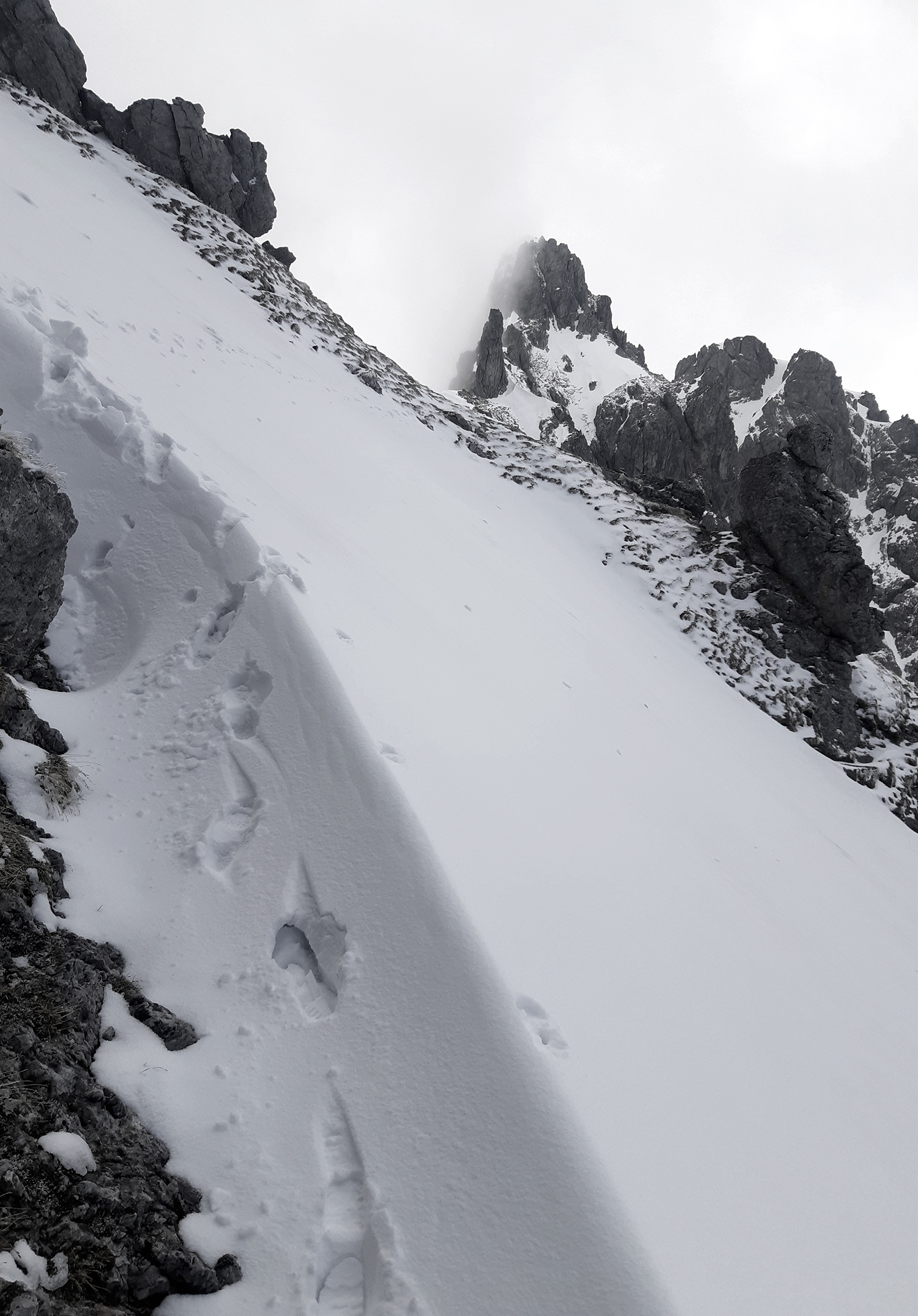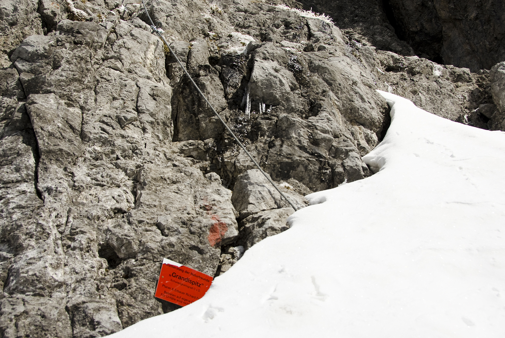 Wenn die Wiesen nicht mehr vom Schnee weiß werden, sondern von Krokussen, und wenn das Kar über der Erichhütte einsam und menschenleer geworden ist, kann man auf die Grandlspitz steigen. Die Gämsen fliehen nicht mehr, sondern schauen neugierig herüber. Das steile lawinengefährliche Schneefeld in der Querung zum Einstieg  des Klettersteigs ist fast ganz aper.