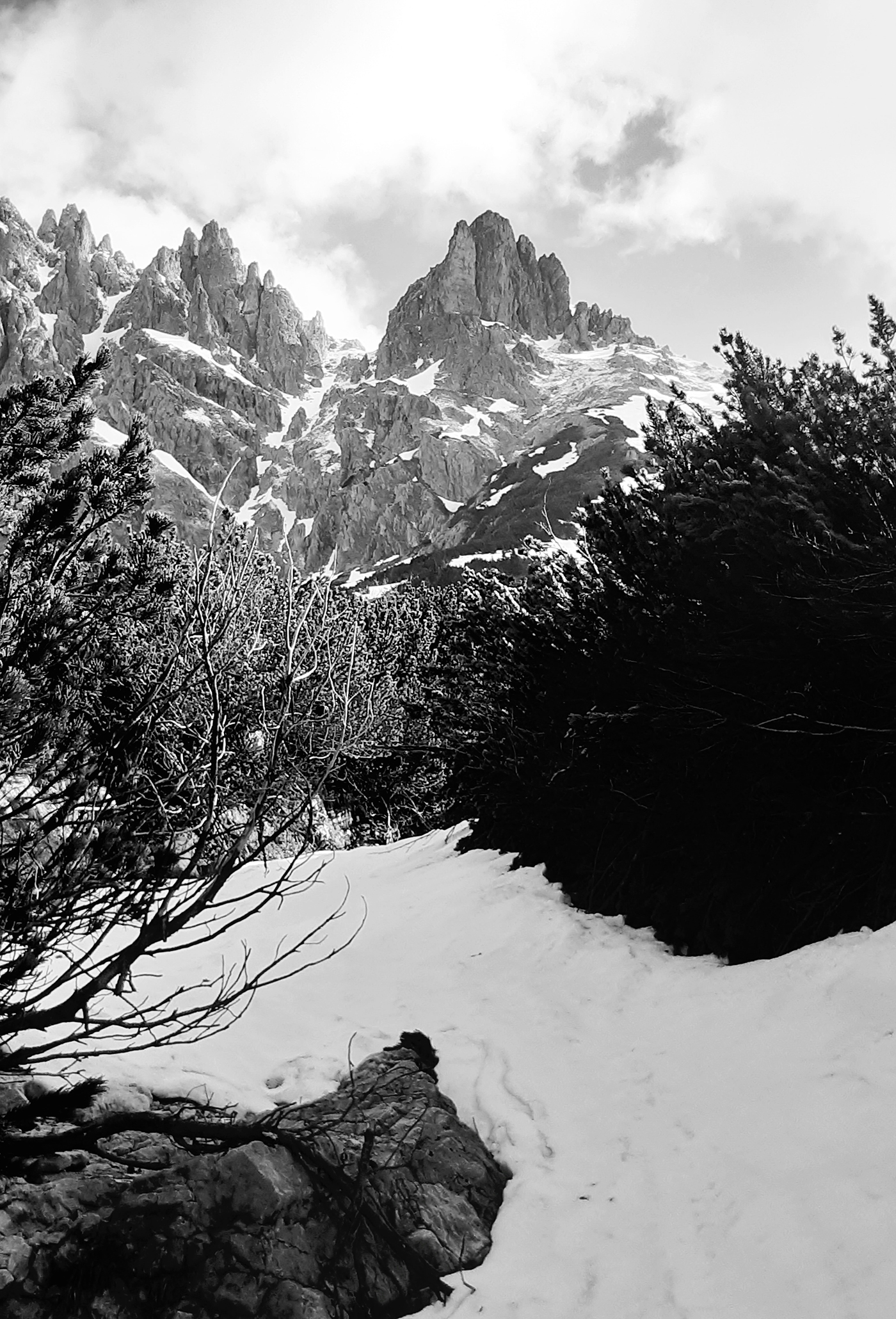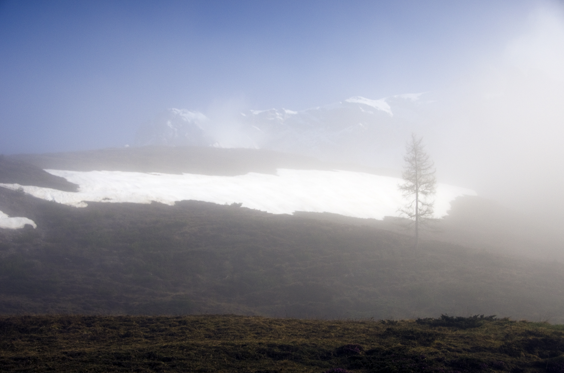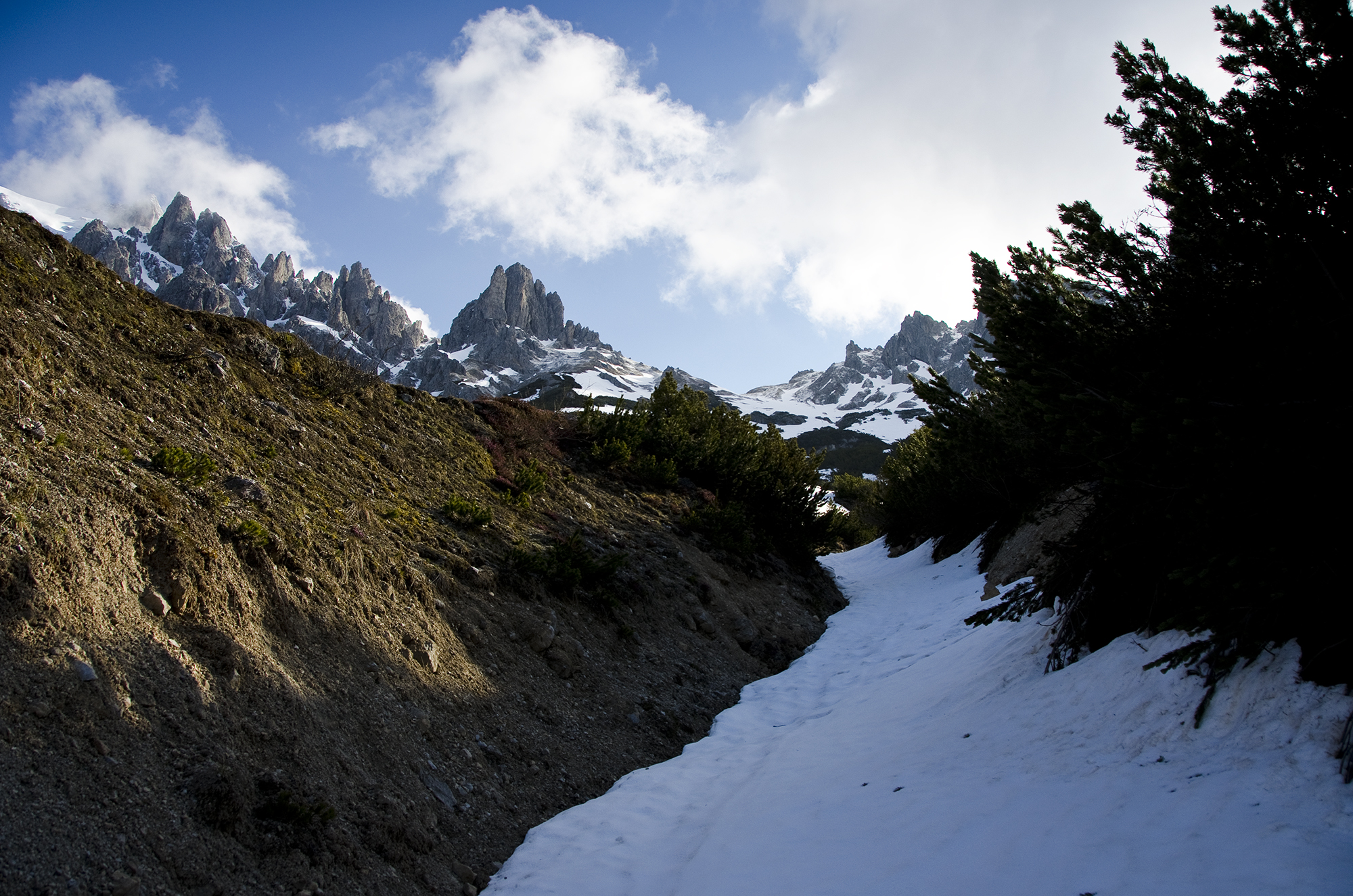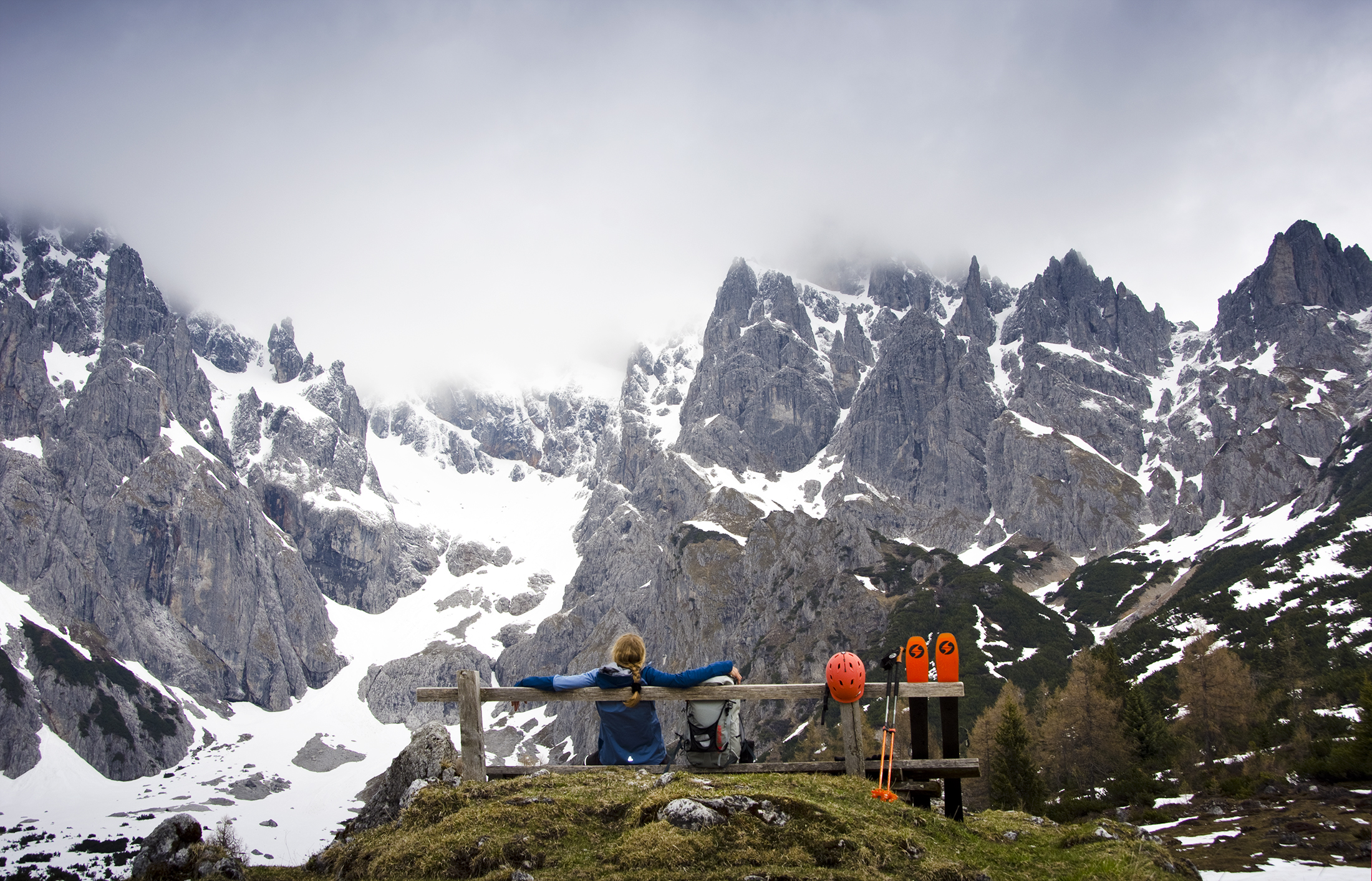 Wenn die Wiesen nicht mehr vom Schnee weiß werden, sondern von Krokussen, und wenn das Kar über der Erichhütte einsam und menschenleer geworden ist, kann man auf die Grandlspitz steigen. Die Gämsen fliehen nicht mehr, sondern schauen neugierig herüber. Das steile lawinengefährliche Schneefeld in der Querung zum Einstieg  des Klettersteigs ist fast ganz aper.