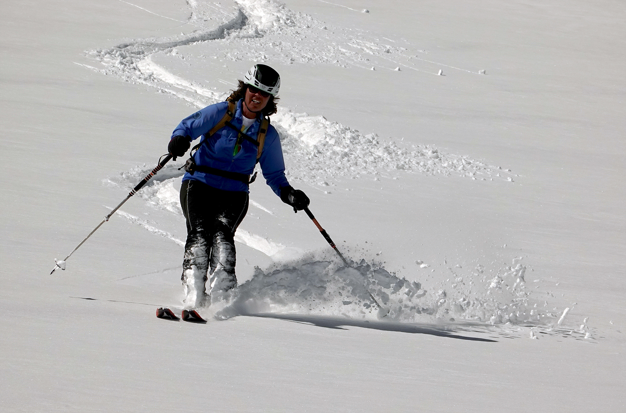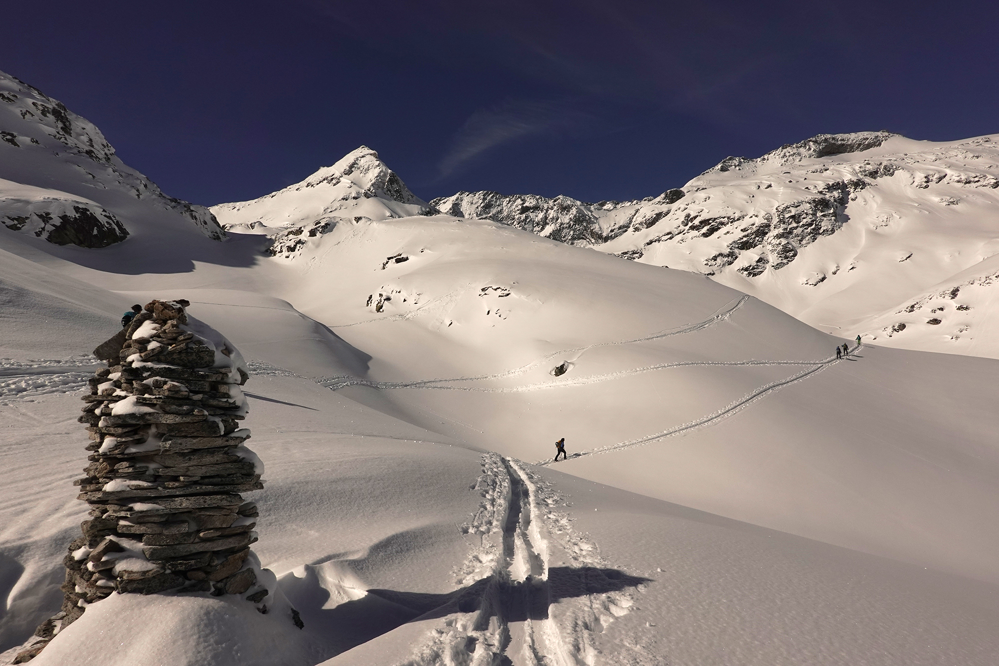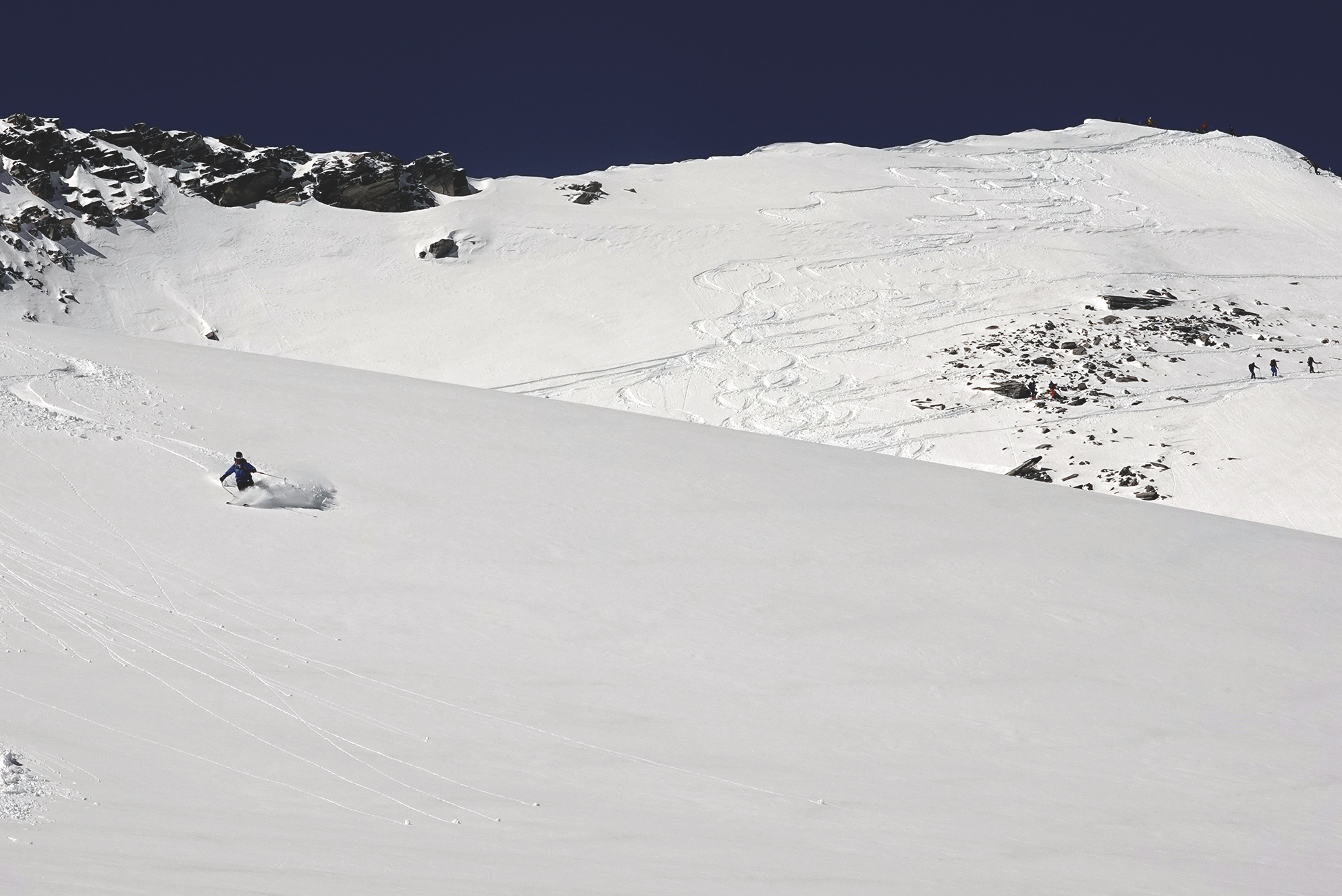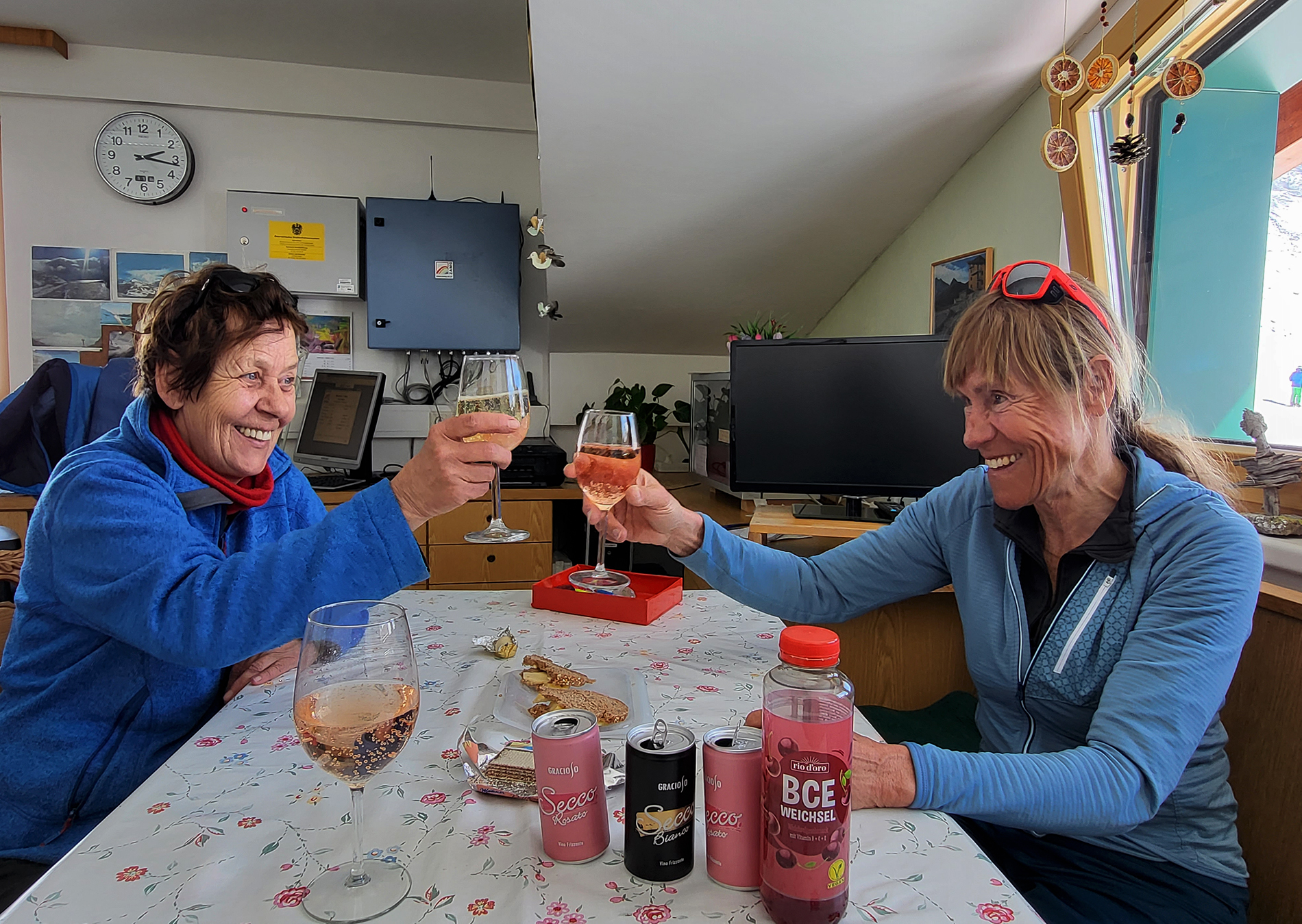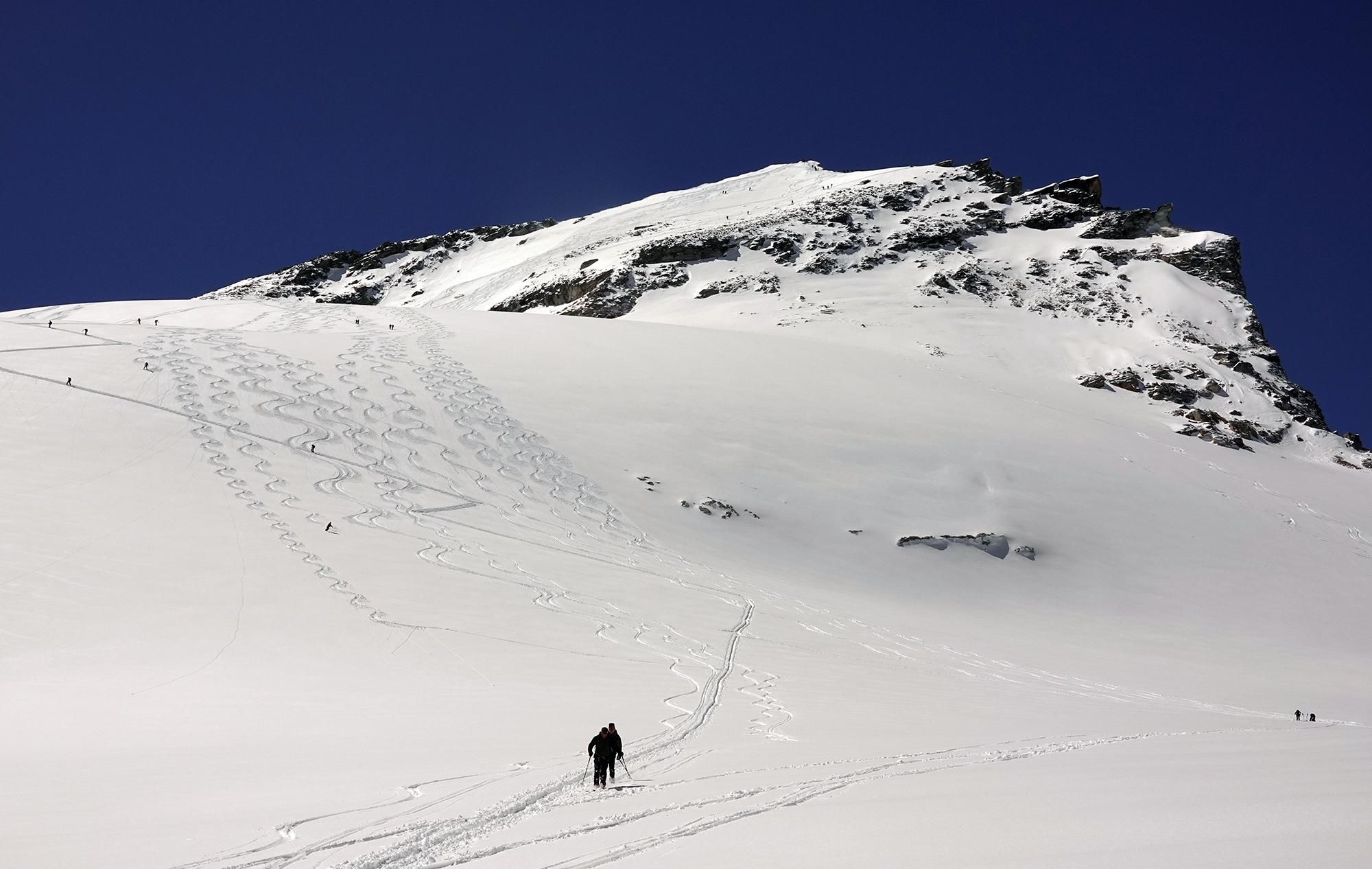 Sonne wie im April und Pulverschnee wie im Februar hatten wir heute über der Rudolfshütte. Früh genug musste man deshalb wieder abfahren, der Schnee war unterhalb des Gletschers schon feucht und schwer, oben allerdings ein Traum. Der Grat zur Granatspitze war heute heikel ohne Steigeisen, weil die Felsen, manchmal mit Eis glasiert, teilweise vom Neuschnee bedeckt waren. Dafür war am Sonnblick "etwas mehr" los!! Nach der Abfahrt gab es noch den traditionellen Besuch bei der Wetterwartin der Rudolfshütte, - immer wieder schön, - und Glück gehabt, - denn gerade heute ist sie erst wieder oben eingetroffen. Die Abfahrt geht noch gut bis zum Enzingerboden, aber der unterste Weg wird bei der Wärme jetzt schnell ausapern.