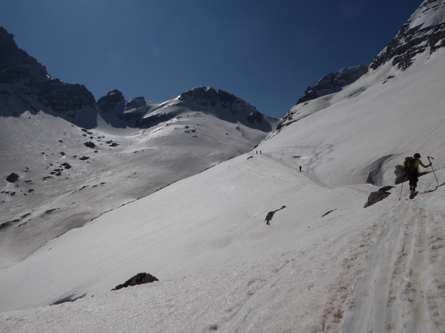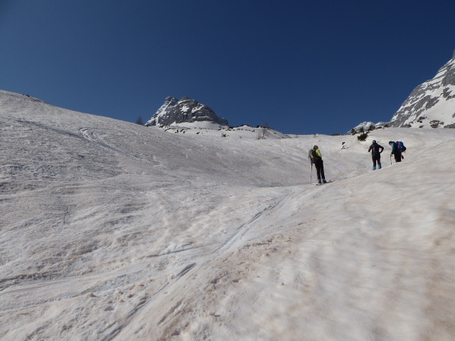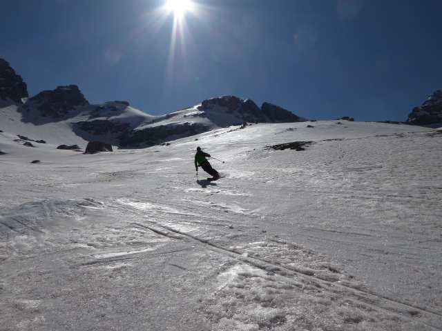 Start um 8:30 bei der Heeresanlage. Nach einigen Minuten durchgehende Schneedecke. Die heiklen Stellen im untern Bereich waren völlig problemlos zu stapfen und danach waren nicht einmal Harscheisen nötig. Abfahrt um 13:00 bei größtenteils wunderbarem Firn. Abgesehen von einer kurzen Tragestelle bei der schwarzen Wand war die Abfahrt bis zum Auto möglich. Ein absolutes Traumtagerl