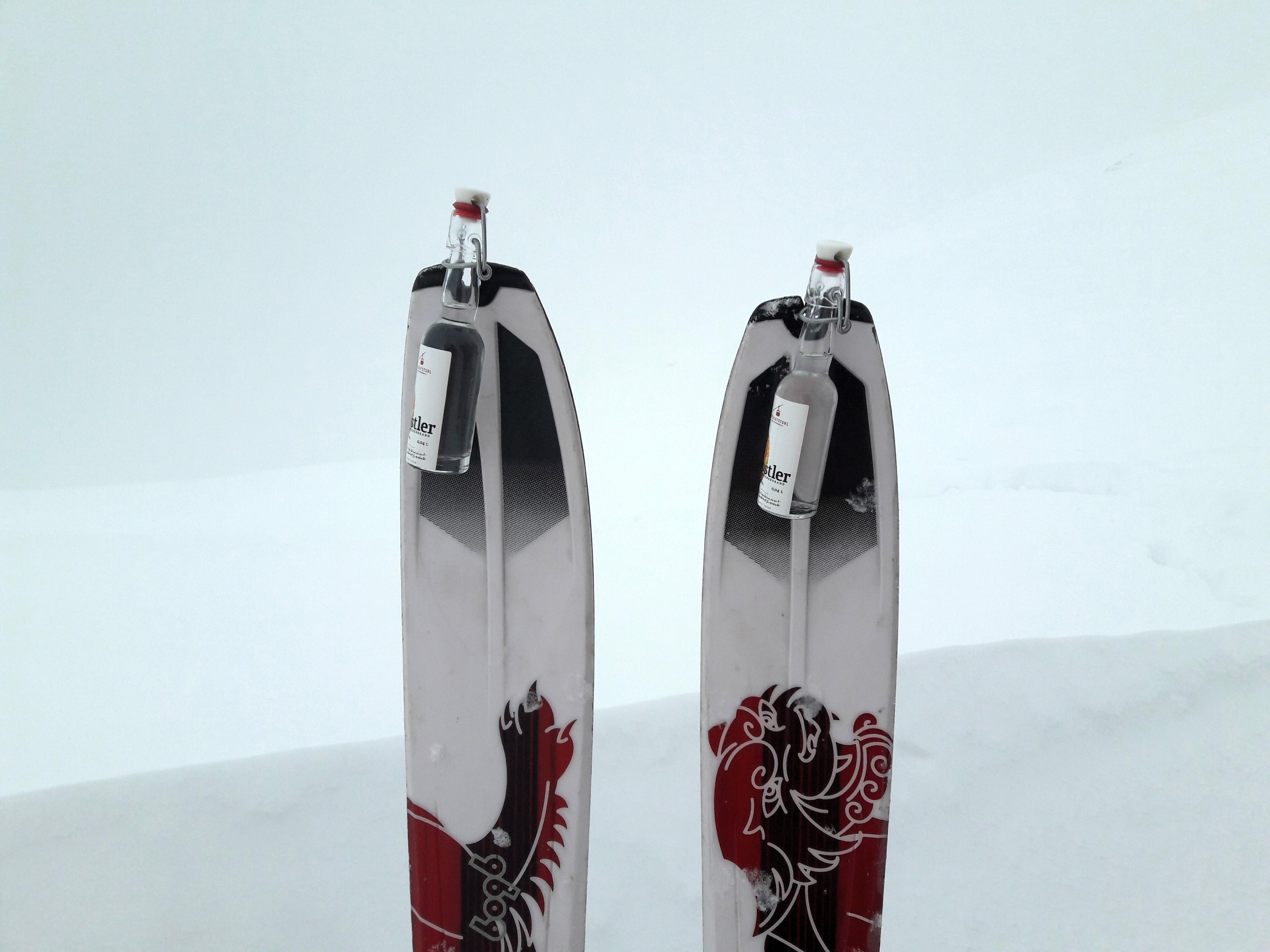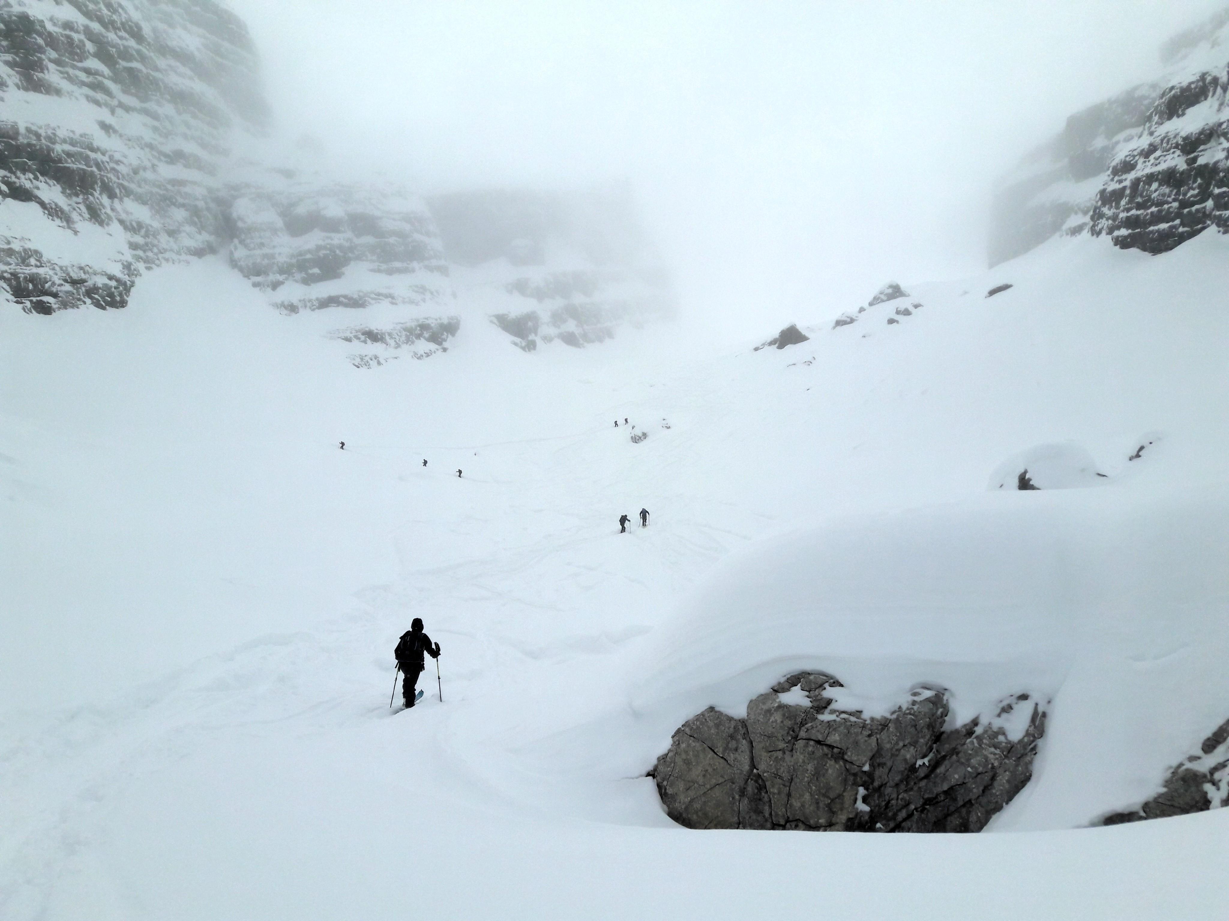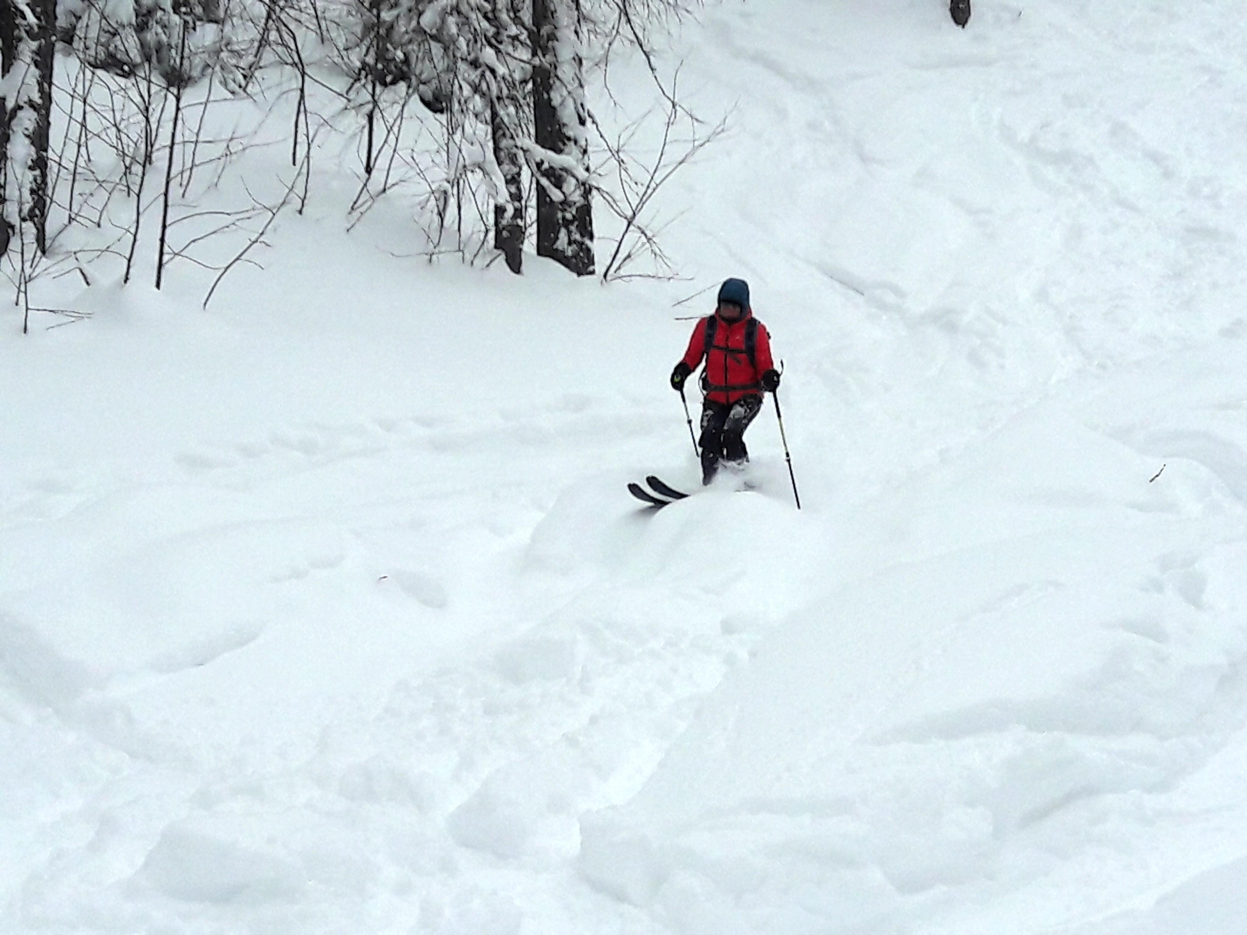 Am PP Hammerstiel beim Frühstart um 7 Uhr gleich mal anschnallen und in der 1. Reihe ziemlich beste Verhältnisse. Durchgehend leichter Schneefall. Nach dem Lärchenwald hat der Wind ständig an Stärke zugelegt und uns den Schnee ins Gesicht und unters Hauberl verfrachtet. Die Percht hat den Gipfel in ihrem wildweissen Windwolkennebelkleid versteckt. Blindflug. Dann Buivabaggern vom feinsten.