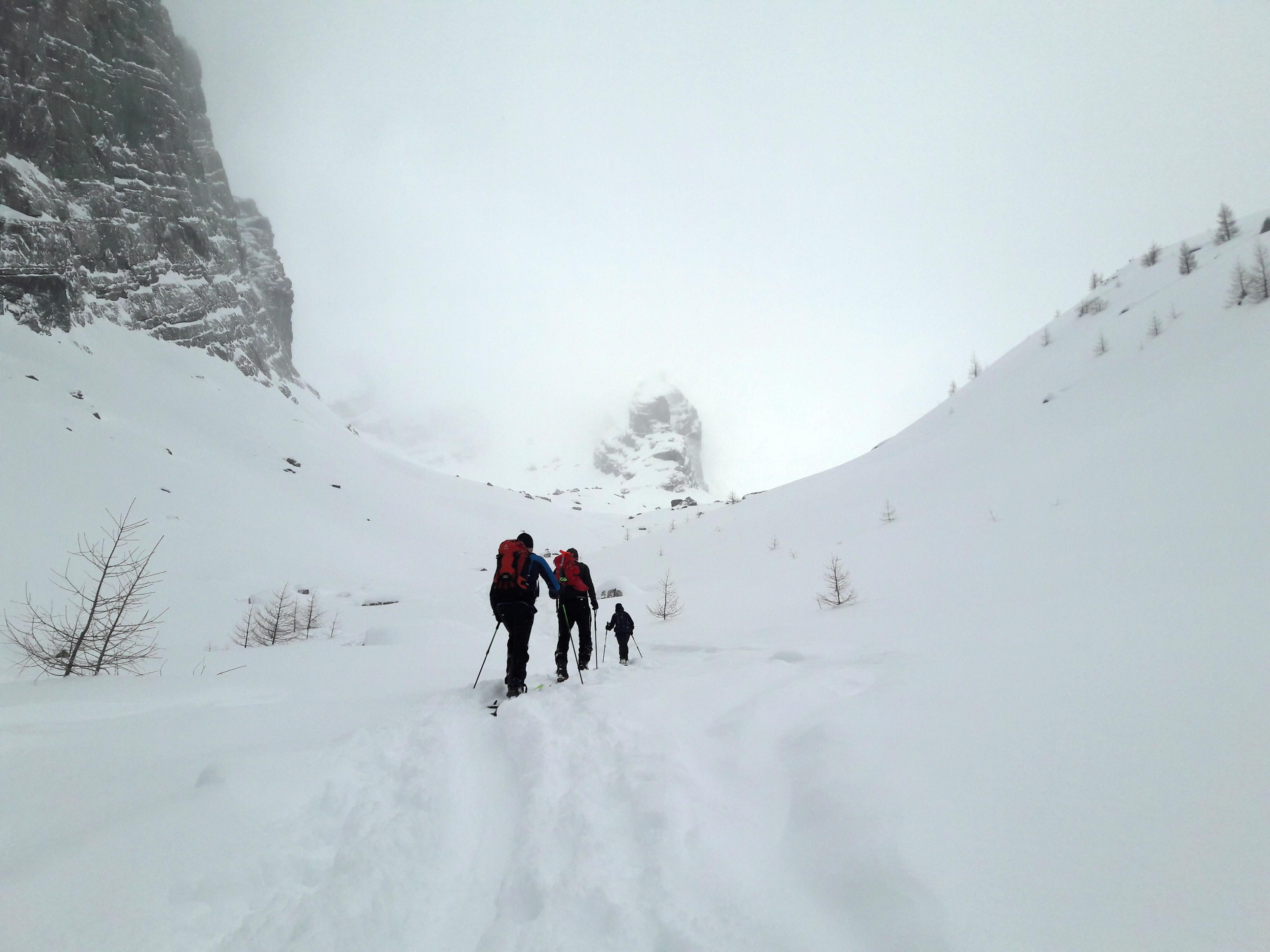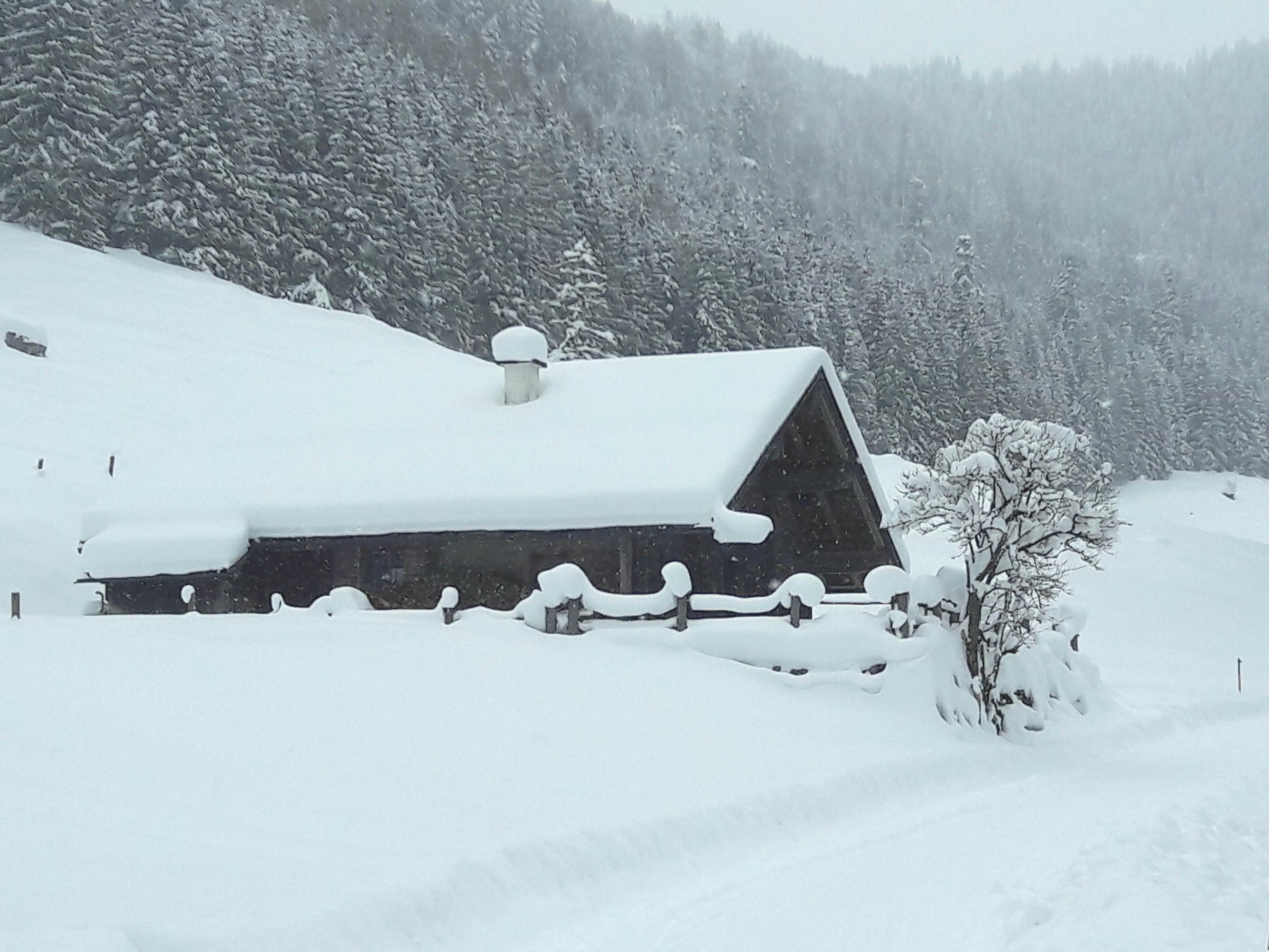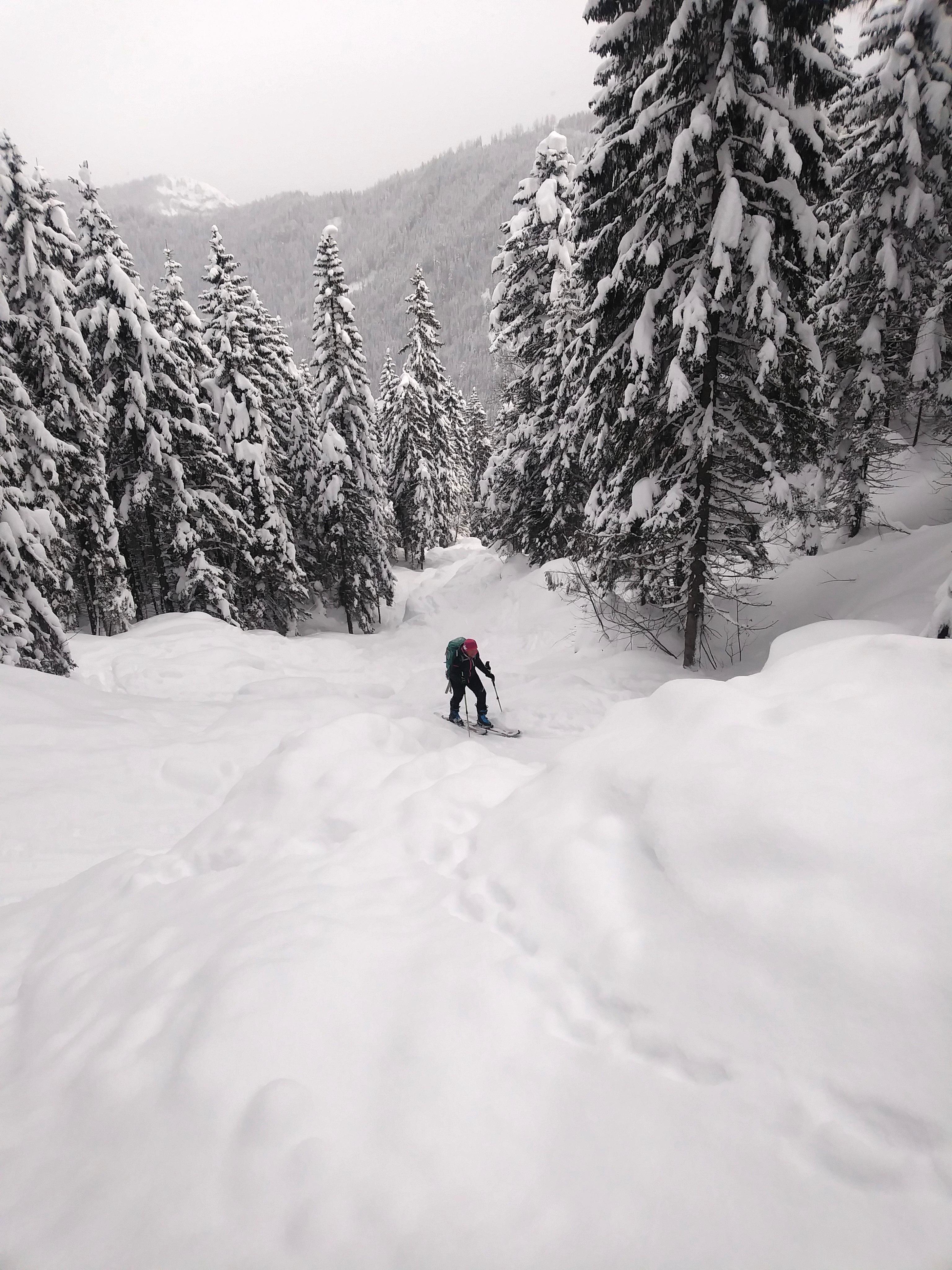 Am PP Hammerstiel beim Frühstart um 7 Uhr gleich mal anschnallen und in der 1. Reihe ziemlich beste Verhältnisse. Durchgehend leichter Schneefall. Nach dem Lärchenwald hat der Wind ständig an Stärke zugelegt und uns den Schnee ins Gesicht und unters Hauberl verfrachtet. Die Percht hat den Gipfel in ihrem wildweissen Windwolkennebelkleid versteckt. Blindflug. Dann Buivabaggern vom feinsten.