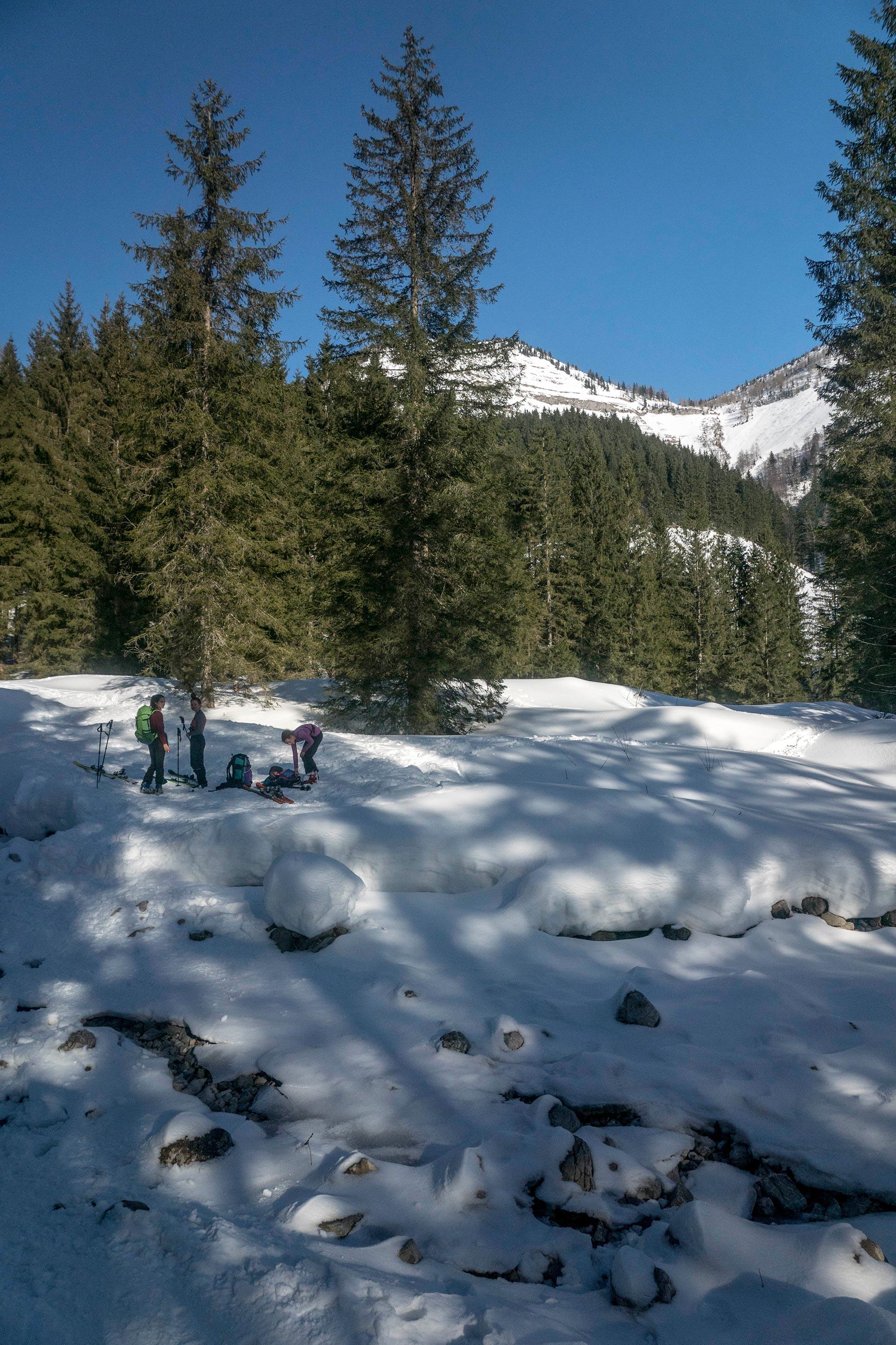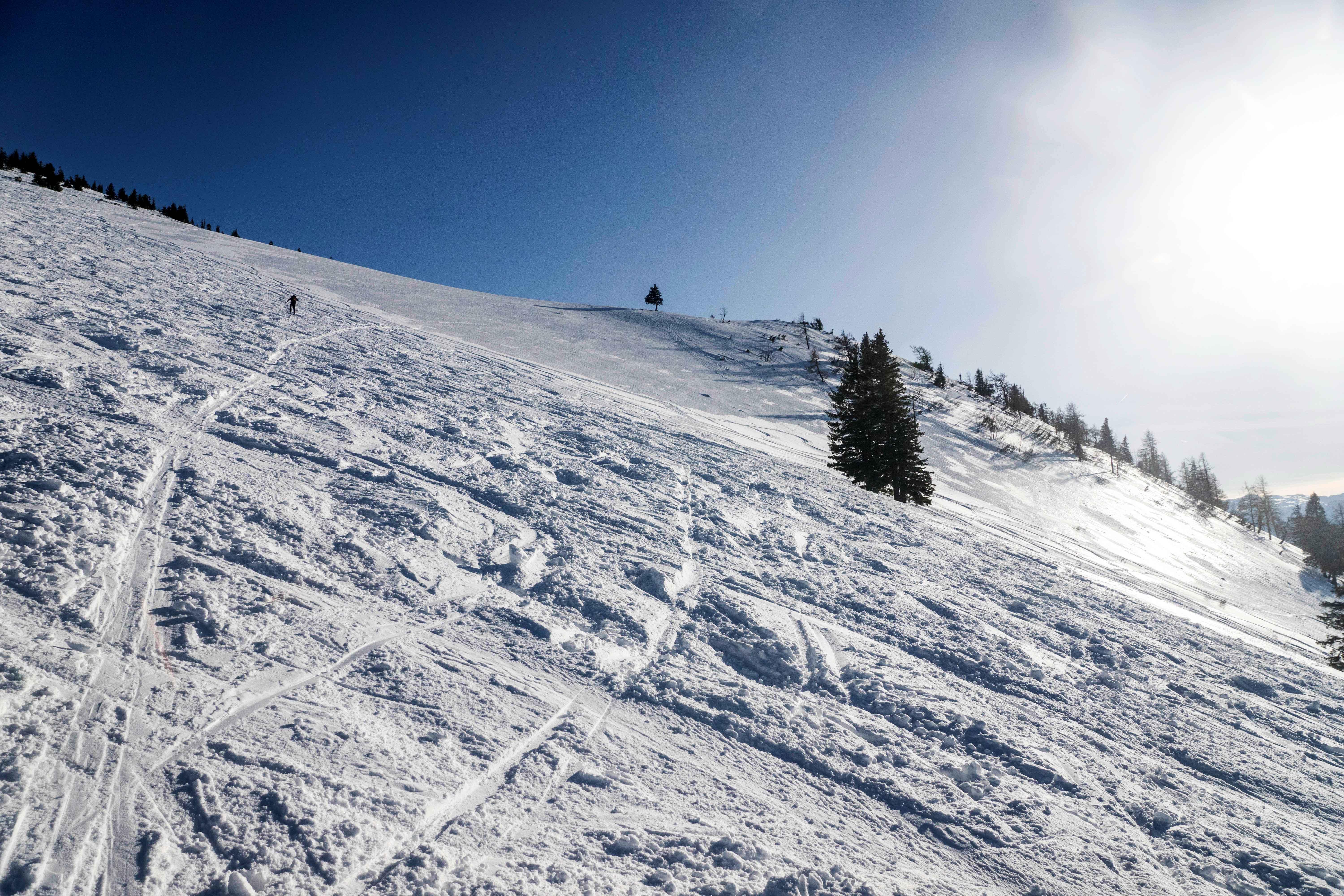Am nächsten Tag stand der Hochwieskopf auf dem Programm. Die Abfahrt in Ackersbachtal hielt im oberen Bereich "schönsten" Harsch bereit, der Wald war gut zu fahren, wobei einige Stein unterwegs zu sehen waren. Im Aufstieg waren immer wieder die abgeblasenen Regenkrusten zu sehen. Am Gipfel war es ruhig und fast windstill. Wir sind wieder den Aufstiegsweg entlang abgefahren und hatten auch noch super Schnee. Eine kleine Gruppe ist bei unserem Aufstieg unterhalb des Gipfels direkt in den Osthang eingefahren. Es hat super ausgeschaut aber mit einer Jugendgruppe bleibt man lieber auf den „normalen“ Pfaden. Am Montag Stand noch die Abfahrt zum Bus nach Lämmerbach an. Die Forststraße hatte über das Wochenende schon ziemlich gelitten, aber es war noch befahrbar. Nach dem Regen sah es sicherlich anders aus.