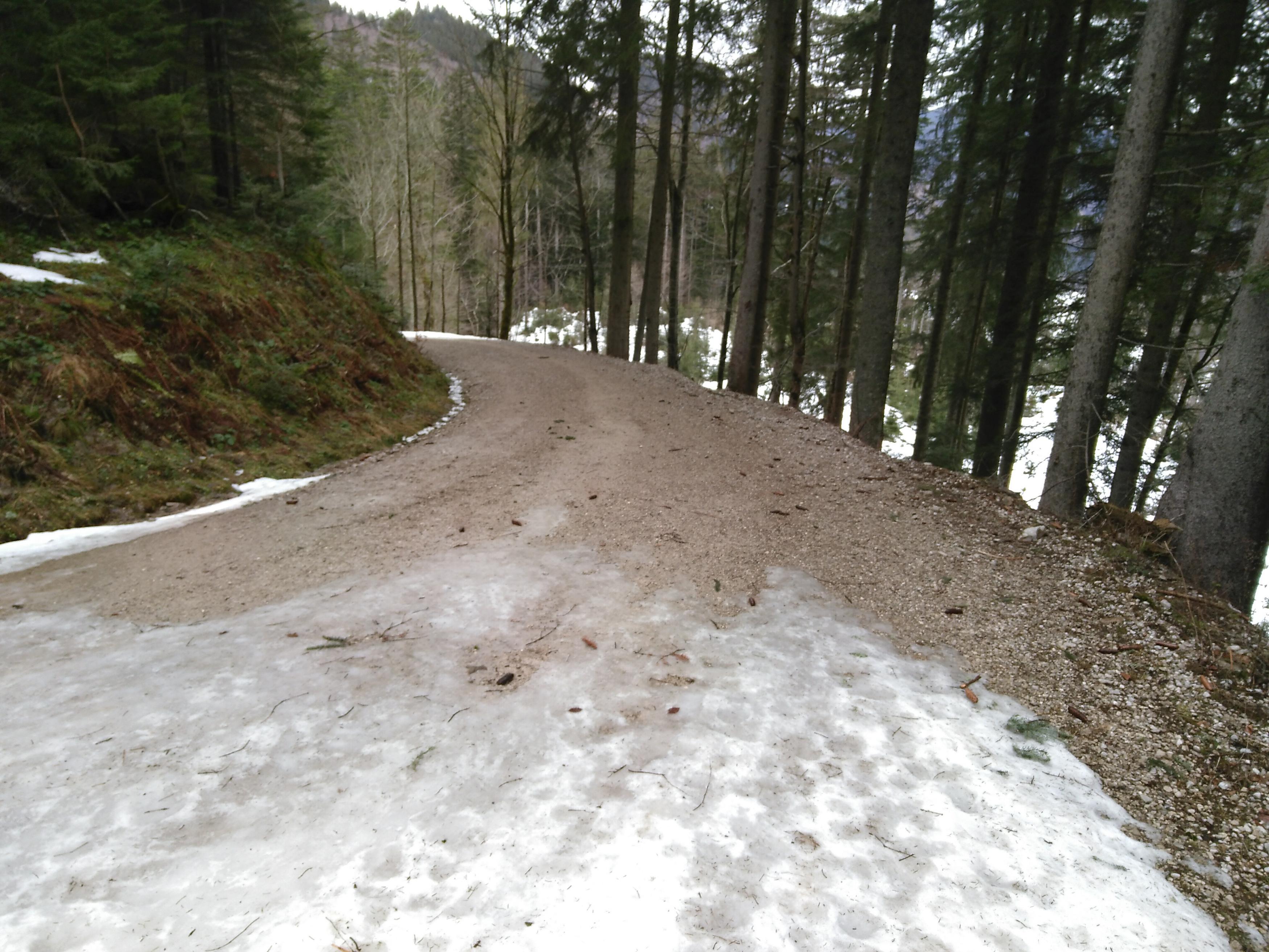 Die Straße zur Genneralm scheebedeckt/eisig, die Abkürzer schneefrei.