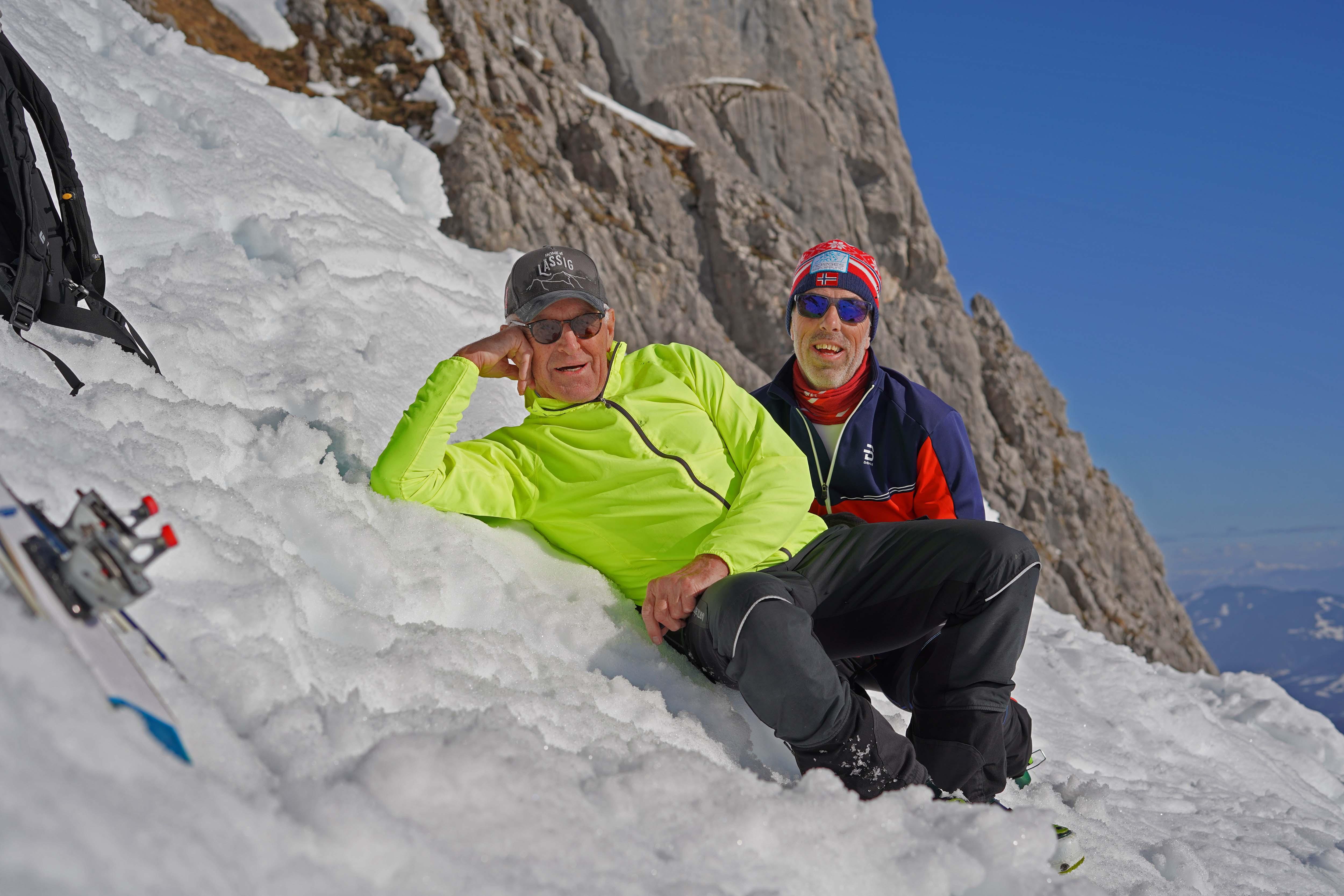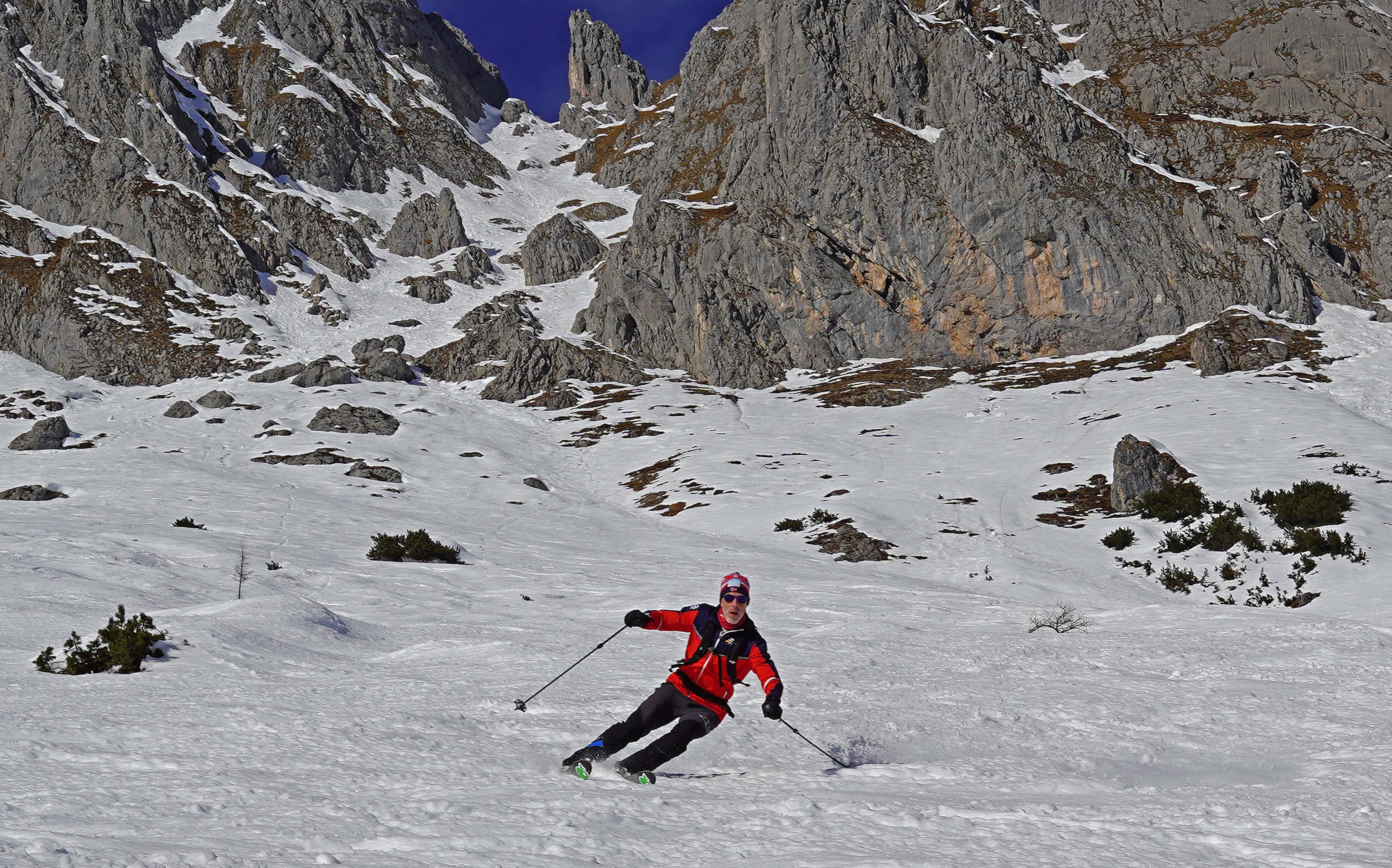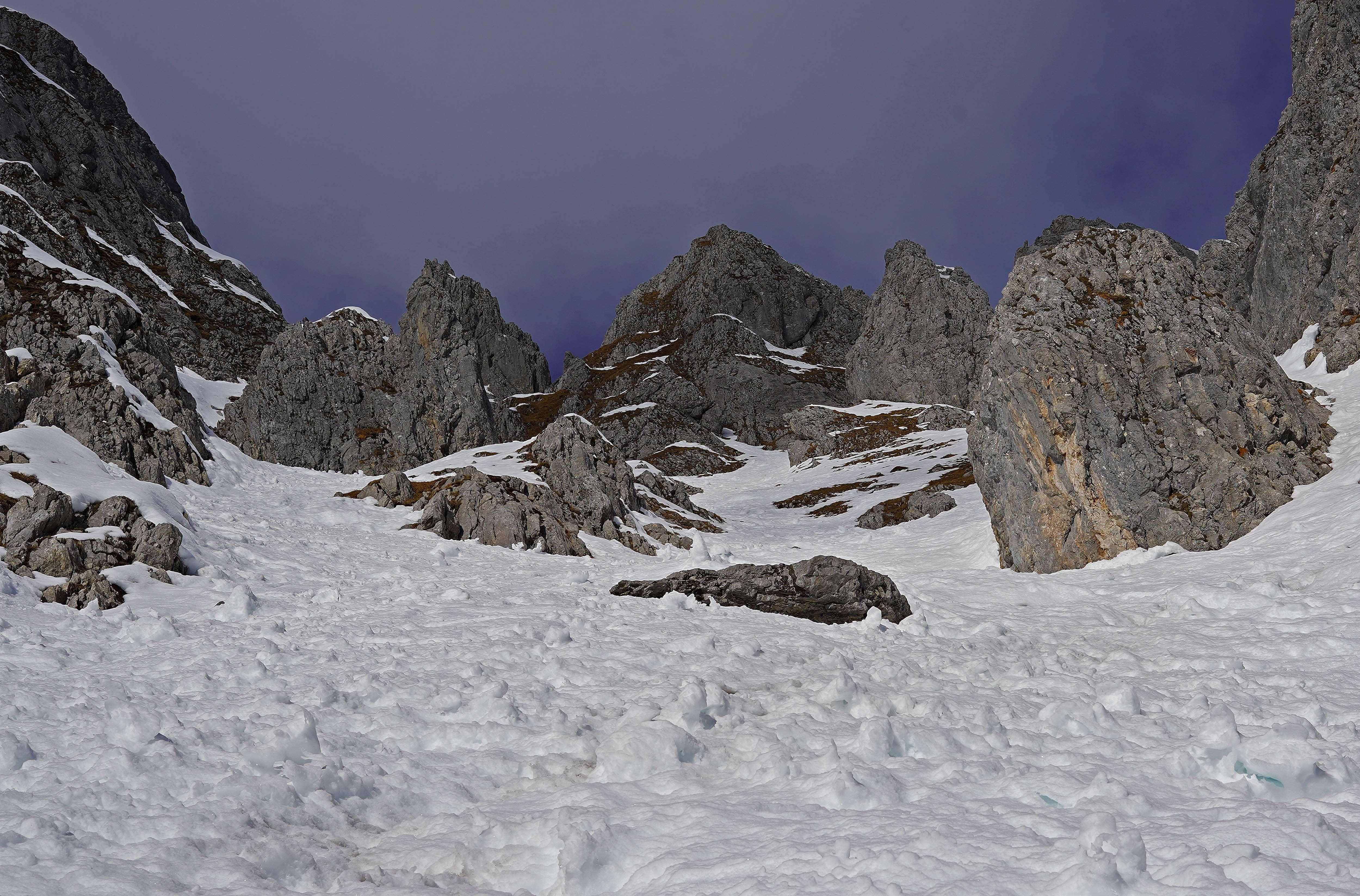 Die Schneedecke an den Südseiten ist sowas von kompakt, selbst am Nachmittag noch immer perfekt, habe diesen Zustand heute ausgenützt und schnell die Vierrinnenscharte besucht. Die Rinne selbst voller Knollen, sonst die gesamten Südhänge eine plane Fläche, Abfahrtsspuren nur angedeutet.