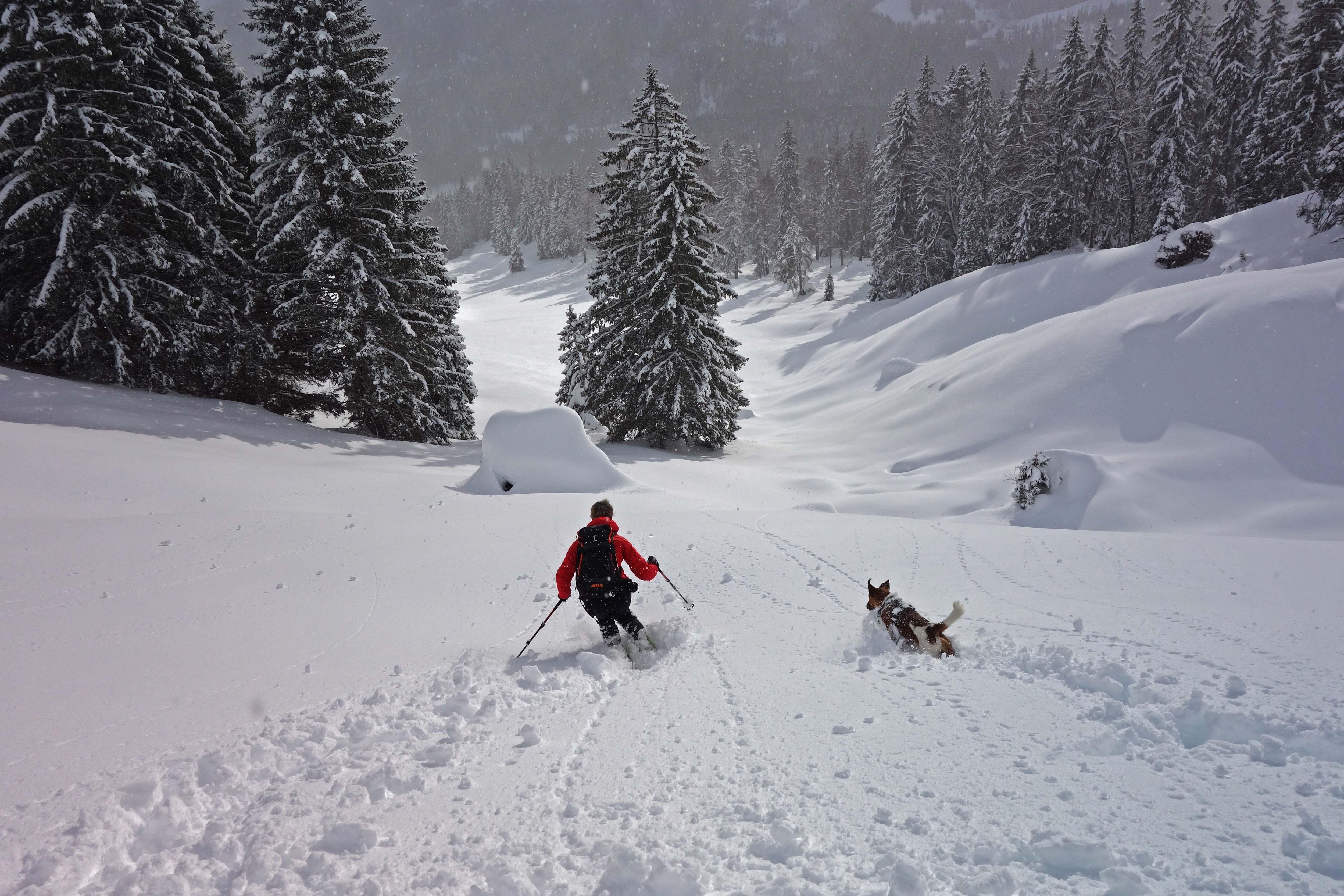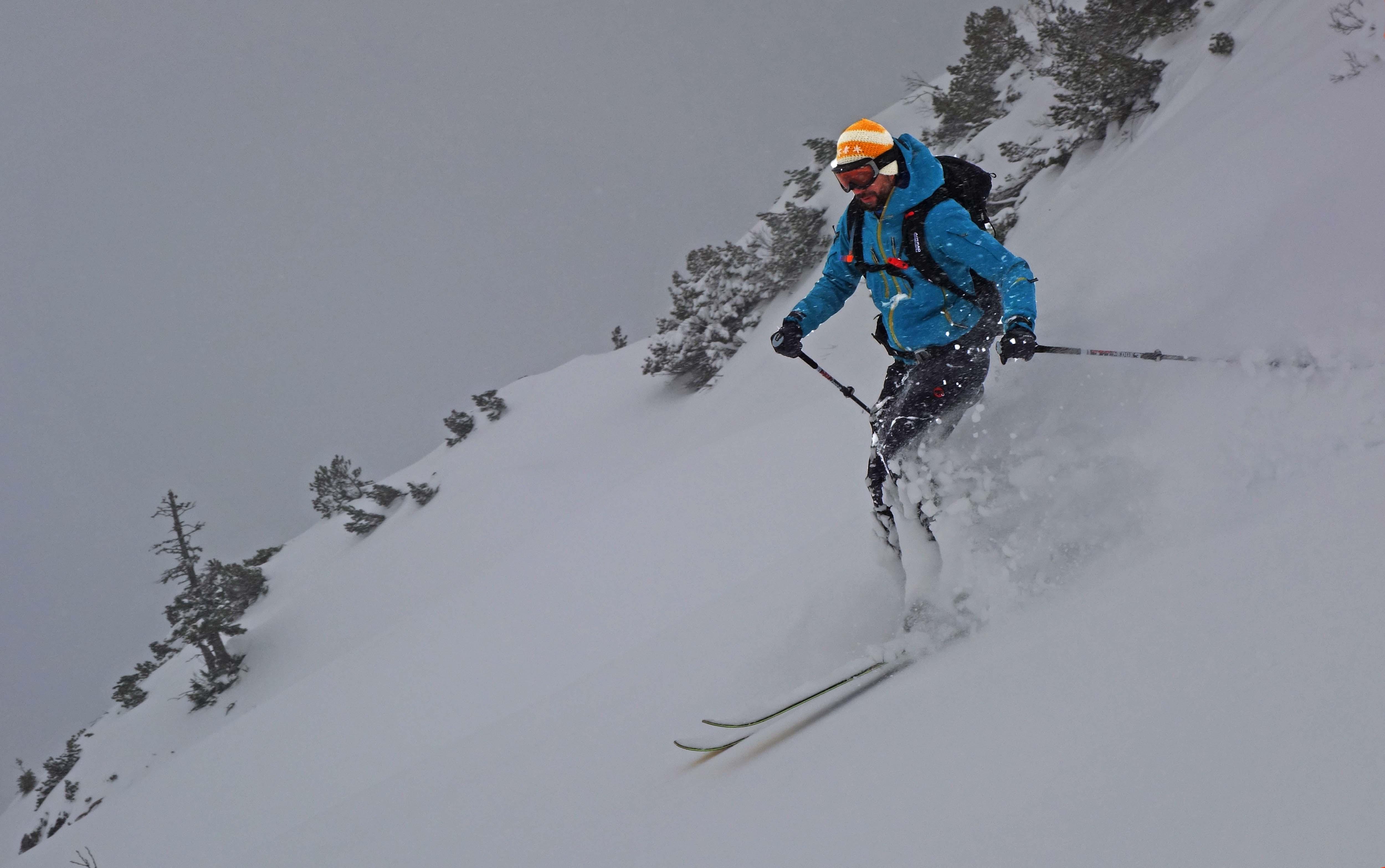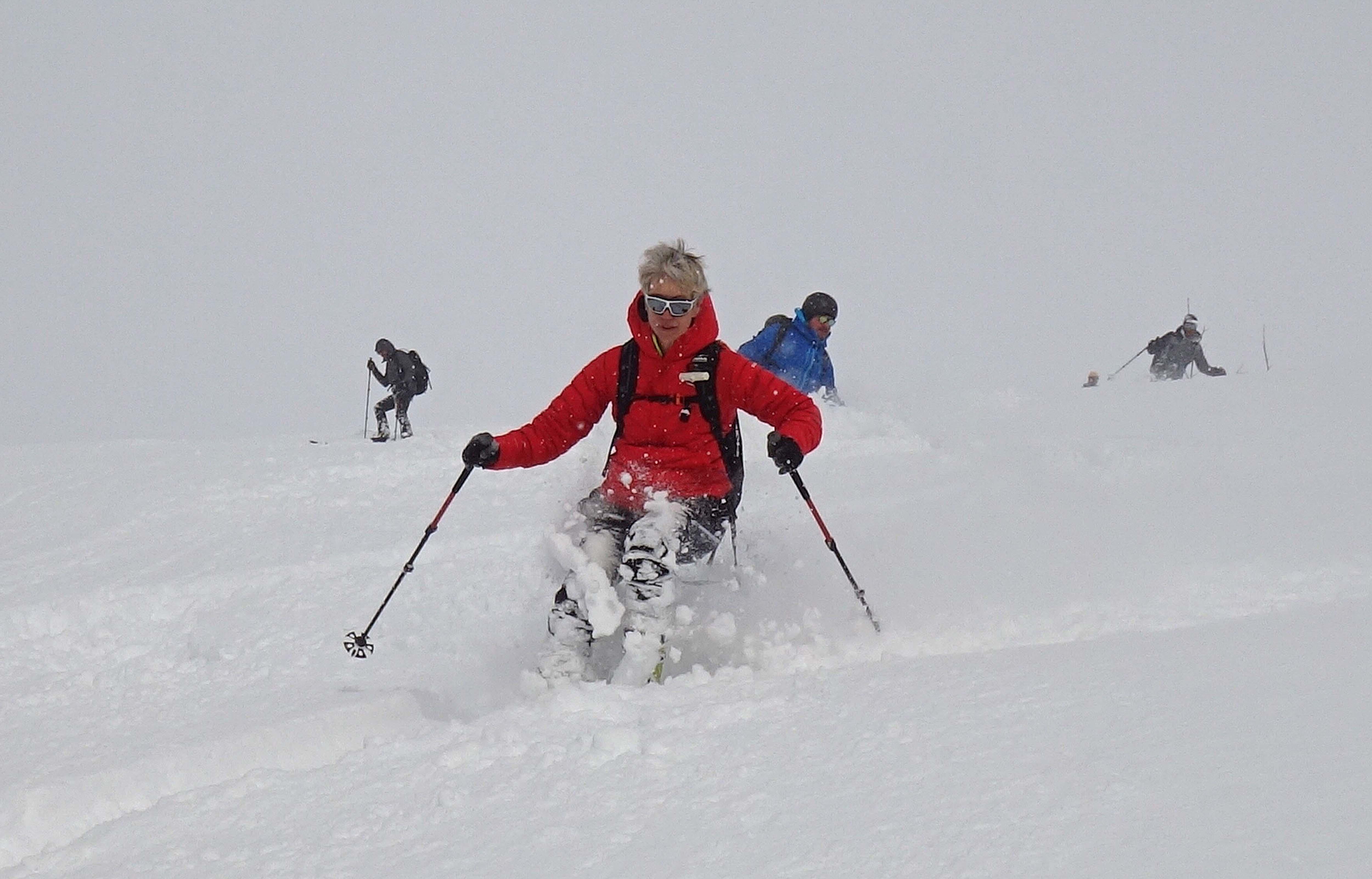 Das Birgkar im Plan, jedoch die Neuschneemenge bei Wind, Nebel , dazu der Blick in den Lawinenlagebericht haben uns zum Mitterriedl "umgeleitet". Trotz schlechter Sicht kamen wir auch hier auf unsere Rechnung, Pulverschnee jede Menge, vom Wind noch verschont, es ging abwärts wie auf Wolken; nur Fliegen ist schöner! Zeitweise Wind, leichter Schneefall, Nebel, die Sonne zeigt sich erst in Talnähe.