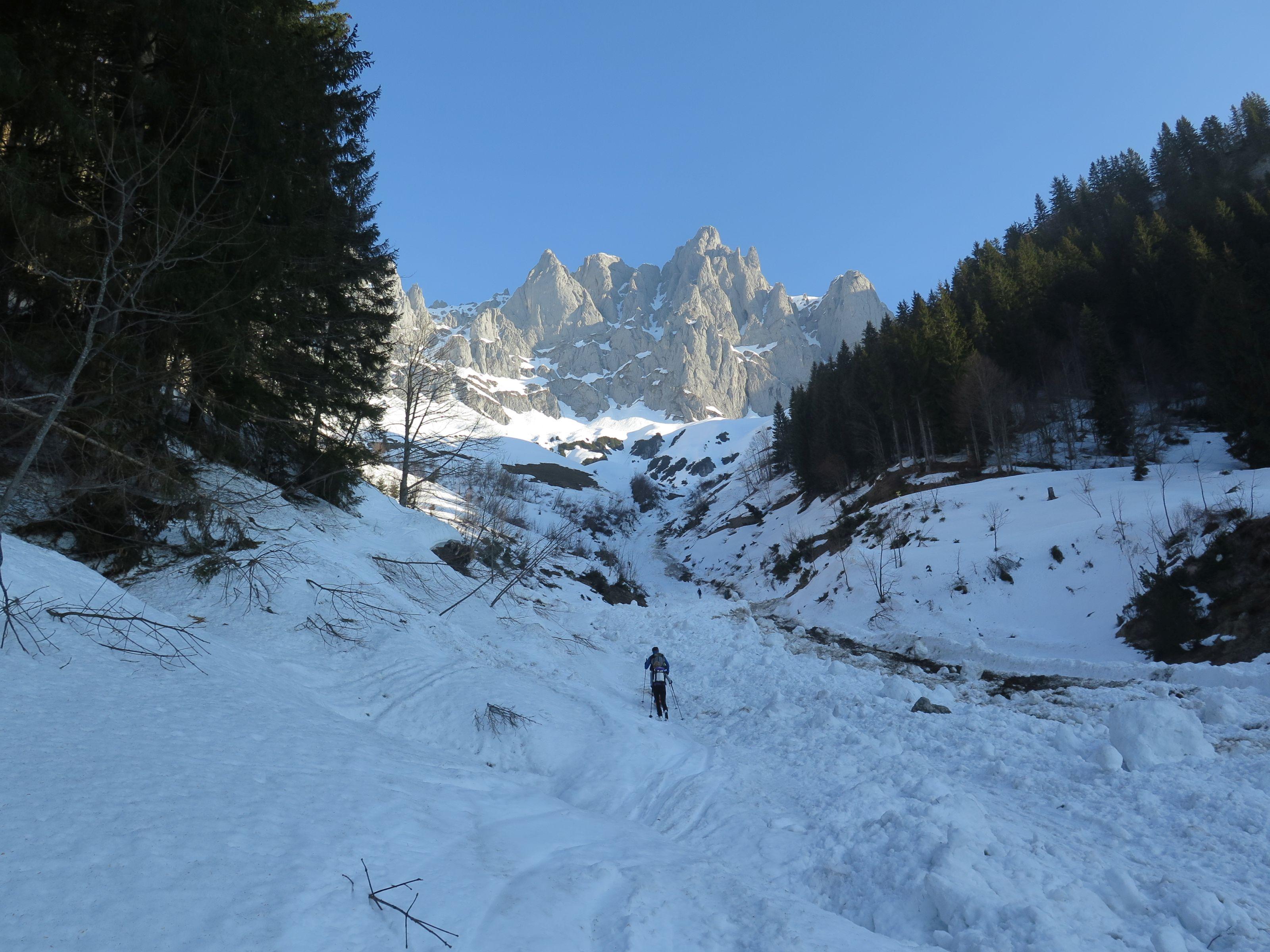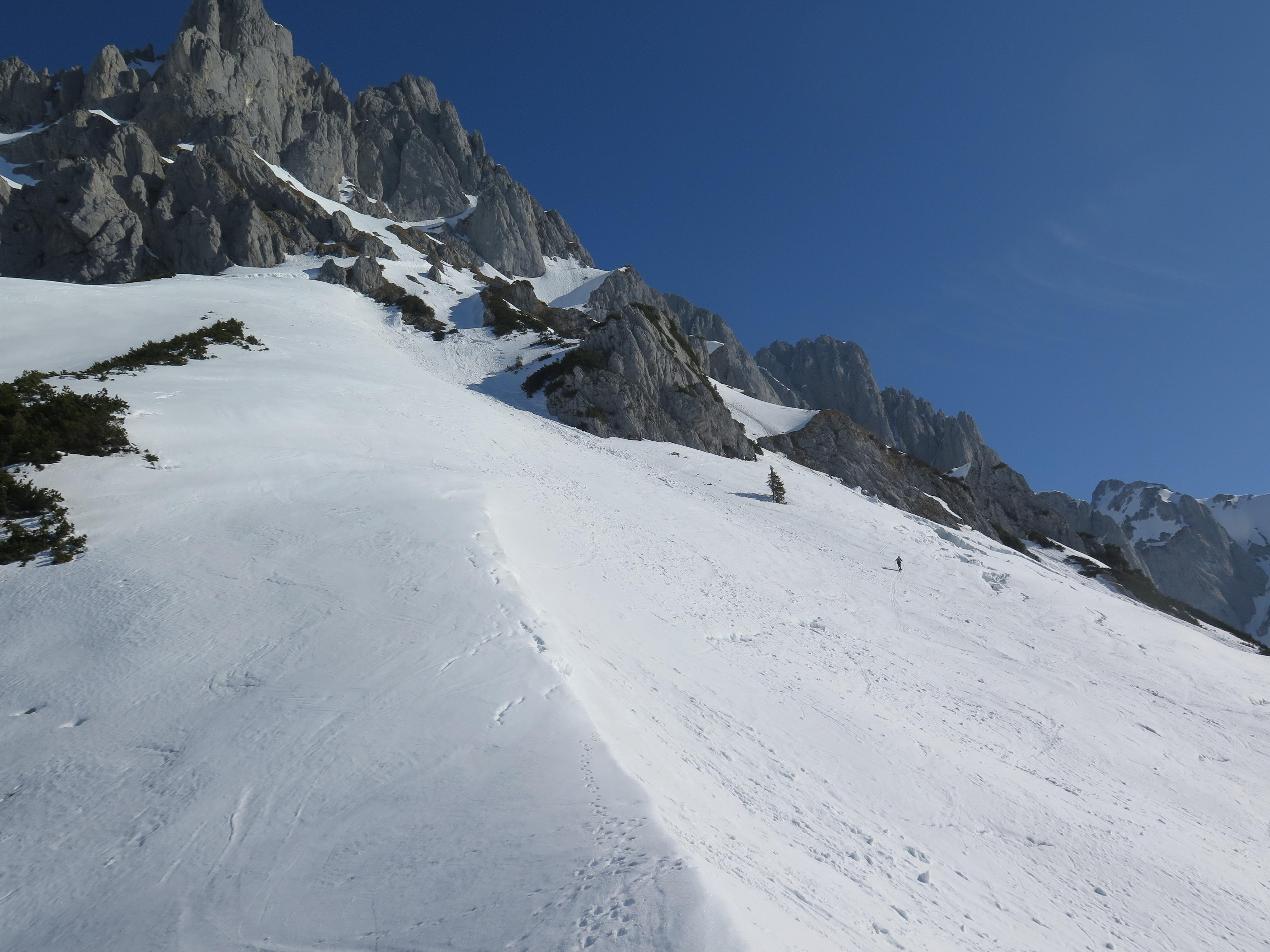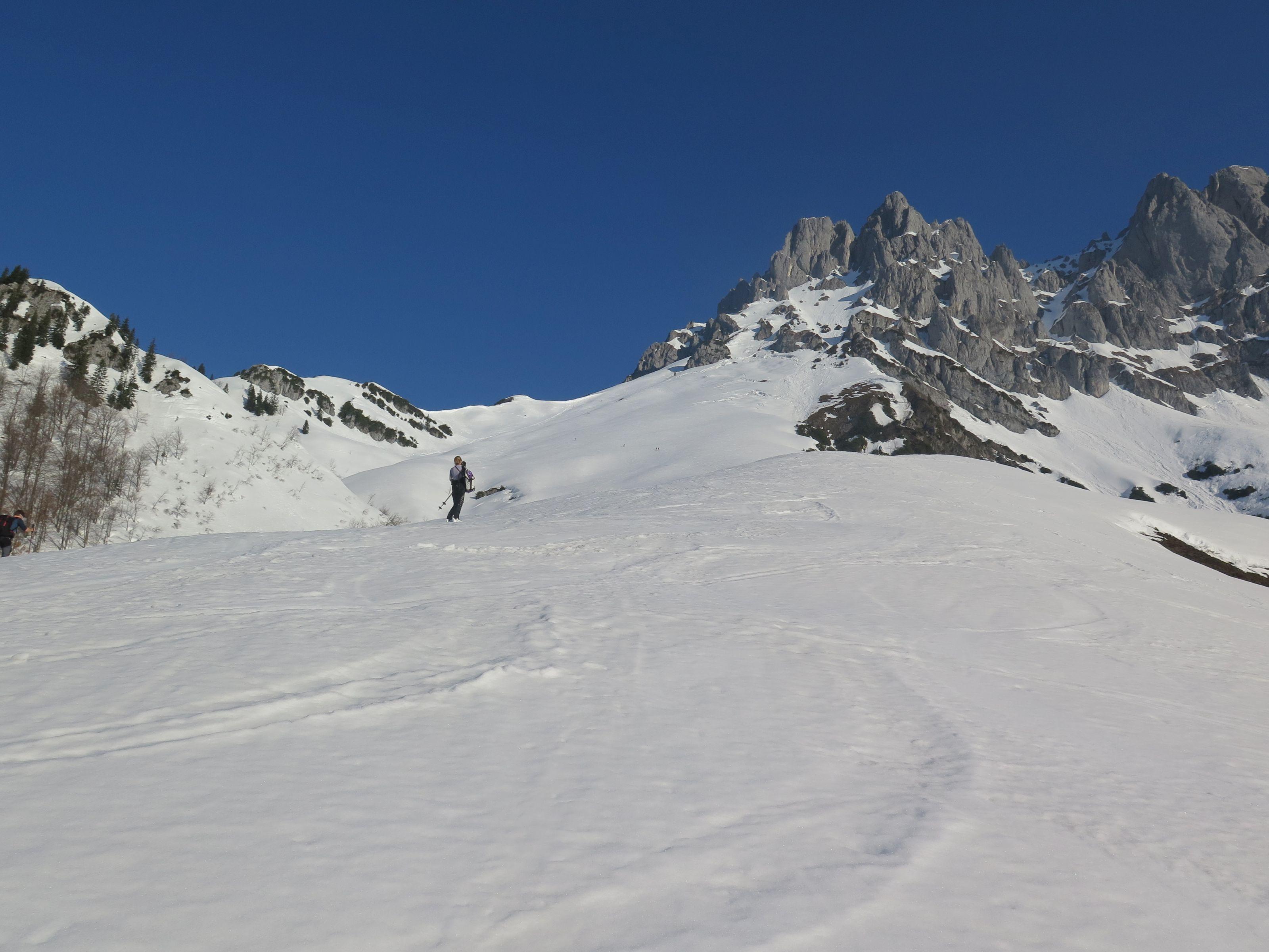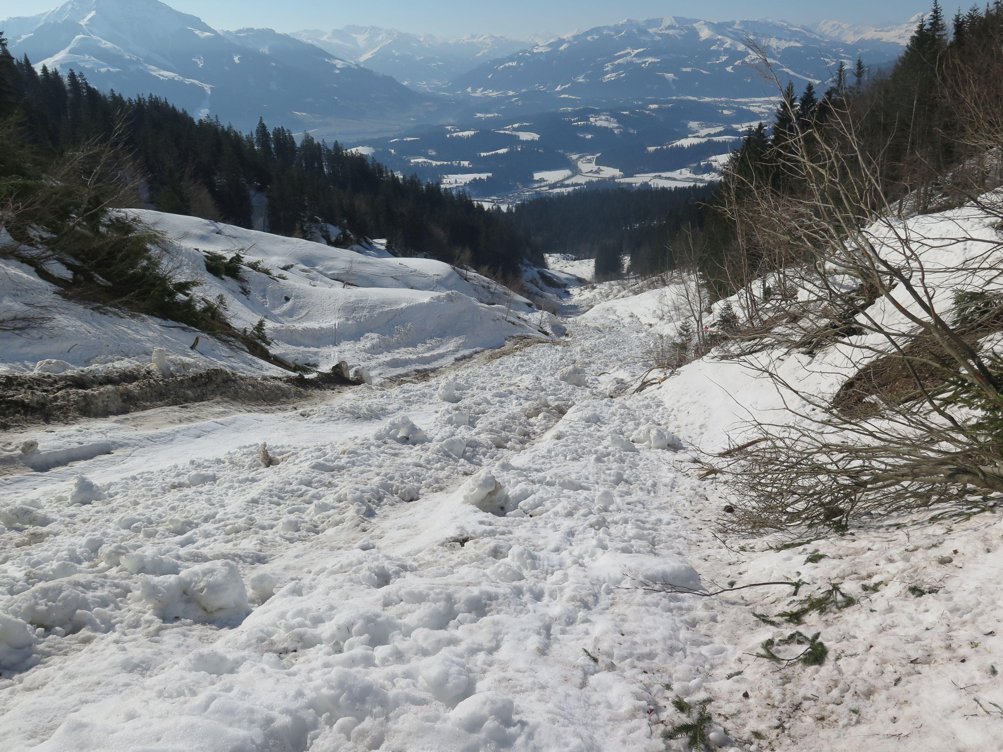 Es liegt noch viel Schnee im Wilden Kaiser . Start mit Skiern vom Parkplatz in Hüttling. Durch den Sintersbachgraben sind Lawinen weit herabgerutscht . Ab den Wiesen der Regalm sind einige große Gleitschneemäuler sichtbar. Bei der Abfahrt um 9 Uhr 30 noch schöner Firn.