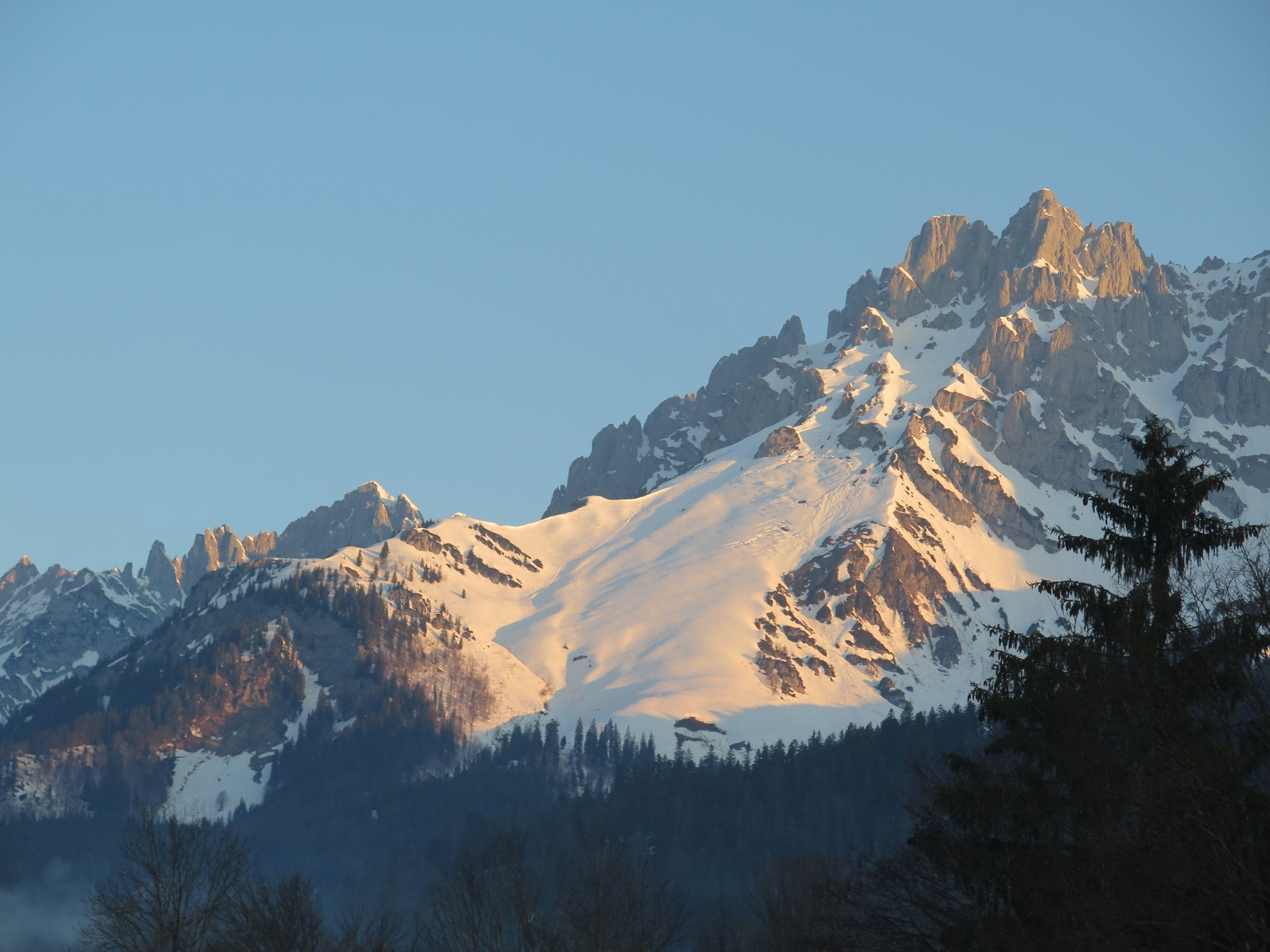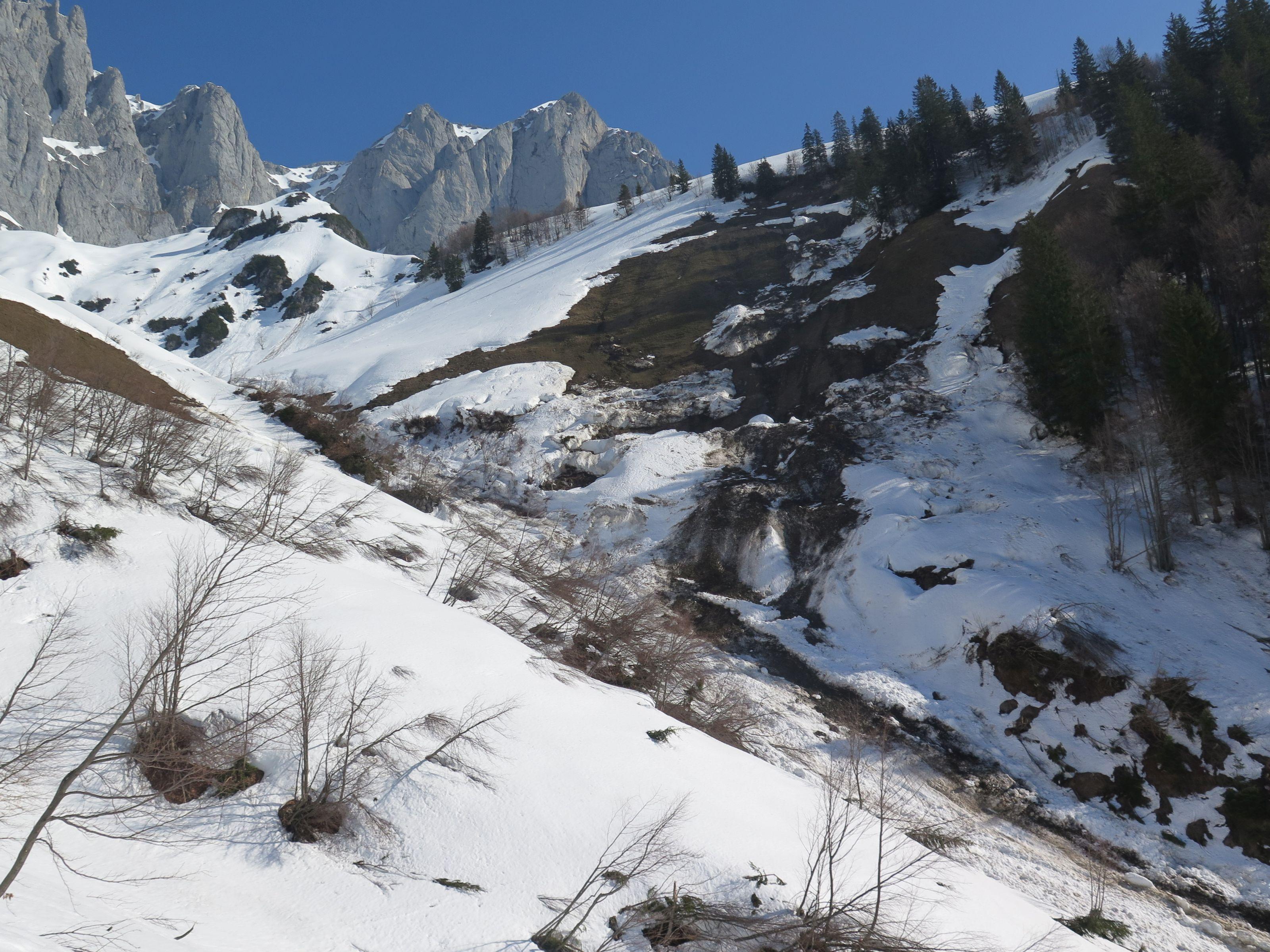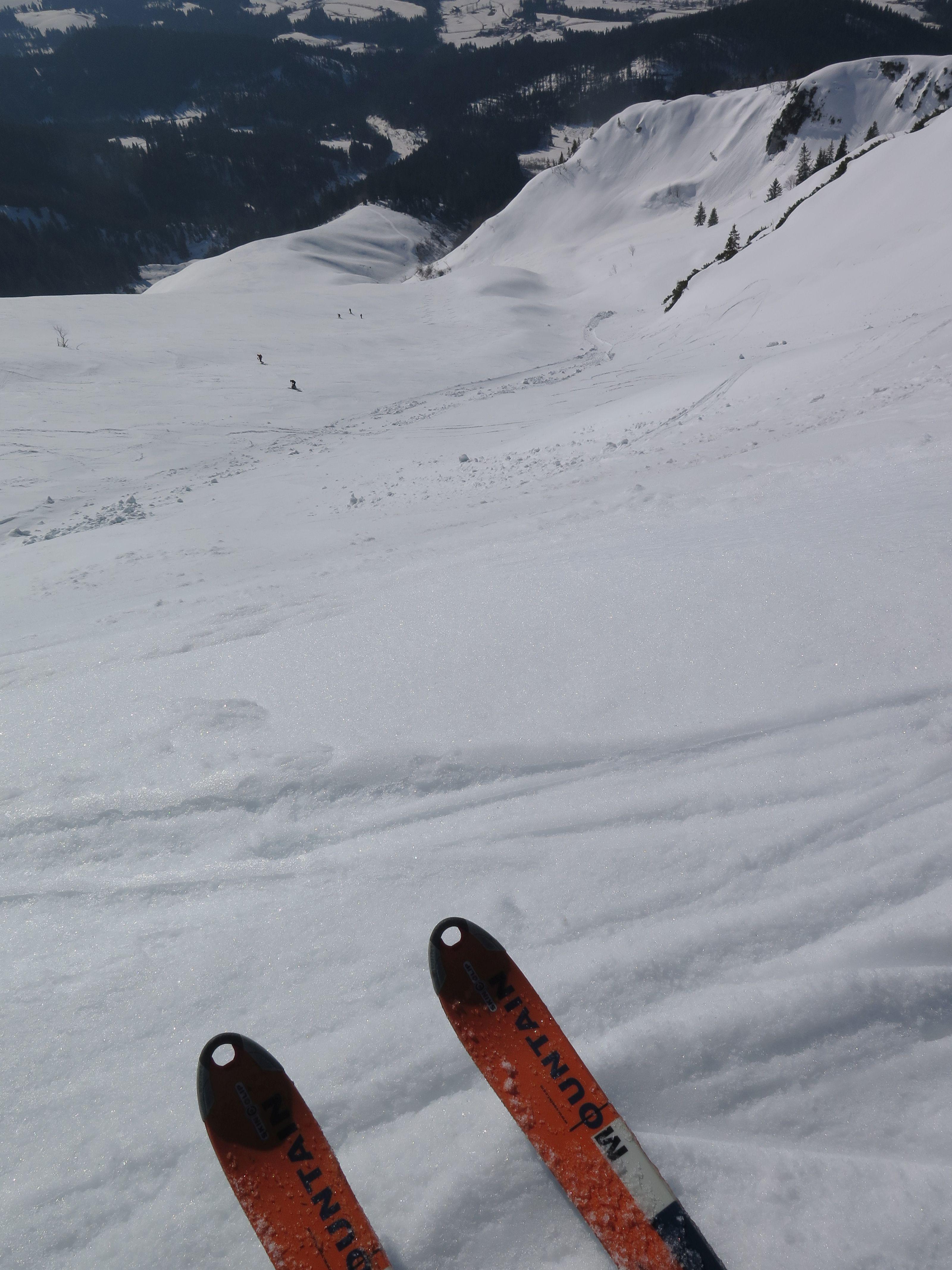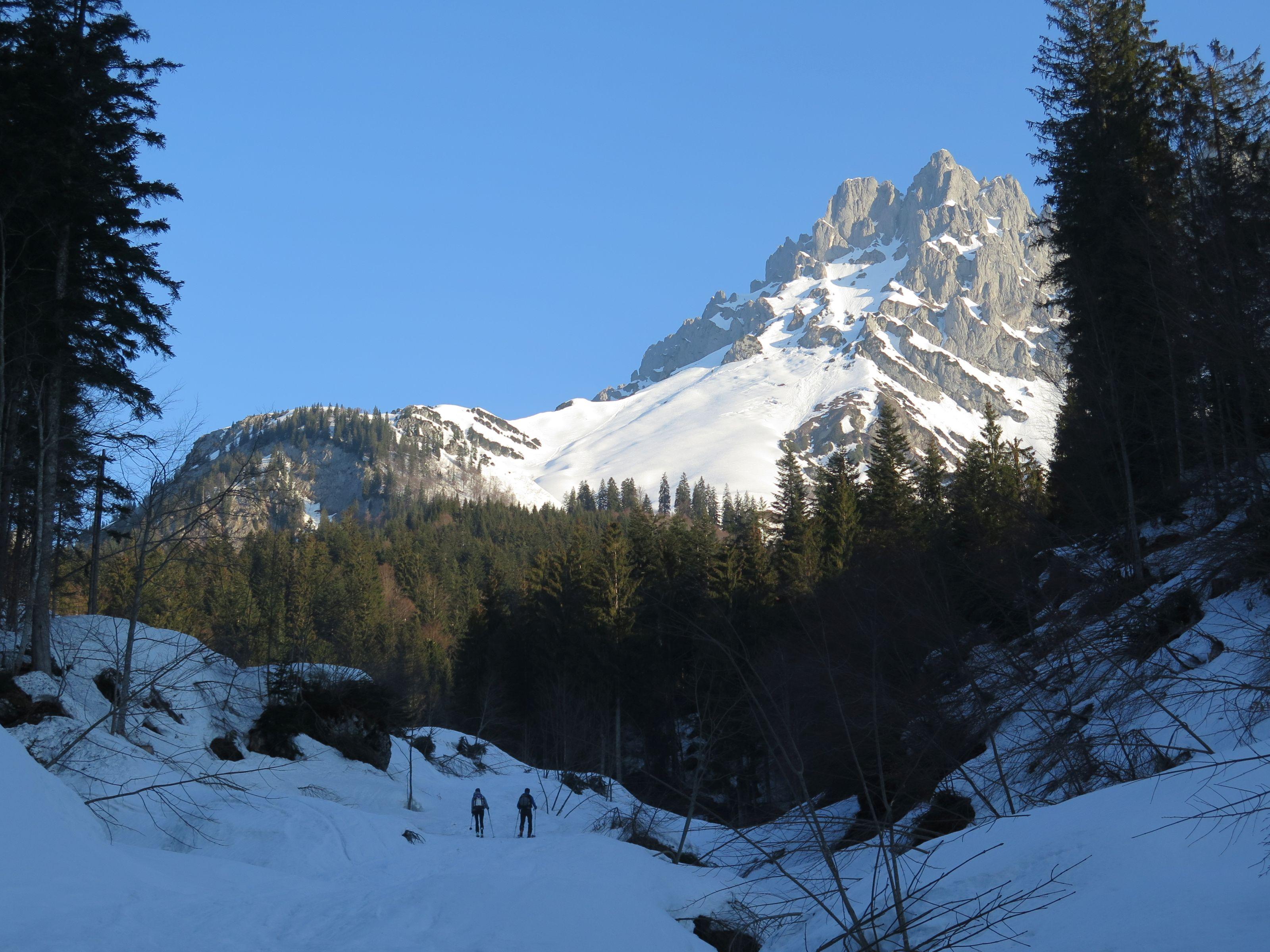 Es liegt noch viel Schnee im Wilden Kaiser . Start mit Skiern vom Parkplatz in Hüttling. Durch den Sintersbachgraben sind Lawinen weit herabgerutscht . Ab den Wiesen der Regalm sind einige große Gleitschneemäuler sichtbar. Bei der Abfahrt um 9 Uhr 30 noch schöner Firn.