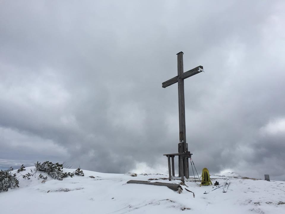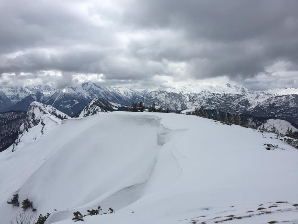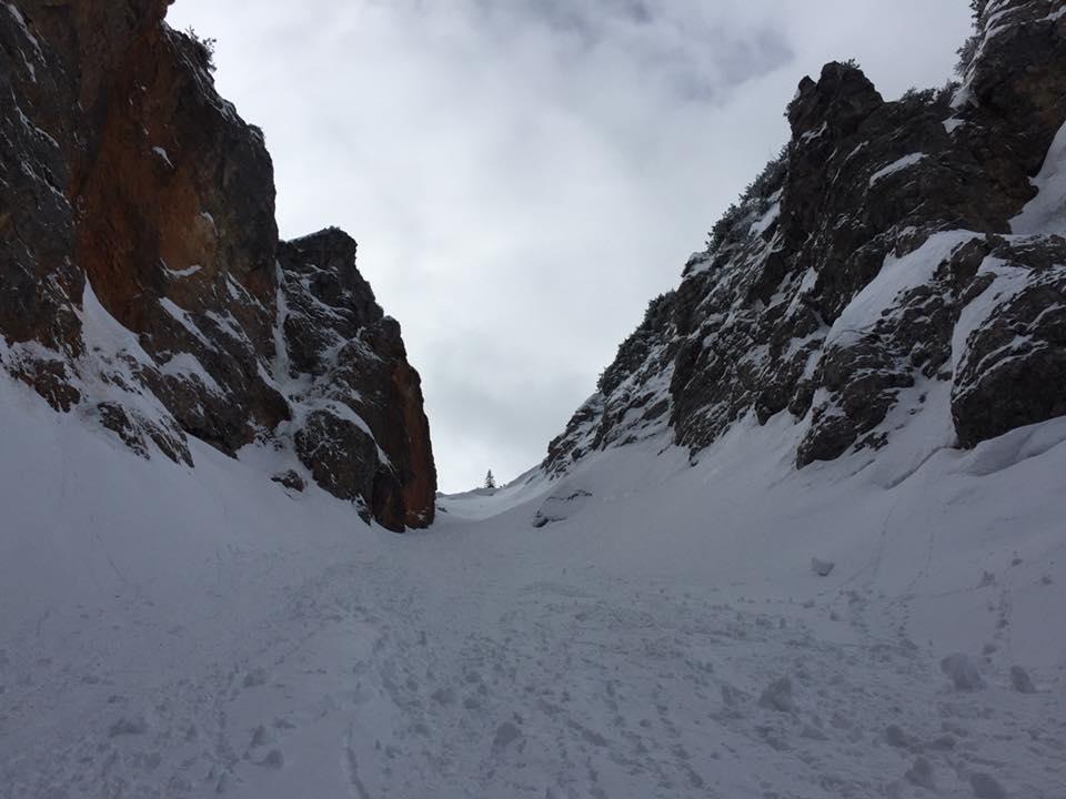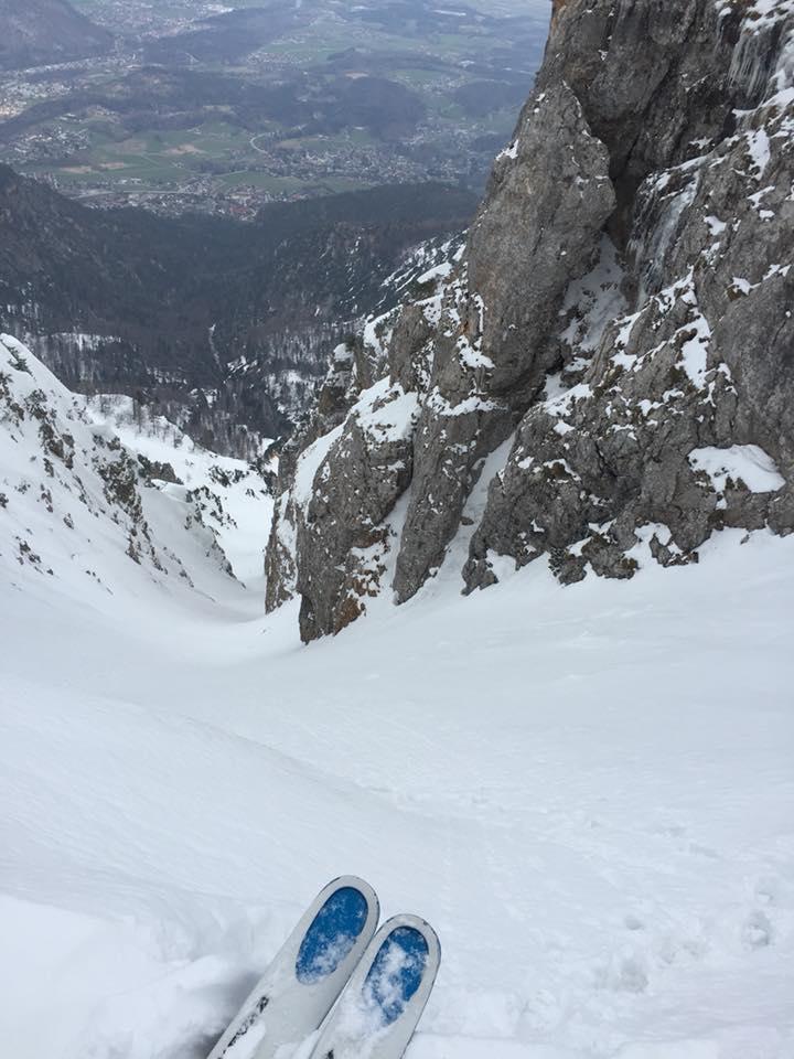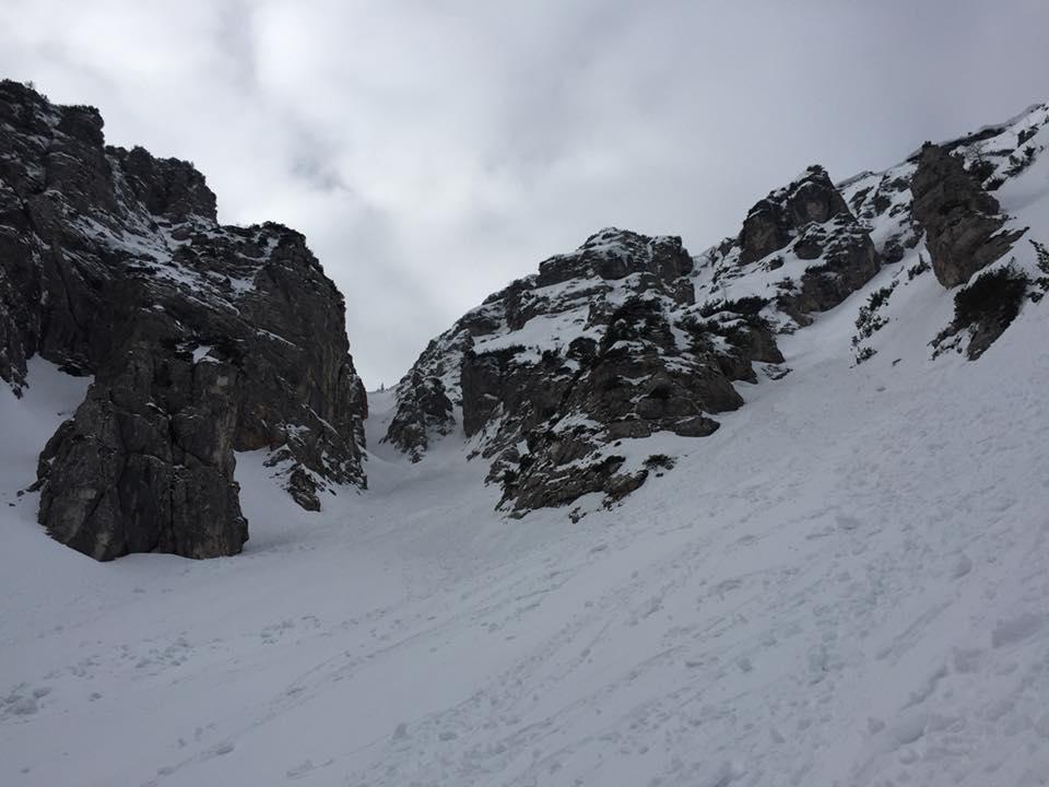 Ski sind bereits eine gute halbe Stunde zum Tragen. Im Unteren Teil ein Paar Knollen. Dann teilweise ein halber Meter Graupel der in der Rinne zusammengeweht wurde. Bei der Abfahrt geht’s wie mit Wasserski. Oben dann guter Pulver. Insgesamt gestern gute Verhältnisse.