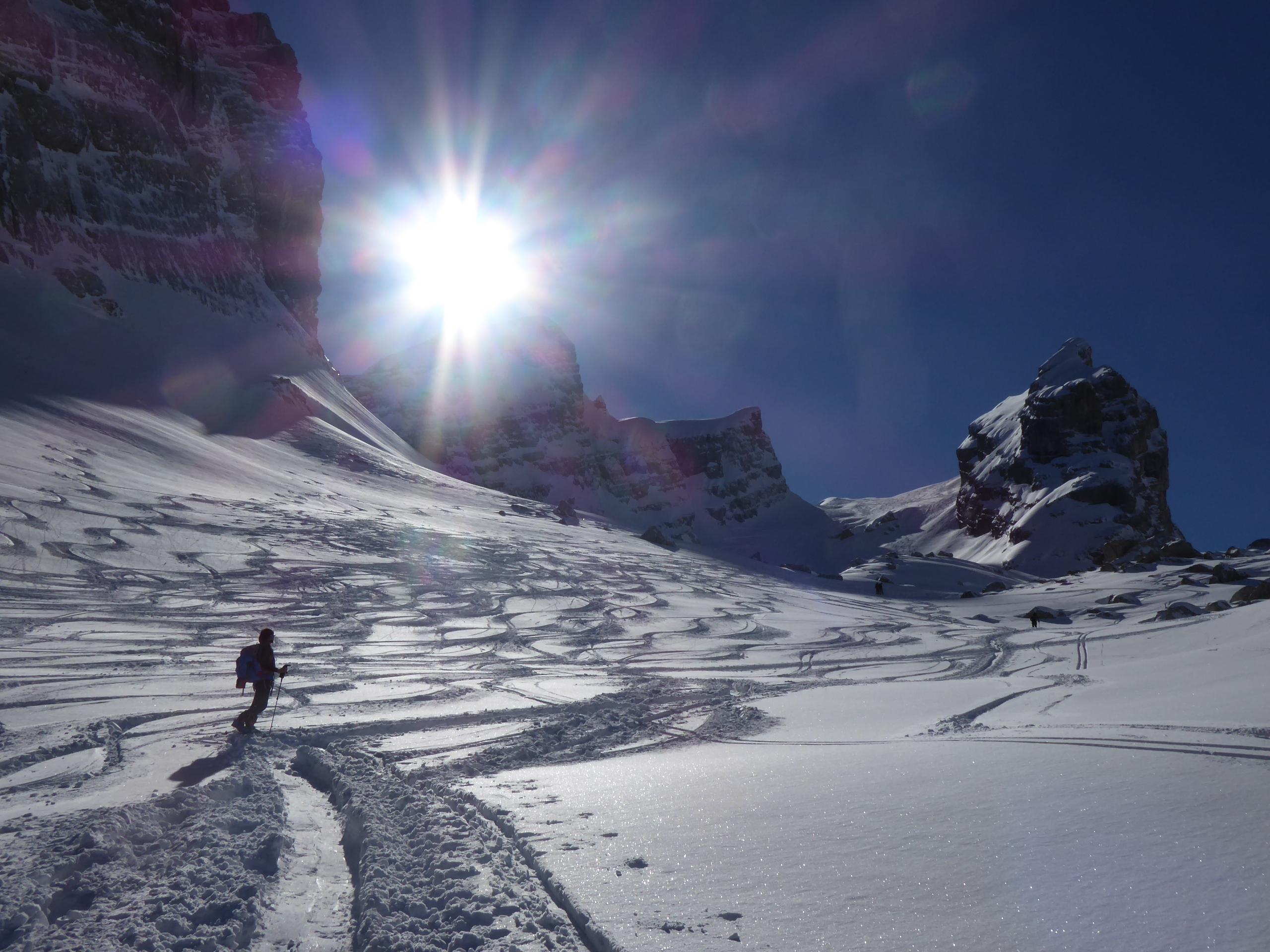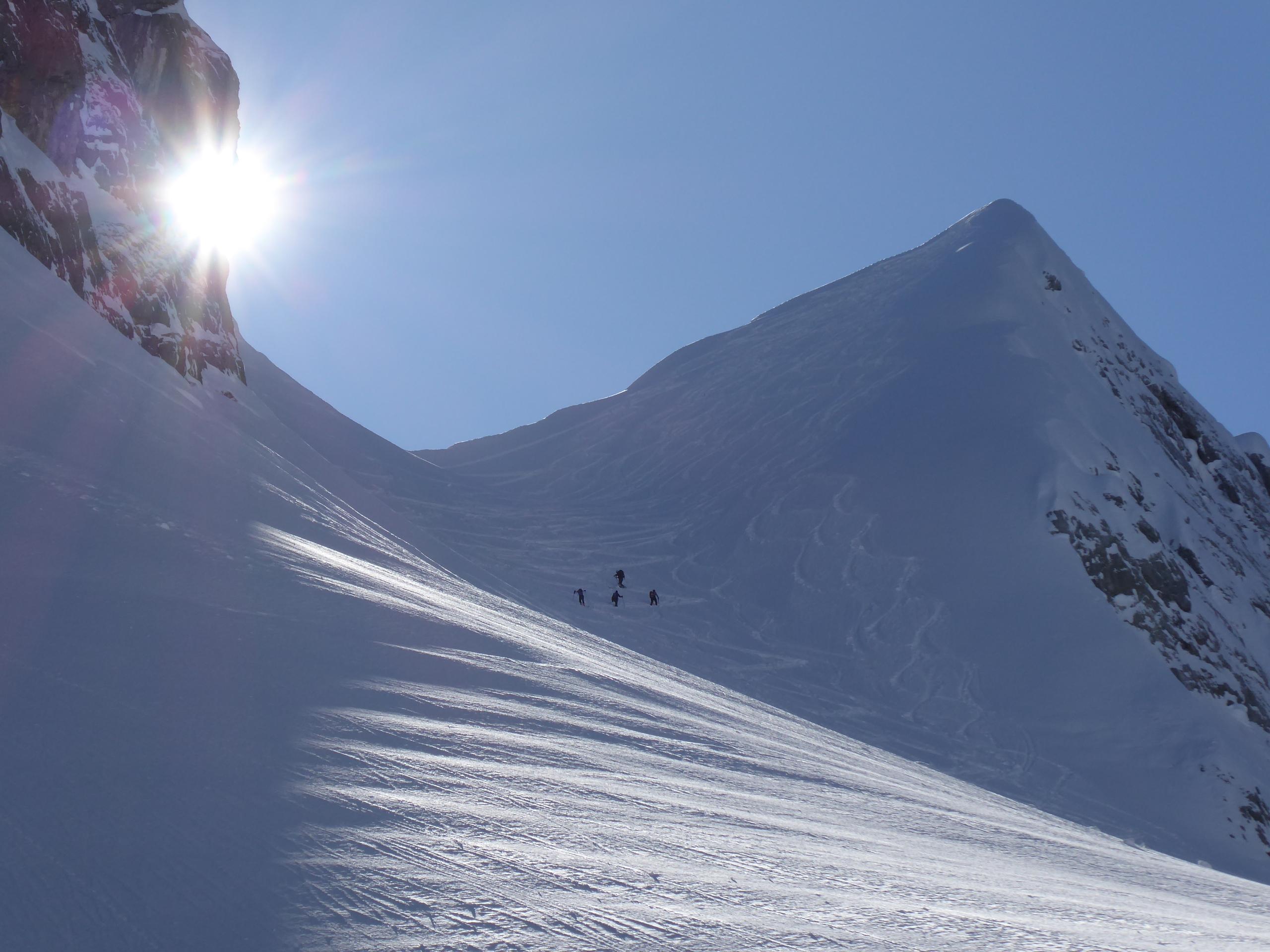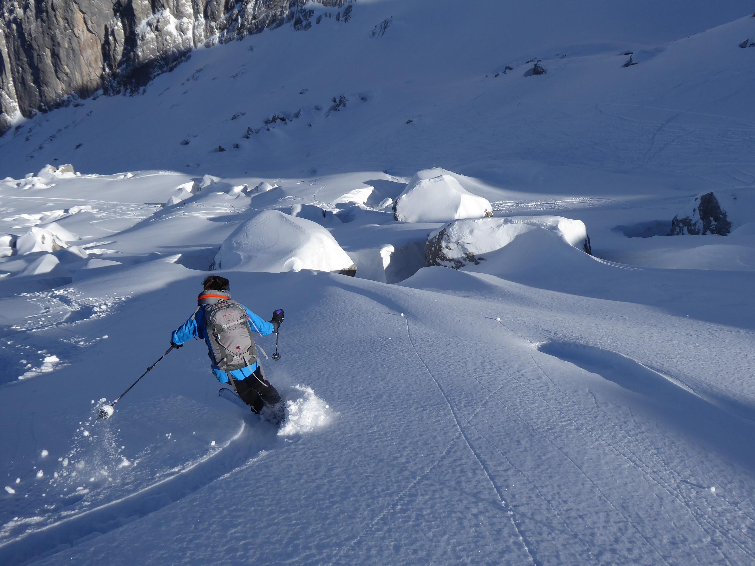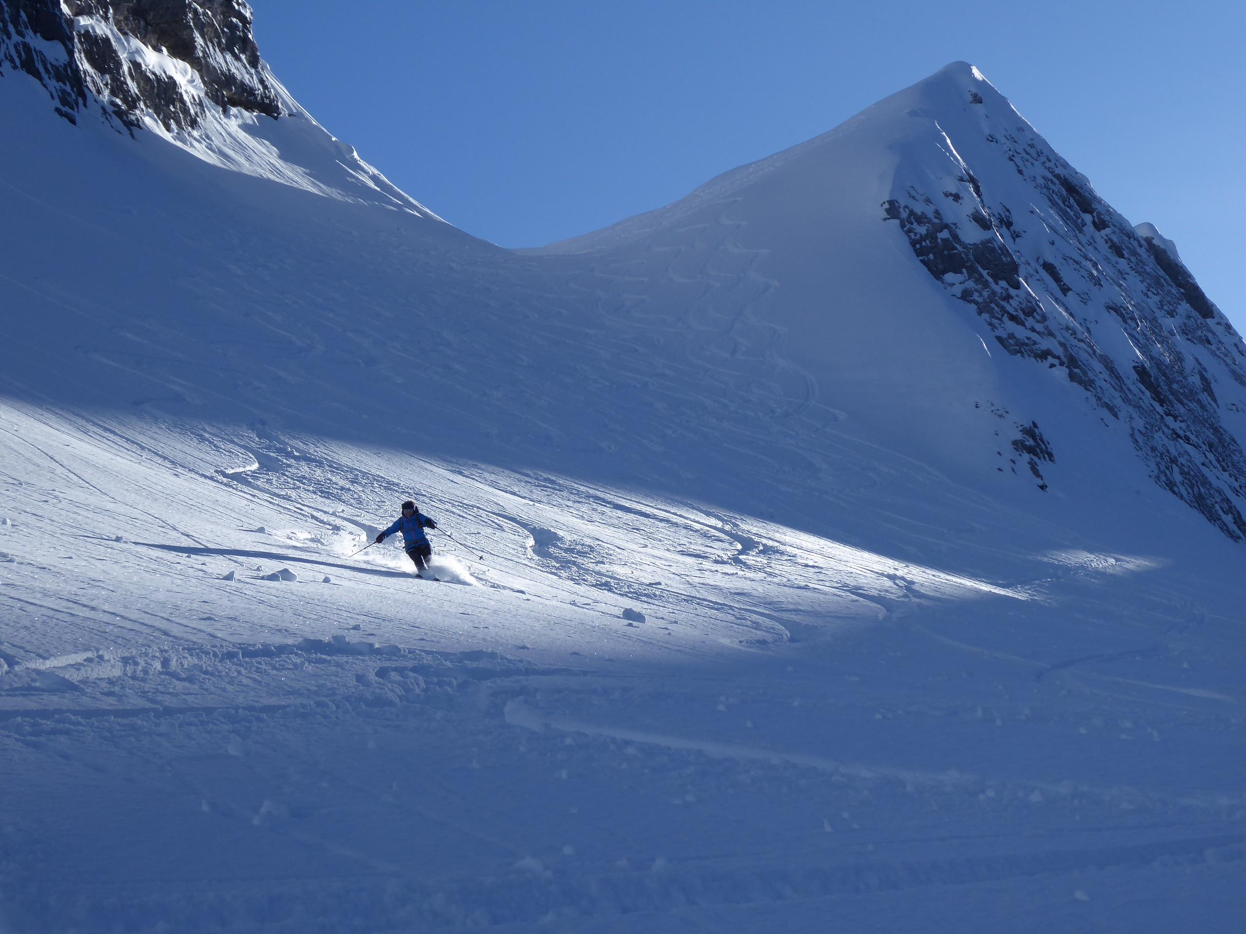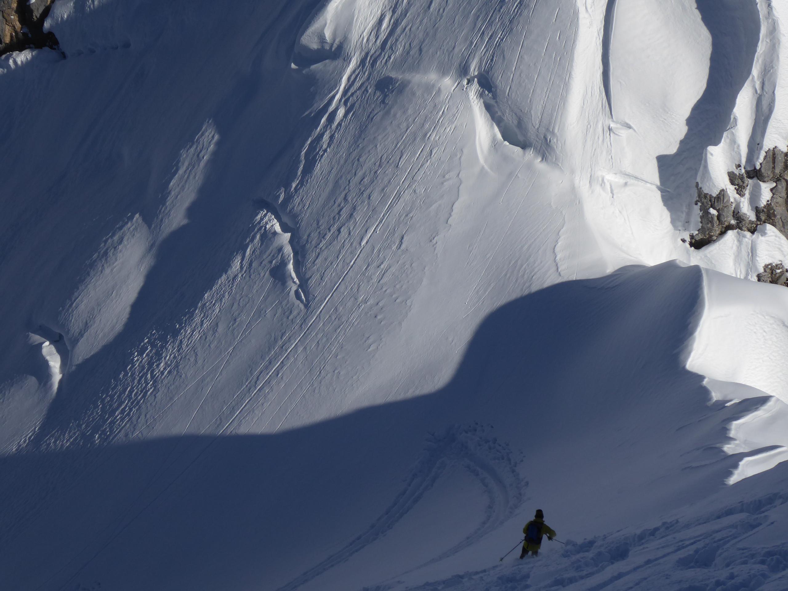 Schnee/Lawinen: Auf der ganzen Tour ca.30cm frischer und noch unverdorbener Pulver auf kompaktem Untergrund. Im abschließenden Steilhang zum 5.Kind sind es bis zu 60cm neu, vom Südföhn am Wochende eingeblasen und vom Weststurm am Montag verdichtet, trotzdem kaum gebunden, außerdem darf man hier wahrscheinlich den "Vielbefahrenes-Gelände-Bonus" in Rechnung stellen. Gleiches gilt auch fürs Skischartl und das 3.Kind. Im obersten Teil, beim Sattel zwischen Jungfrau und 5.Kind allerdings 3 Zerrklüfte übereinander (siehe Foto), sehen aus wie Bergschründe am Gletscherrand, sind aber nichts anderes als Gleitschneemäuler, halb zugeschneit und man bewegt sich die ganze Zeit unter diesen Klüften, also vielleicht doch kein Gelände-Bonus?
