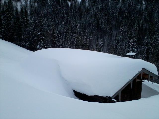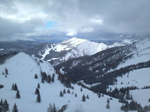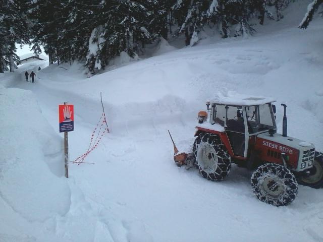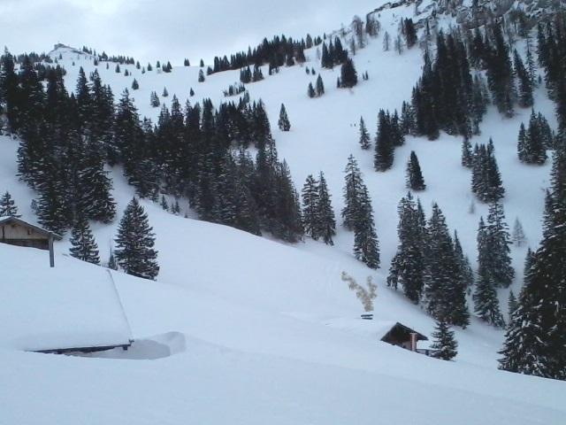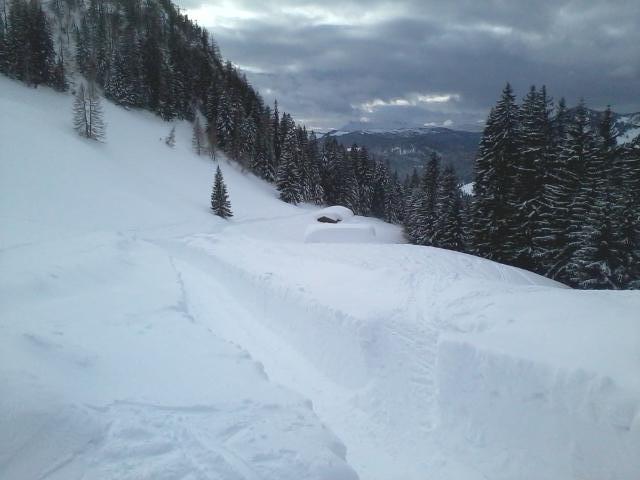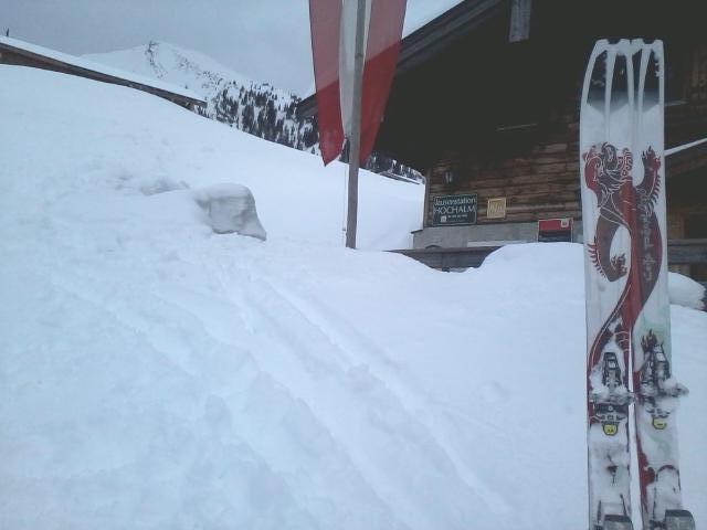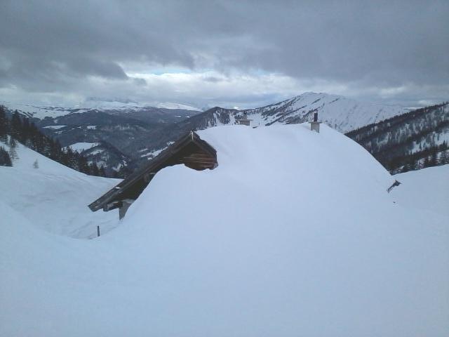 Montagseinsamkeit, Neuschnee >15cm, Hochalm offen. Schon wieder so ein Glückstag. Schneefahnen am SoHo leiten mich um auf´s Peitingköpfl. Da pfeifft´s nicht so stark, aber saukalt ist es trotzdem. Gut für den Schnee, der sich lockerleicht fahren ließ. Der viele Schnee hat die Landschaft enorm verändert. Jetzt verstehe ich auch das Haslinger-Bilderrätsel: eine Megalawine vom Hirscheck/Vorderlahner hat den Erlenwald beim Brückerl herunten vollkommen eliminiert und sich am Gegenhang noch ein paar Meter hinaufgewälzt. Inzwischen schon wieder zugeschneit. Da gibt es jetzt eine ungewohnte Freifläche mit Durchblick zum Hirscheck/Vorderlahnerkopf hinauf. Brückerl auch verschwunden. Am letzten Gipfelaufschwung sind alle Felsen im Schnee untergegangen. Die Tür zur Hochalm hingegen ist wieder aufgegangen - die wackeren Wirtsleute haben sich mühsam zu den Biervorräten durchgefräst. Die Rodelbahn haben sie fleissig fast bis zur Trostberger Hütte freigefräst mit meterhohen Banden links und rechts - jawohl, wir sind Winter ;-) Nachmittags gab es die prophezeiten Aufhellungen, grade recht für die Erkundung des neuen Tourenlehrpfades an der Wildalm gegenüber.