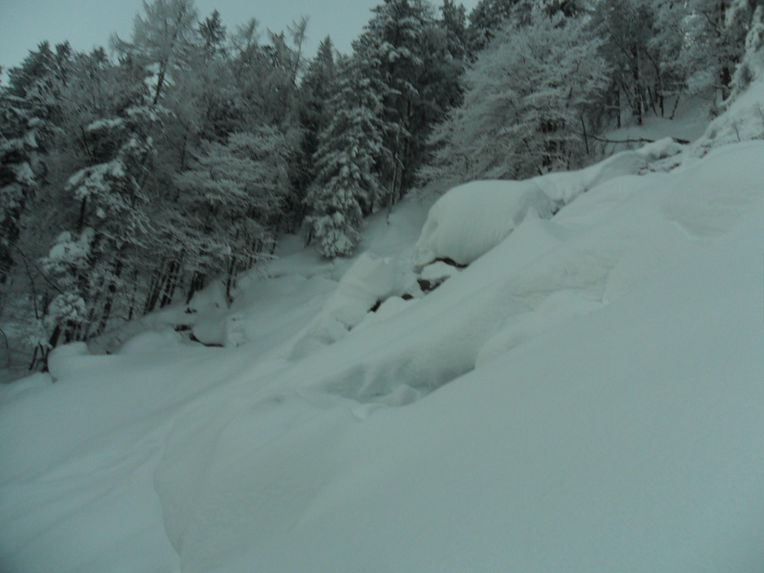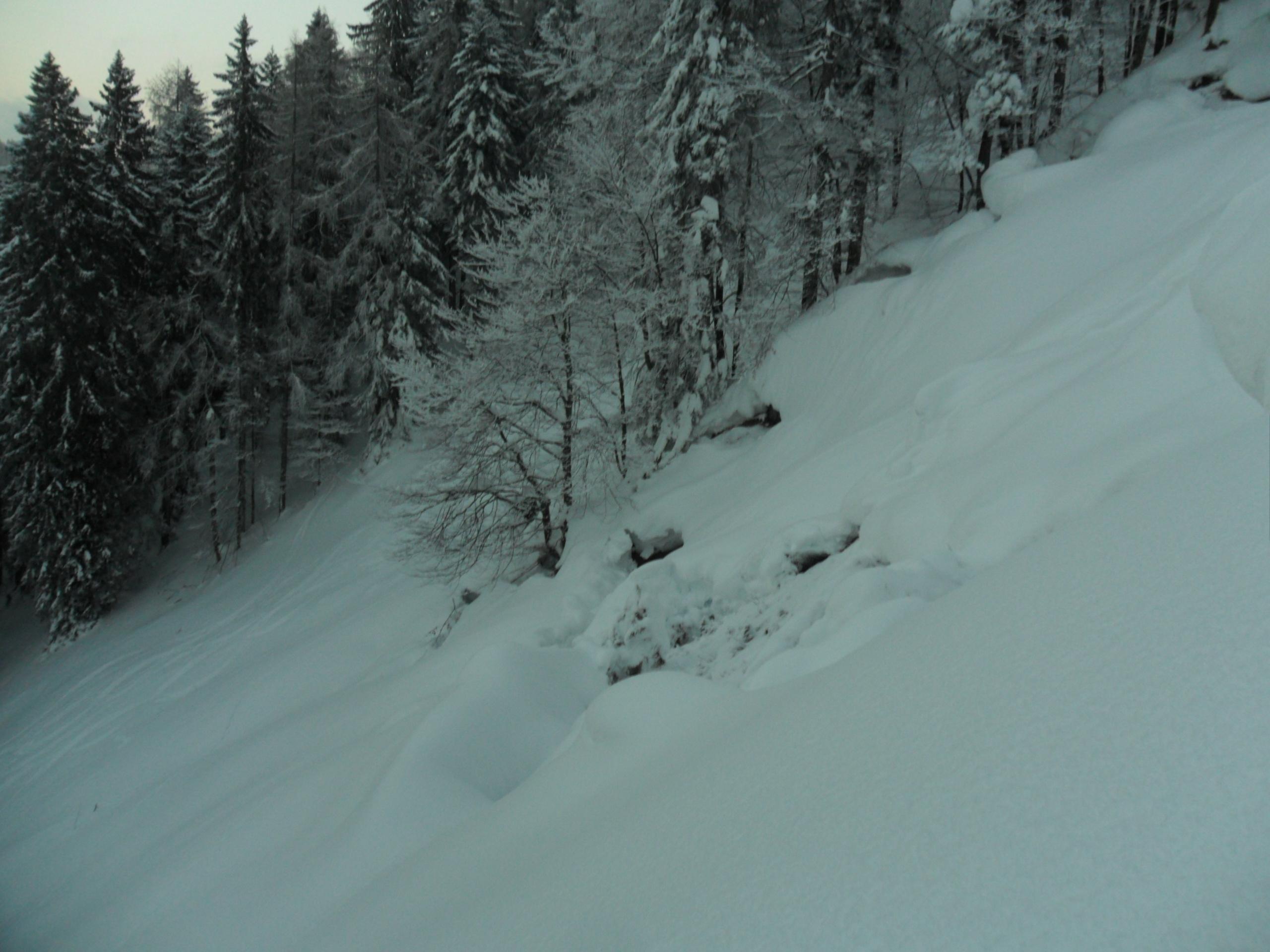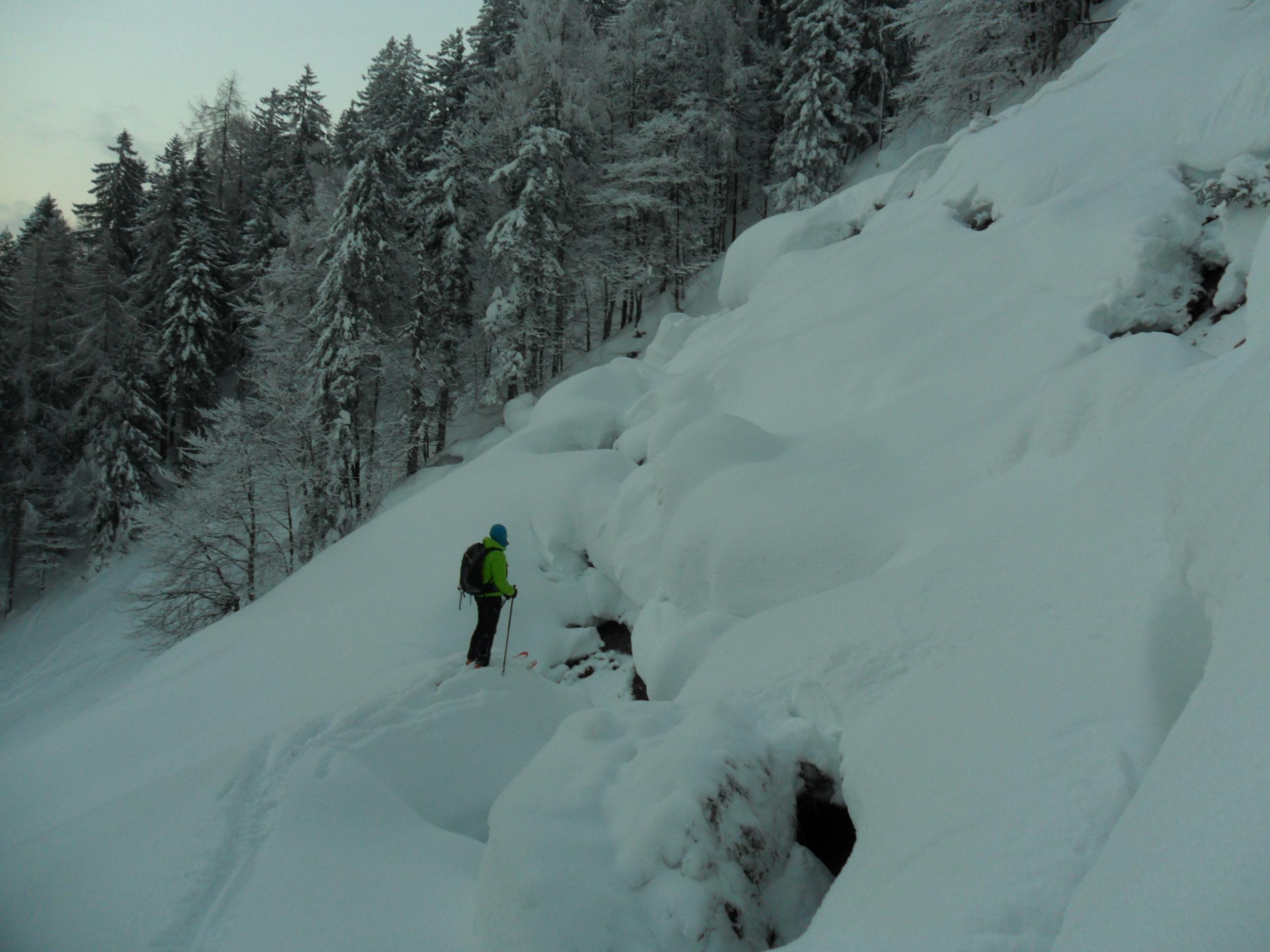 Start gegen 15 Uhr. Ziel war ein licht bis dicht bewaldeter Nordhang. Durch den Schneefall tagsüber hatten wir dort optimale Bedingungen. 15 - 25 cm feinsten Pulver. Nach unten hin ein bisschen weniger. Warum ich aber diesen Bericht schreibe ist wegen den imposanten Fischmäulern, die wir im Wald vorgefunden haben. Teilweise hatte man das Gefühl, man fährt durch einen Gletscherbruch. Zwischen den Spalten immer wieder Schneebrücken, über die man vorsichtig fahren konnte. Eine coole Abfahrt, die richtig Spass gemacht hat.