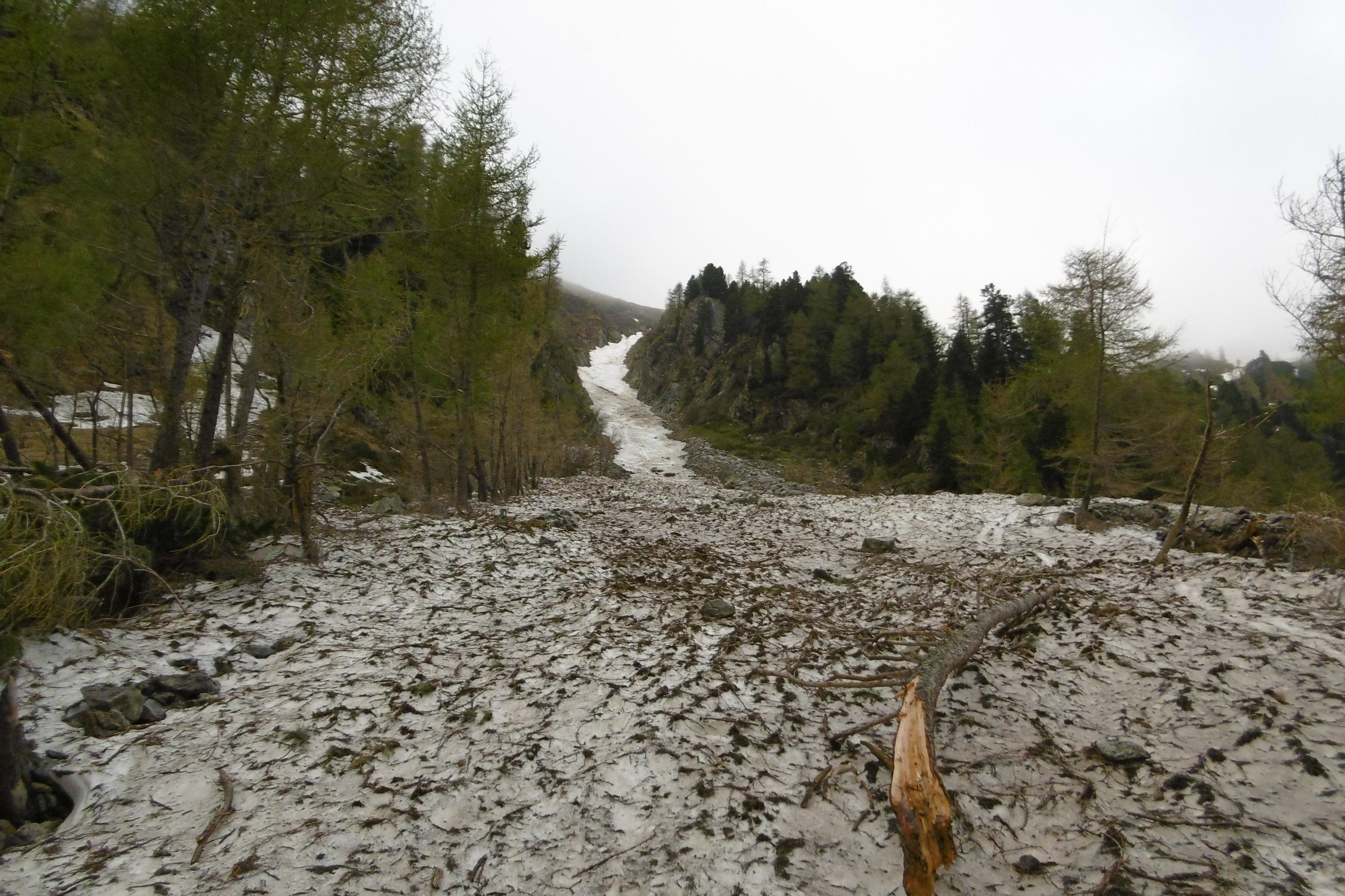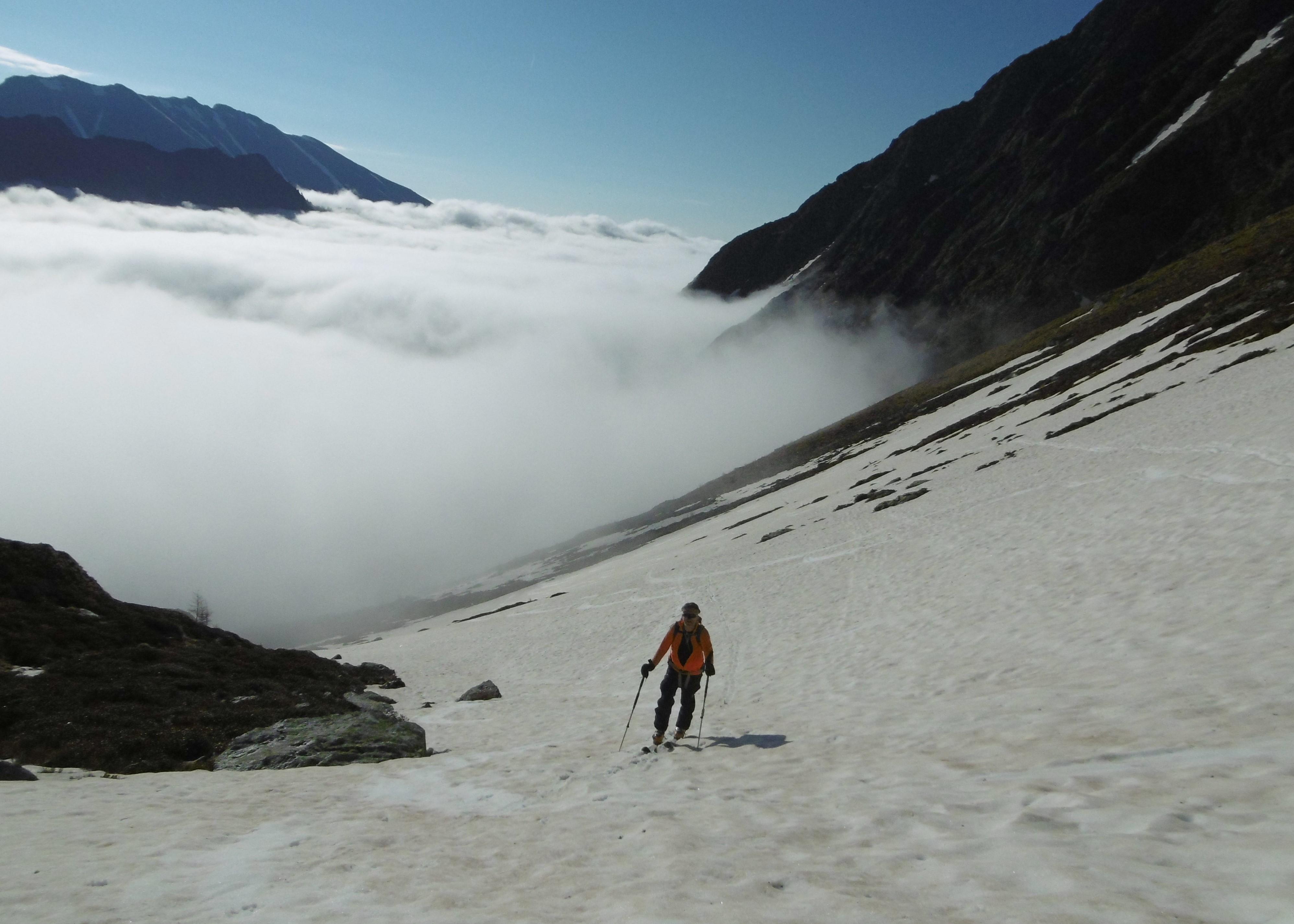 Nach 30 hm kann man die Ski anschnallen. Kurze Unterbrechungsstelle für weitere 30 hm am Ende des mit Lawinenschnee vom Preber gefüllten Ölaschengrabens.
