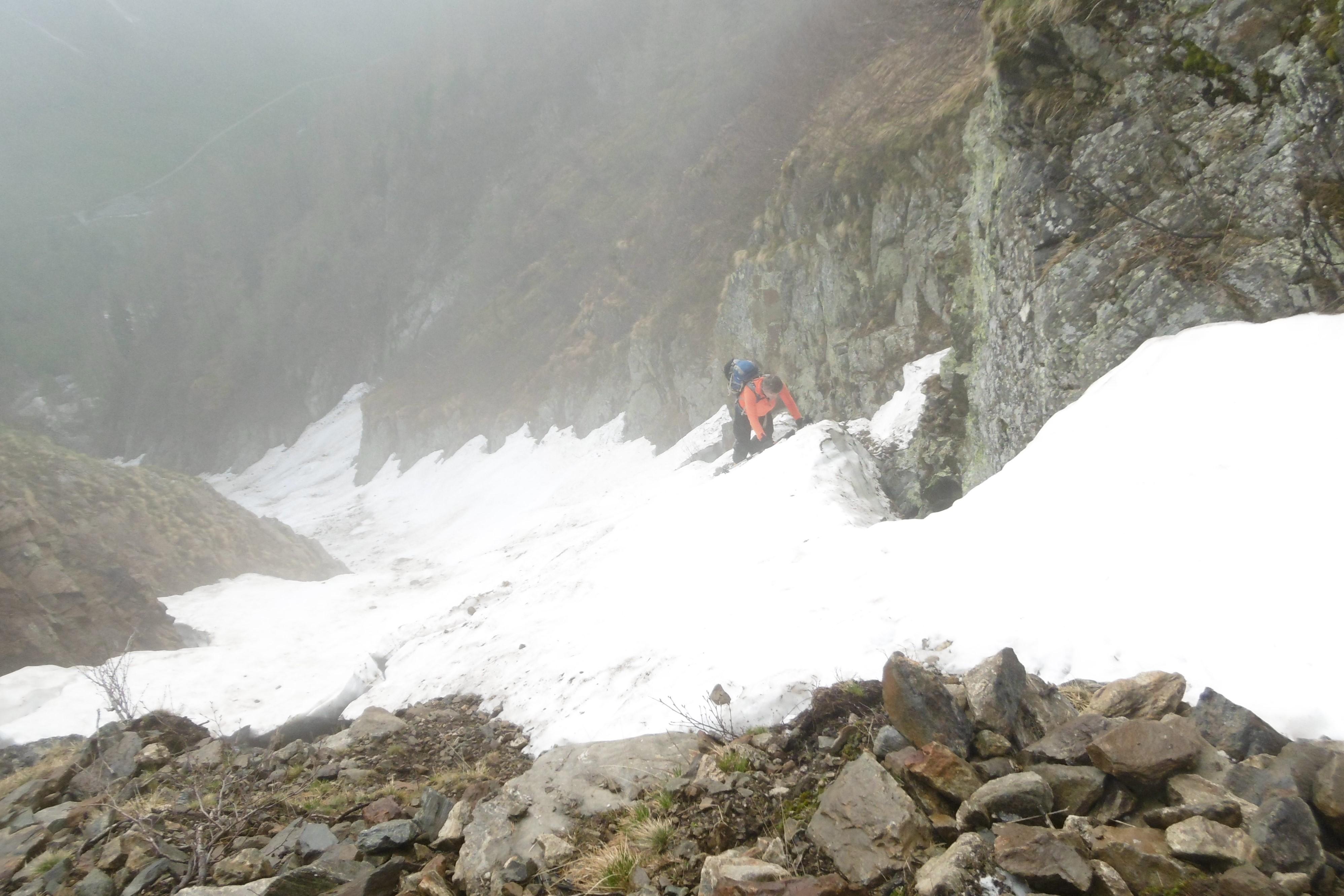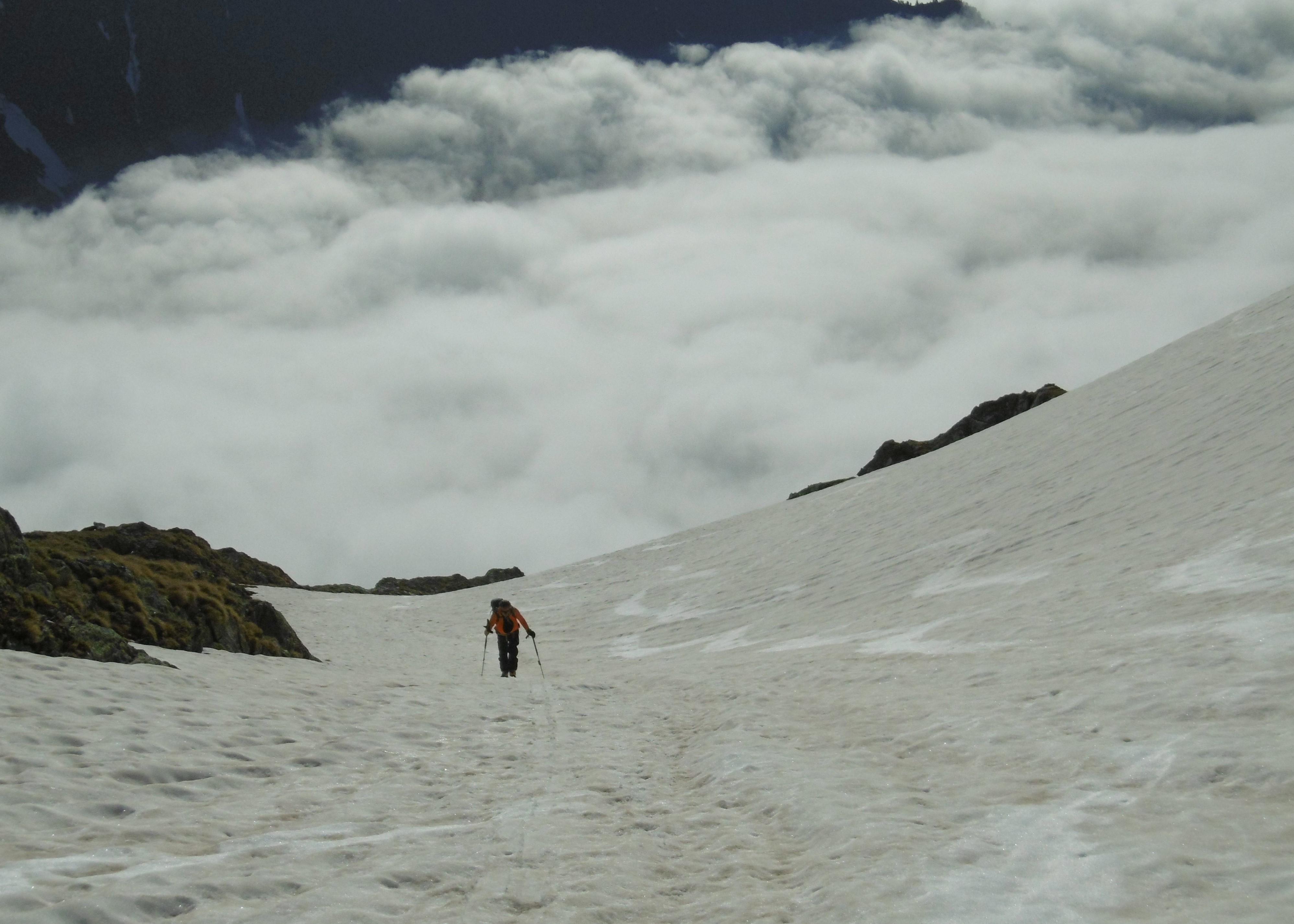 Auch im Moarkar herllich kompakter Schnee bis rauf in den Sattel zwischen Barbaraspitze und Roteck. Gipfelgrat zum Roteck ziemlich gut ausgeappert.
