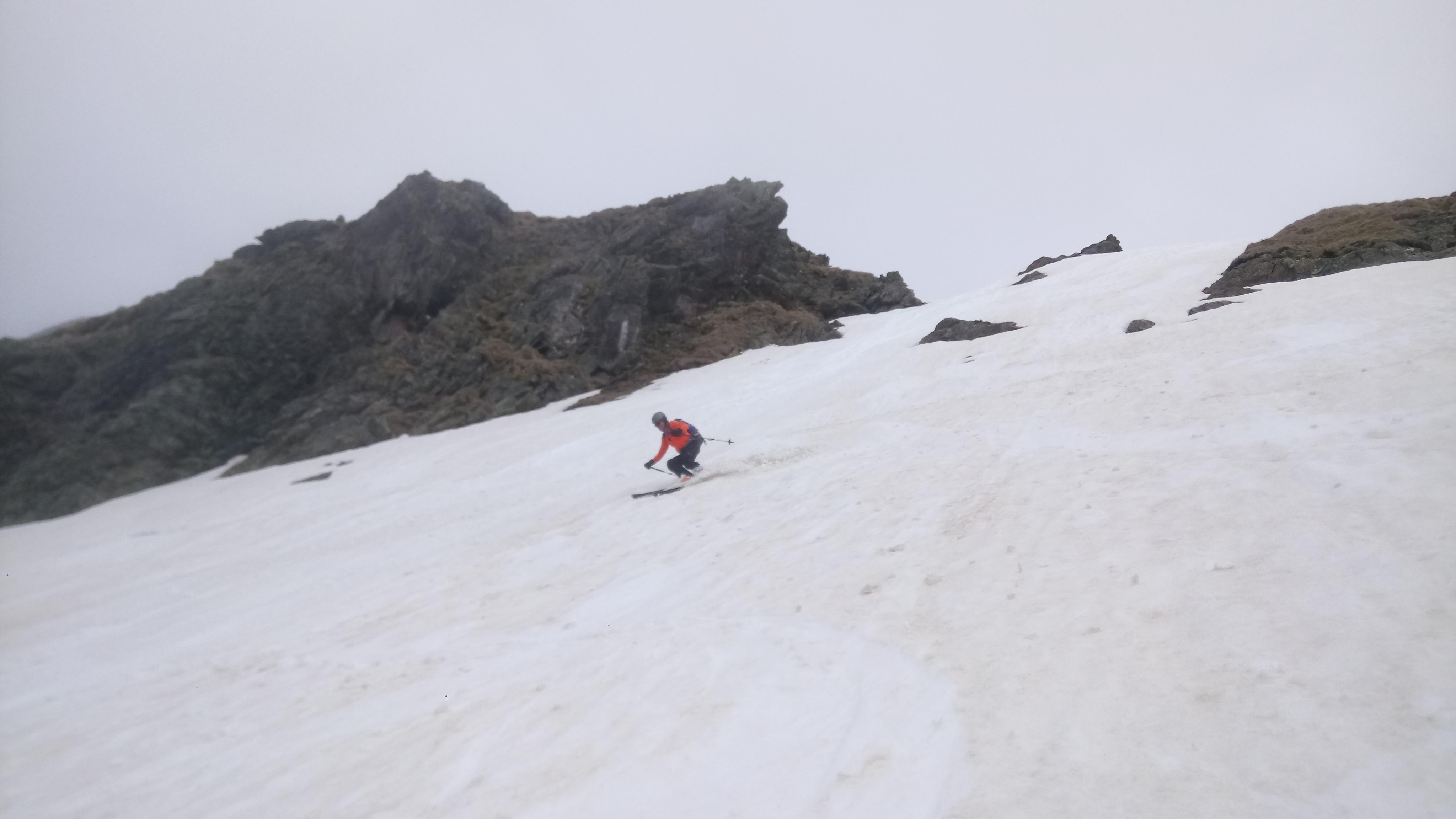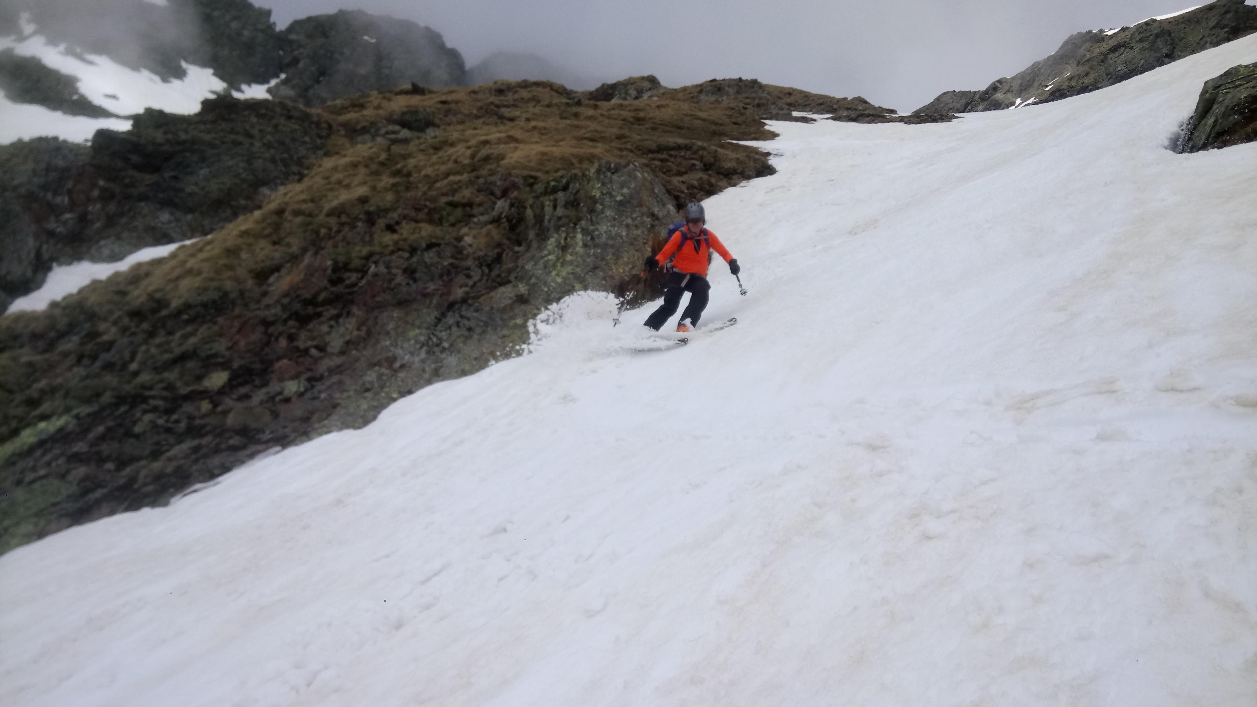 Heute war auch die direkte Einfahrt ins Moarkar möglich. Feinster Sommerfirn bis zum Öllaschengraben.