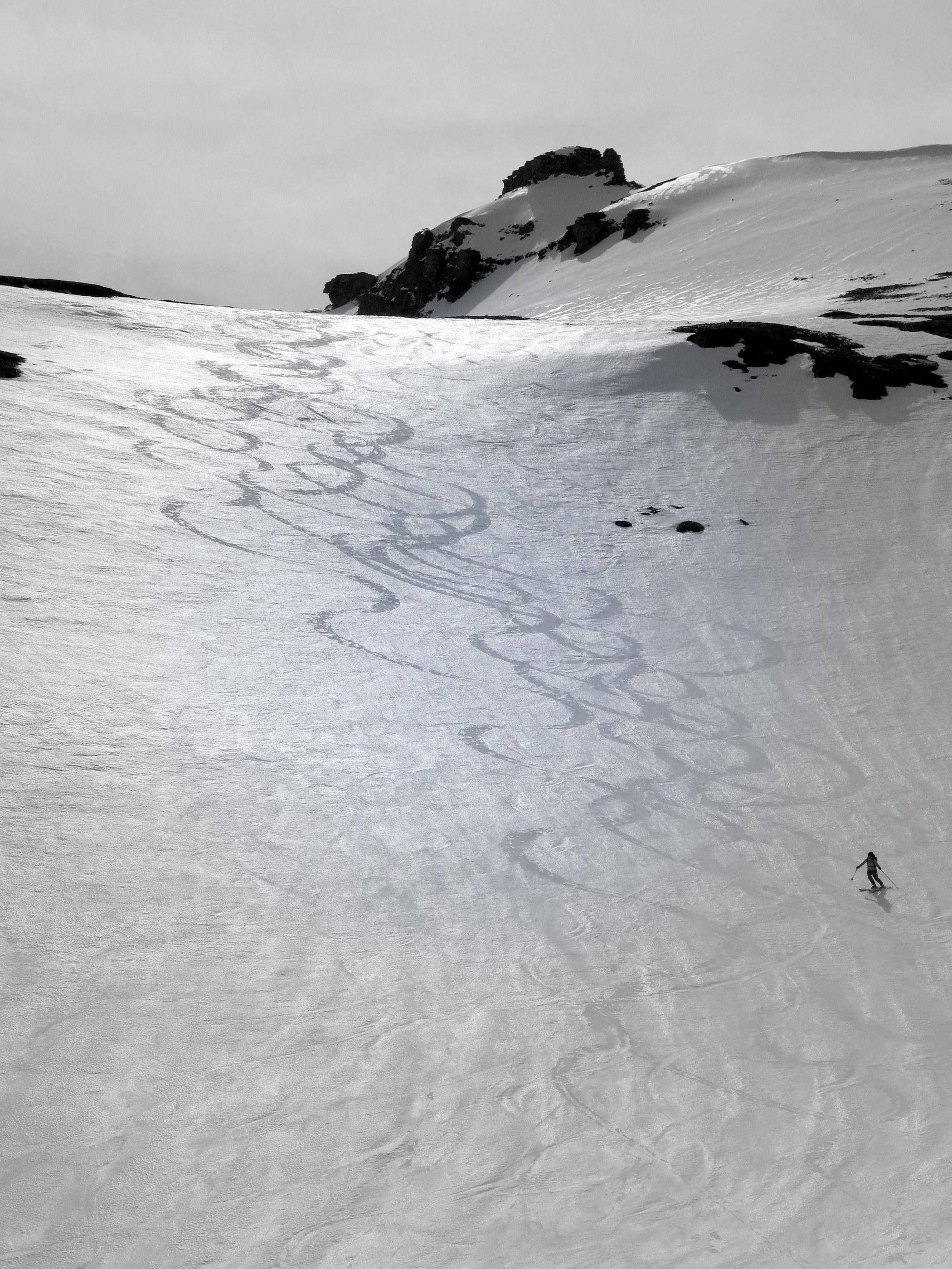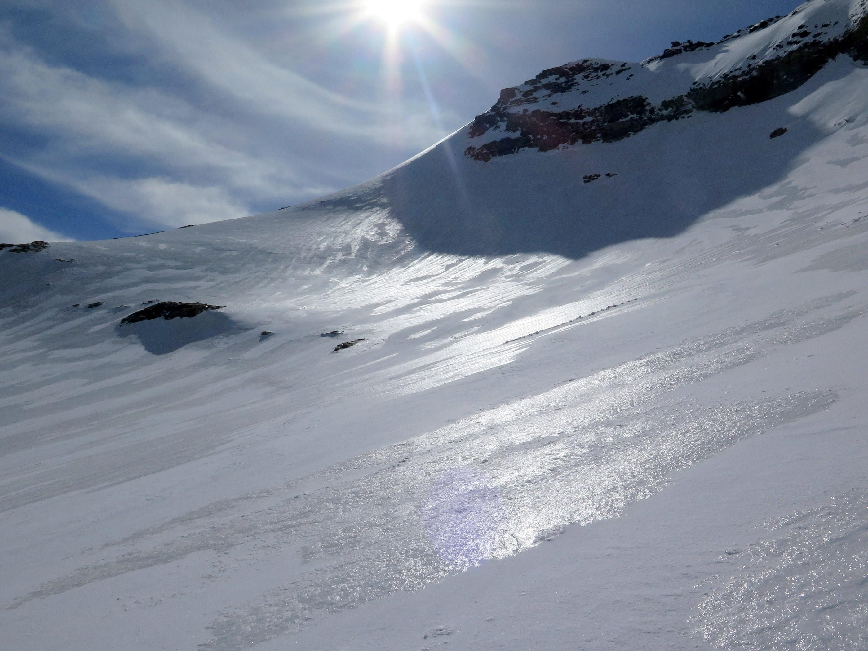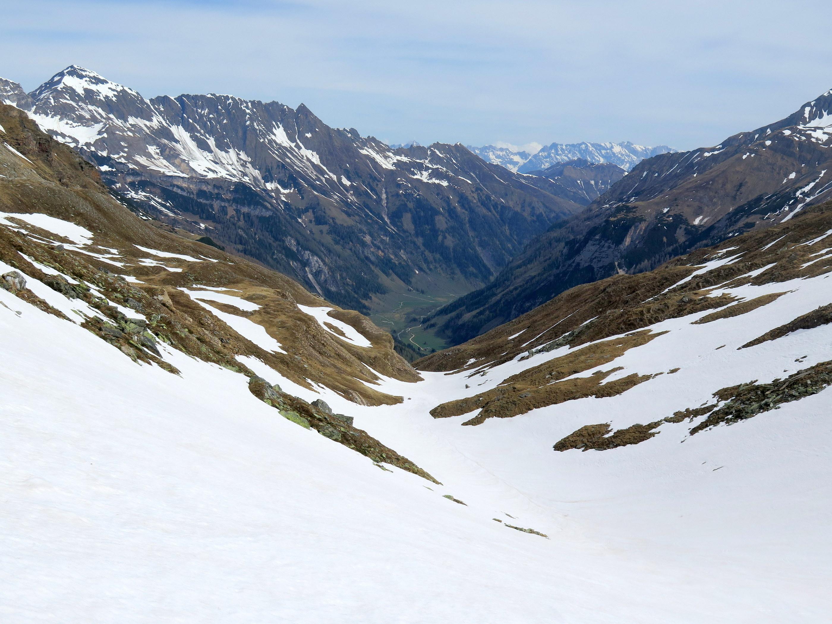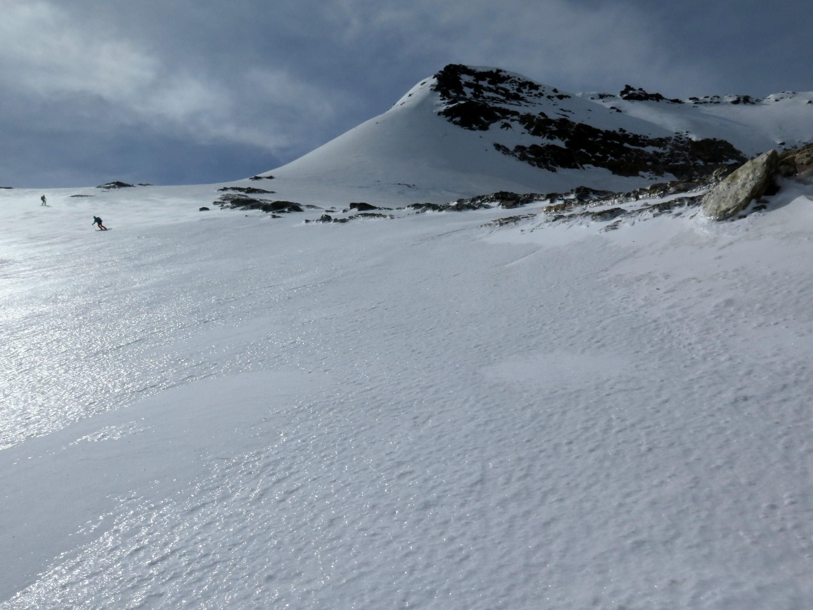 Bei der Auffahrt auf der Glocknerstraße sind Kloben und Brennkogel um kurz nach sieben noch in Wolken, lebhafter S-Wind treibt die Staubewölkung an den Alpenhauptkamm. Kurzfristig ändern wir beim Elendboden unsere Pläne und starten nun vom Hochtor aus in Richtung Modereck, weil dort zumindest durchgehend freie Sicht herrscht. Die Schneelage bis zur Weißenbachscharte ist schlichtwegs erschütternd, wir wandern abschnittweise "trockenen Fußes" am gut geschotterten Klagenfurter Höhenweg. Die Hänge hinauf zum Modereck glänzen verräterisch - eine eisige Oberfläche erinnert an die letzten Niederschläge, die bis über 2800 m hinauf als Regen gefallen sein müssen. Angesichts der wenig einladenden Verhältnisse verzichten wir auf den geplanten Gipfel neben dem Ht. Modereck und suchen erfolgreich eine noch durchgehend schneebedeckte Einfahrt in die oberste Weißenbachrinne, wo sich nach einer veritablen Gratis-Fußmassage auf dem eisig-schattigen Einfahrtshang zumindest auf der sonnigen Seite gegenüber schon so etwas wie Firn finden lässt. Wir fahren bis etwa 2150 m ab und freuen uns dabei am immer feiner werdenden "Firn-Schmieren". Leider zieht es zwischenzeitlich immer mehr zu, sodass wir auf eine weitere Abfahrt verzichten, und steigen wieder in Richtung Weißenbachscharte auf - teilweise ein Feeling, als wären wir zu Testzwecken im Windkanal! Bis wir wieder am Klagenfurter Jubiläumsweg sind, heißt es noch mehrmals Ski aus - Ski an, um die ausgeaperten Stellen zu passieren. Am Weg zum Hochtor zurück zieht die Wokendecke völlig zu - und auch die Föhnlücke im Norden ist mittlerweile fast ganz geschlossen. Na ja - immerhin ist heute der "Tag der Arbeit" - und nicht vorrangig des Vergnügens ...